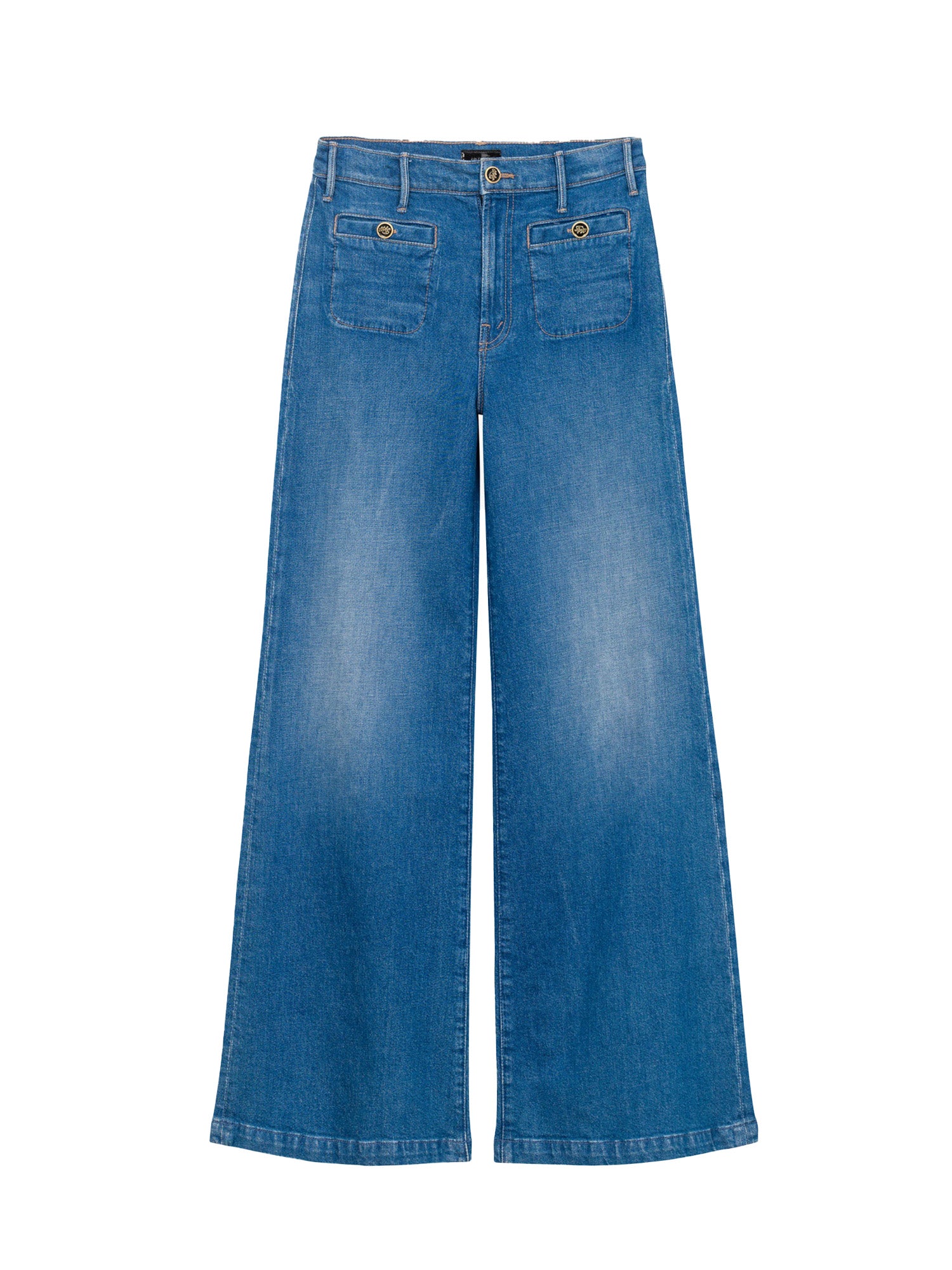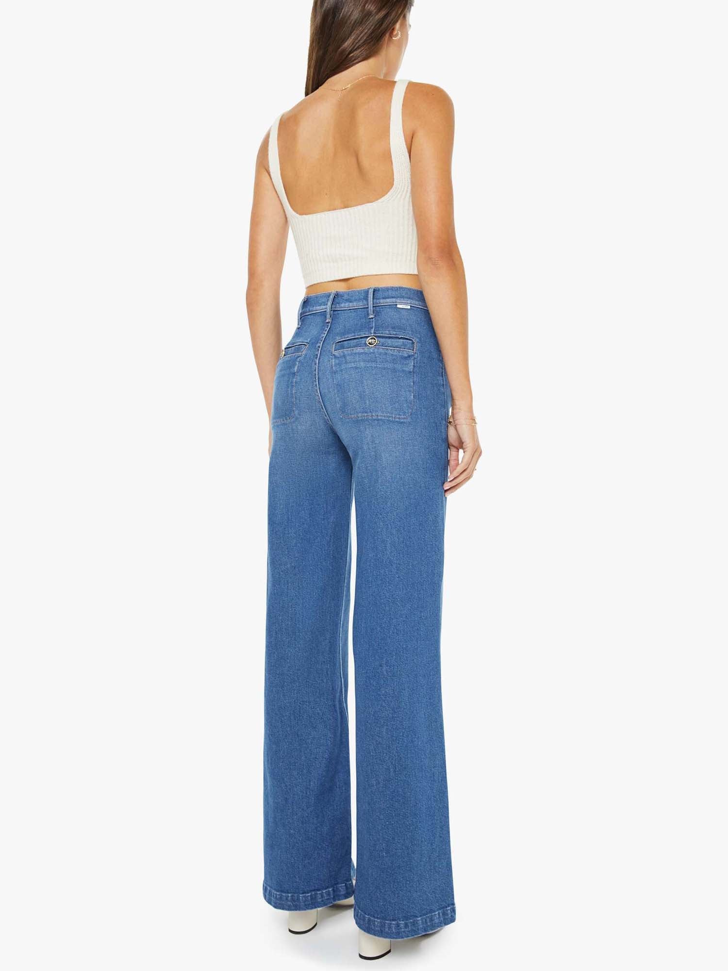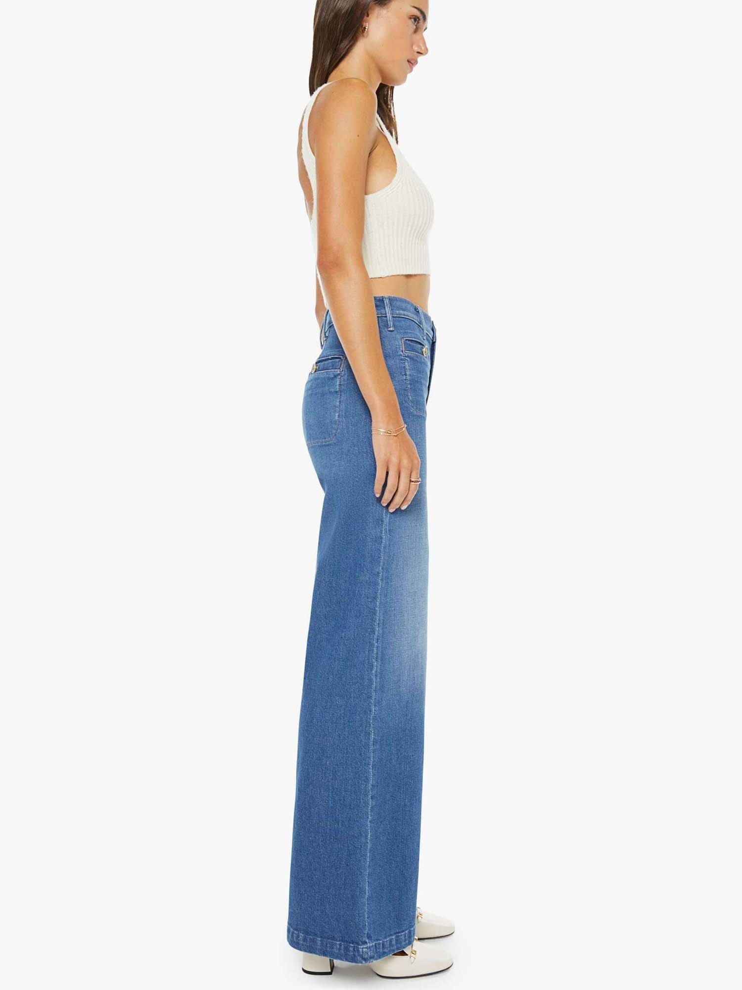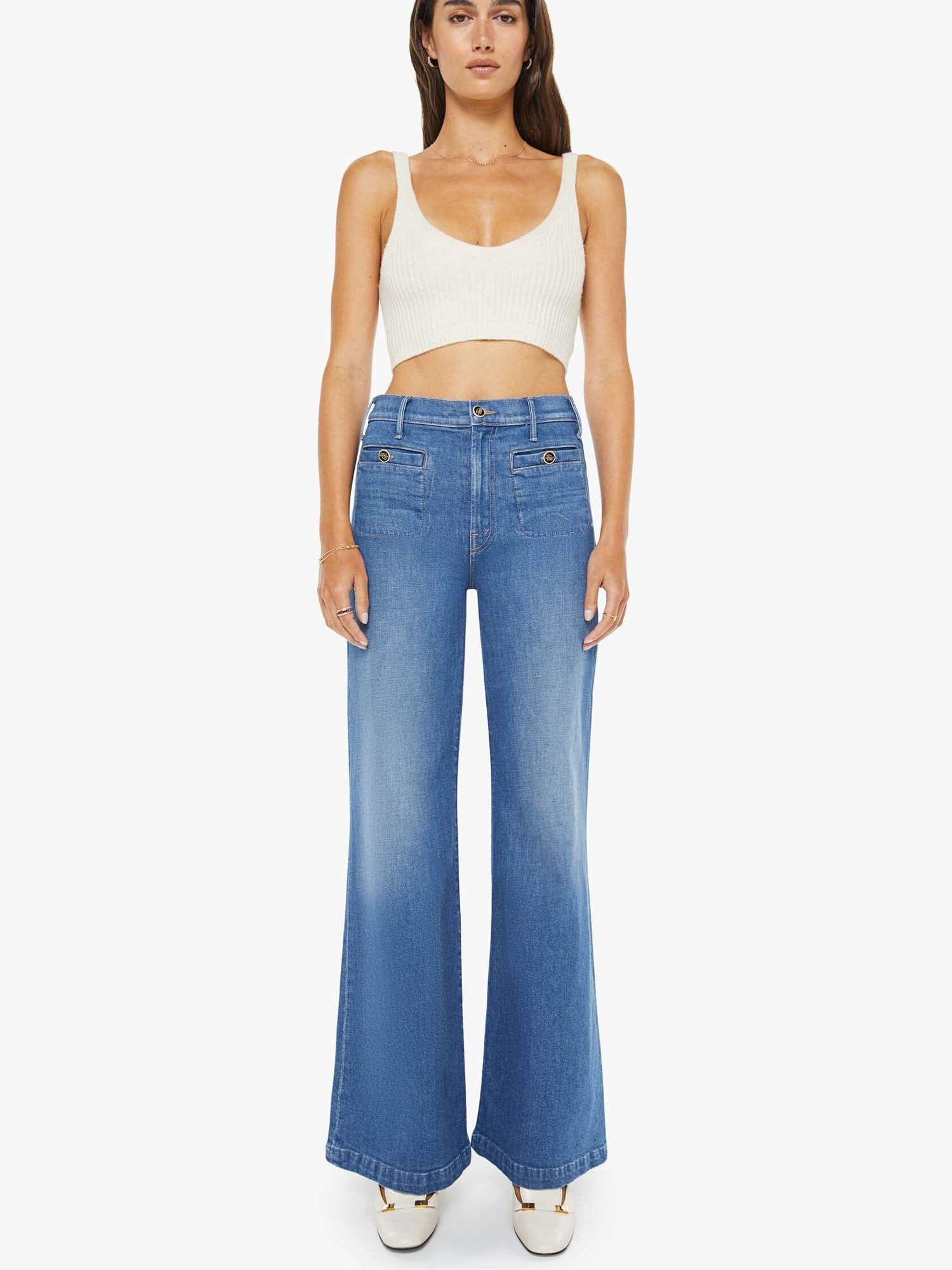 Mix it up. 70s-inspired wide leg jeans with a high rise, zip fly, slit pockets, enamel buttons, a 32-inch inseam and a clean hem. Made from a blend of recycled stretch denim, Whisk Me Away is a mid-blue with subtle fading throughout.