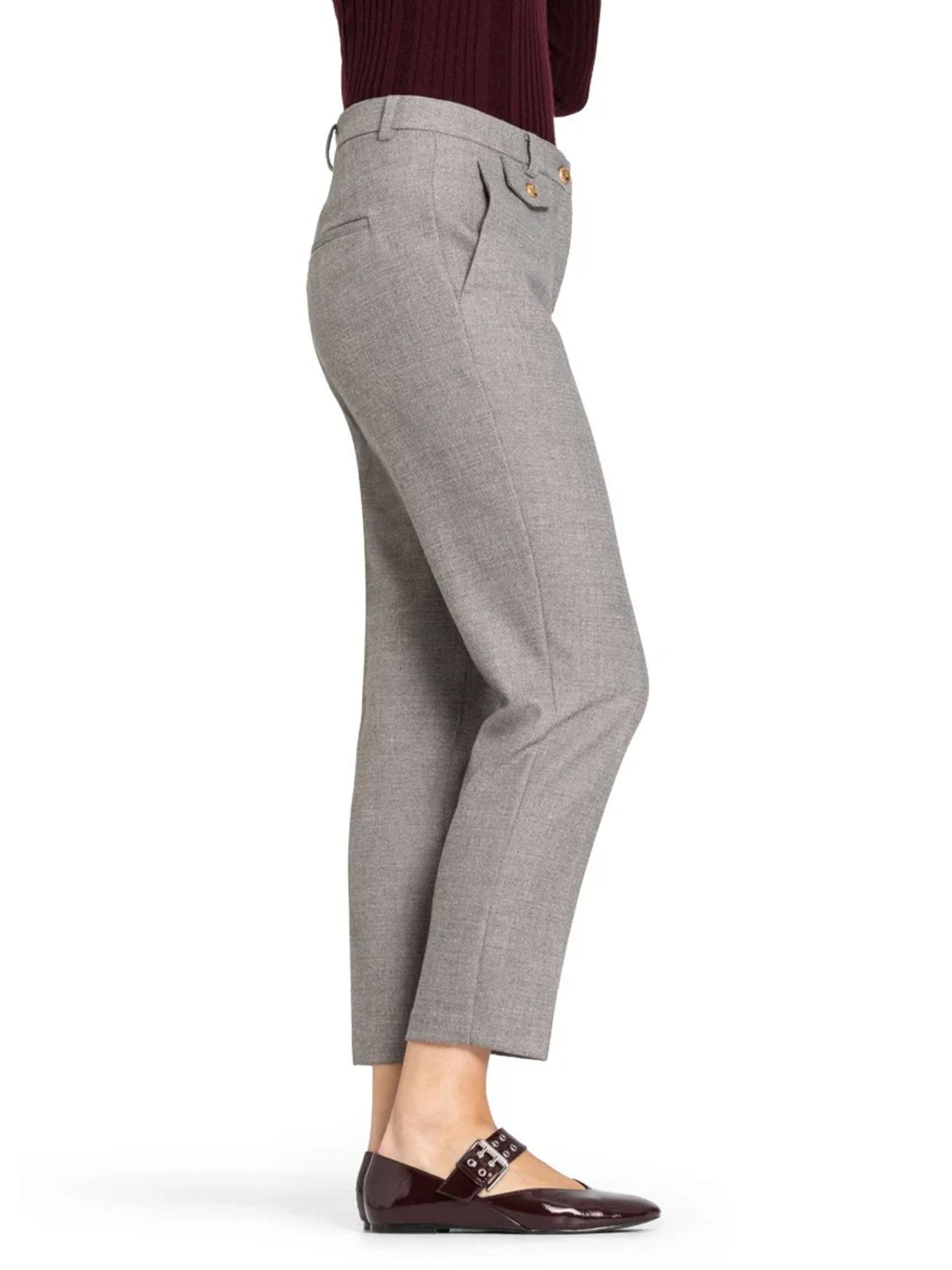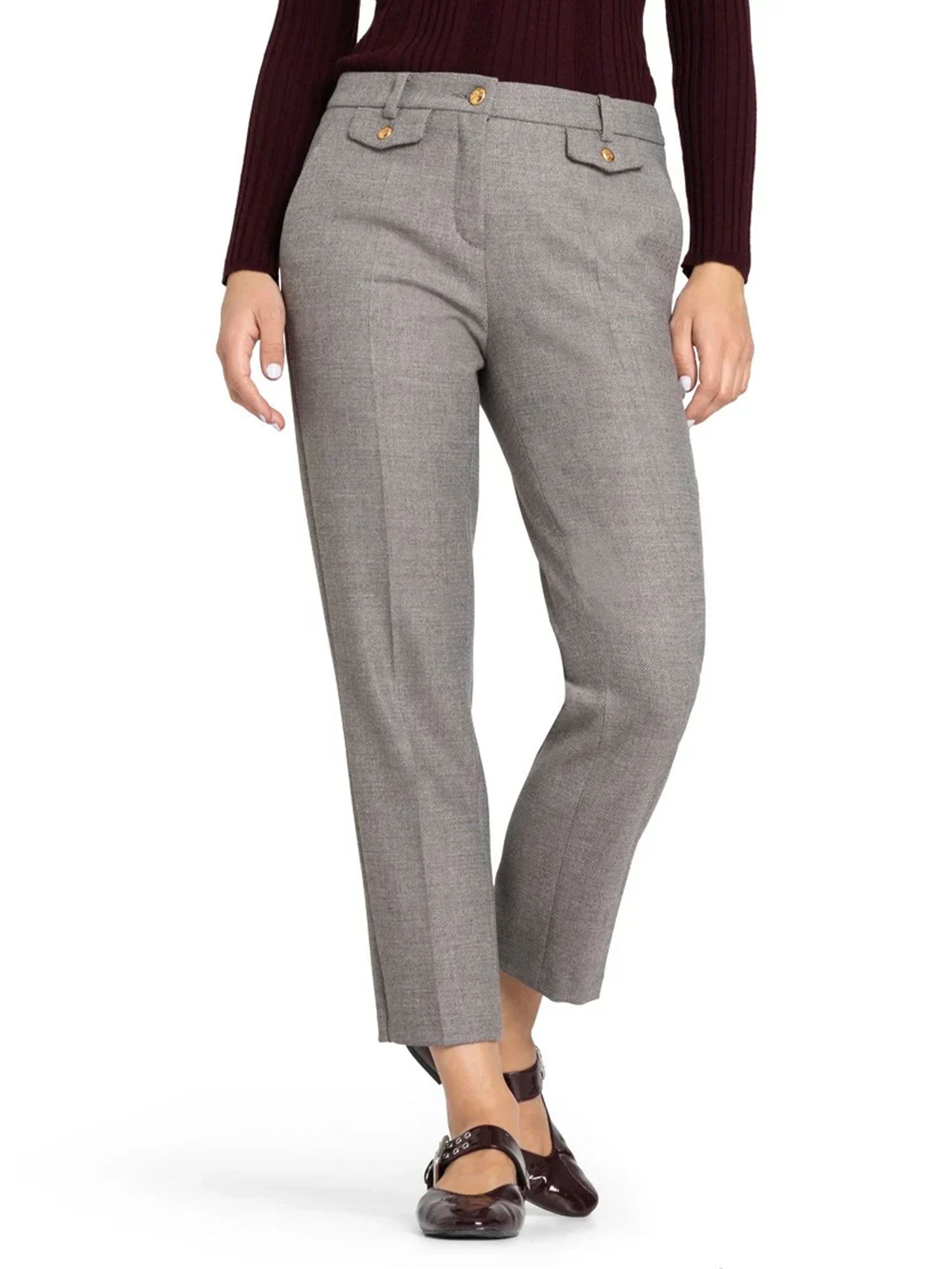 Tailored with refined precision, the Krystal Flap Pant features a slim ankle-length cut with pressed creases for a sharp silhouette. Gold-tone buttoned flap accents at the waistband elevate its design, while belt loops and welt pockets add versatility. Perfect balance of modern elegance and timeless detail.