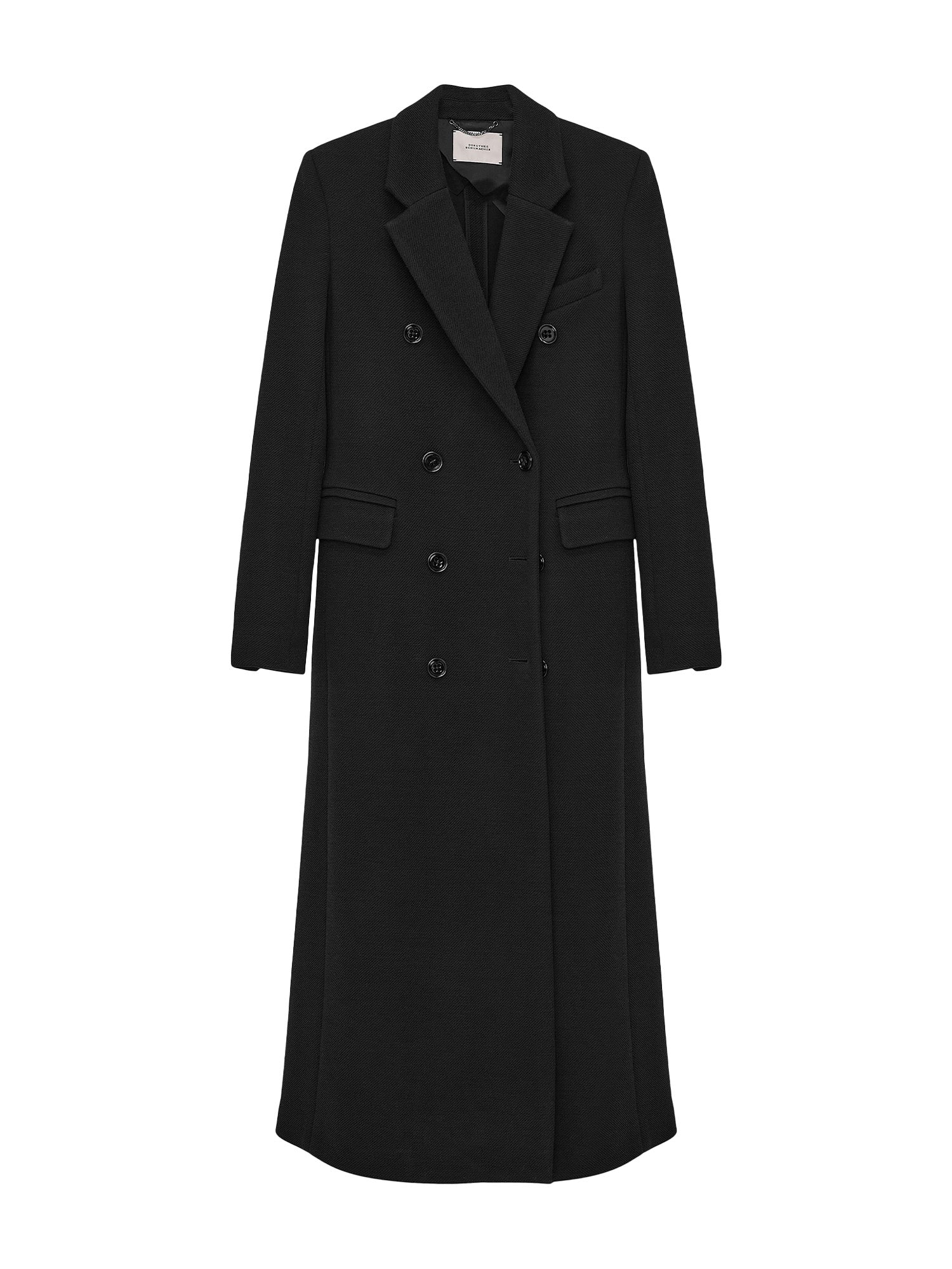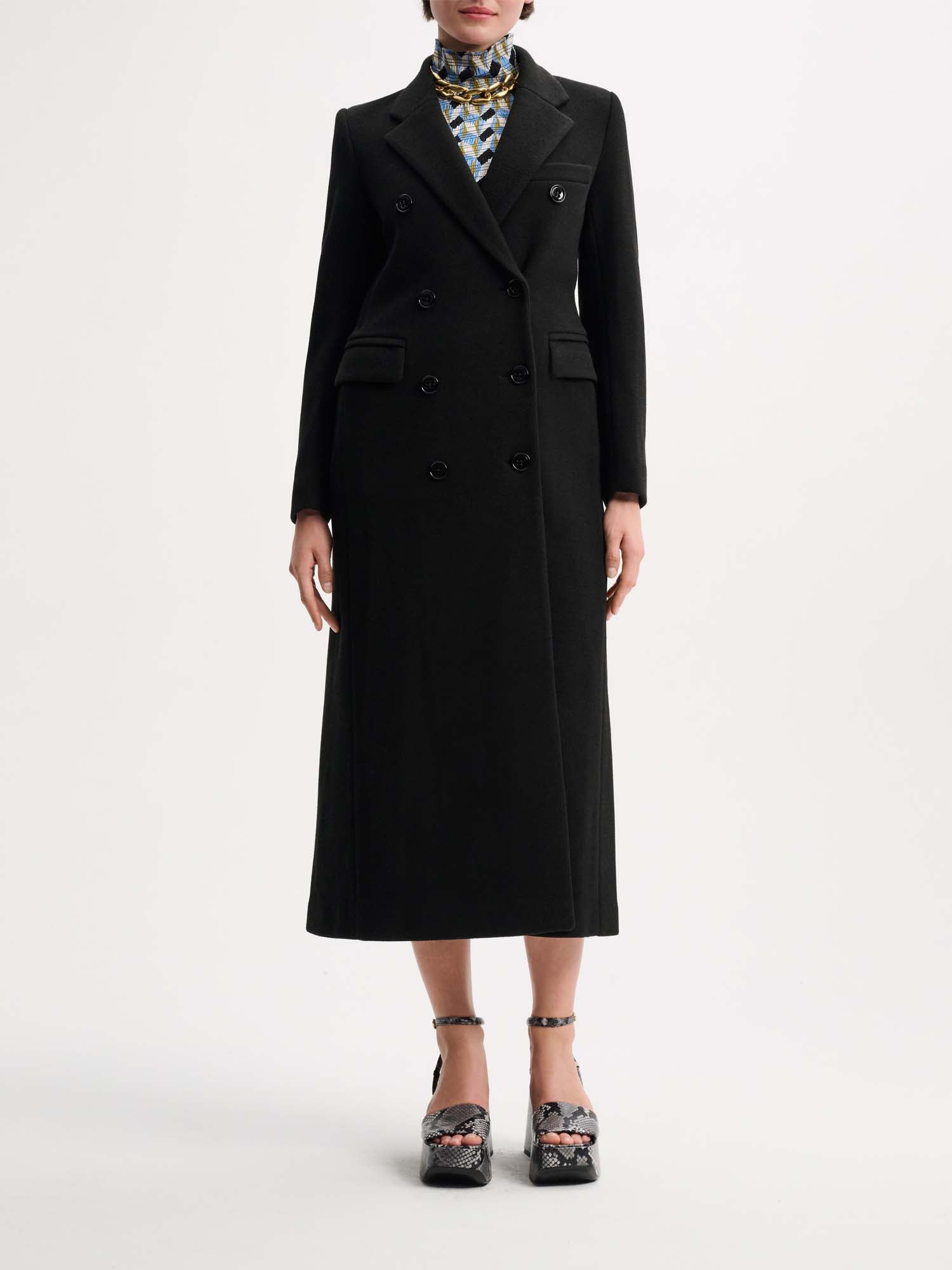 The wool mix coat is defined by its sharp tailoring and extra long length. The timeless classic silhouette is fitted and looks equally elegant styled over dresses and denim alike.