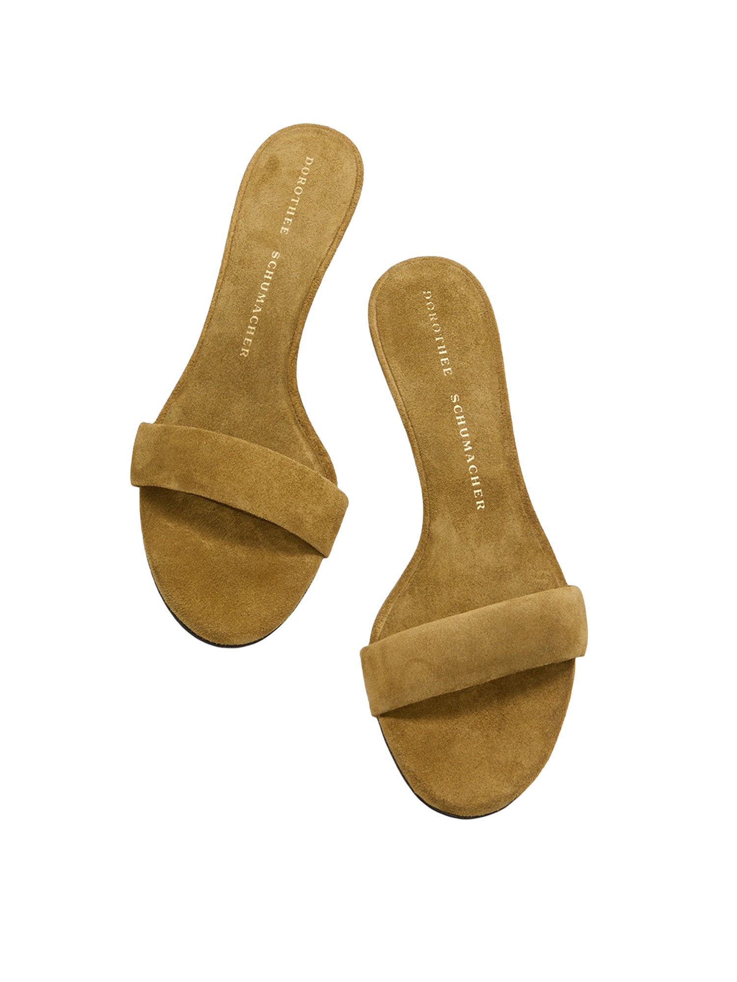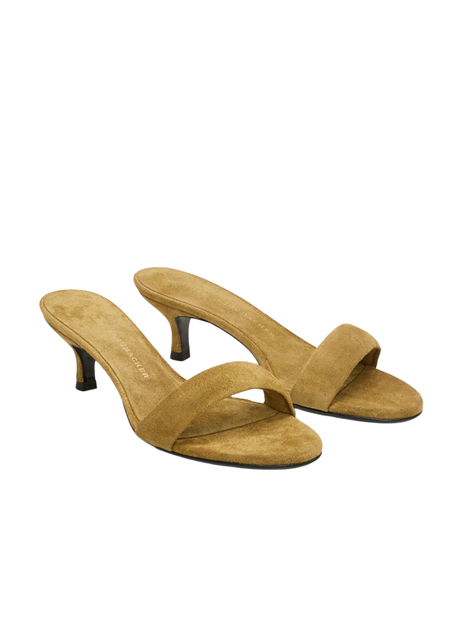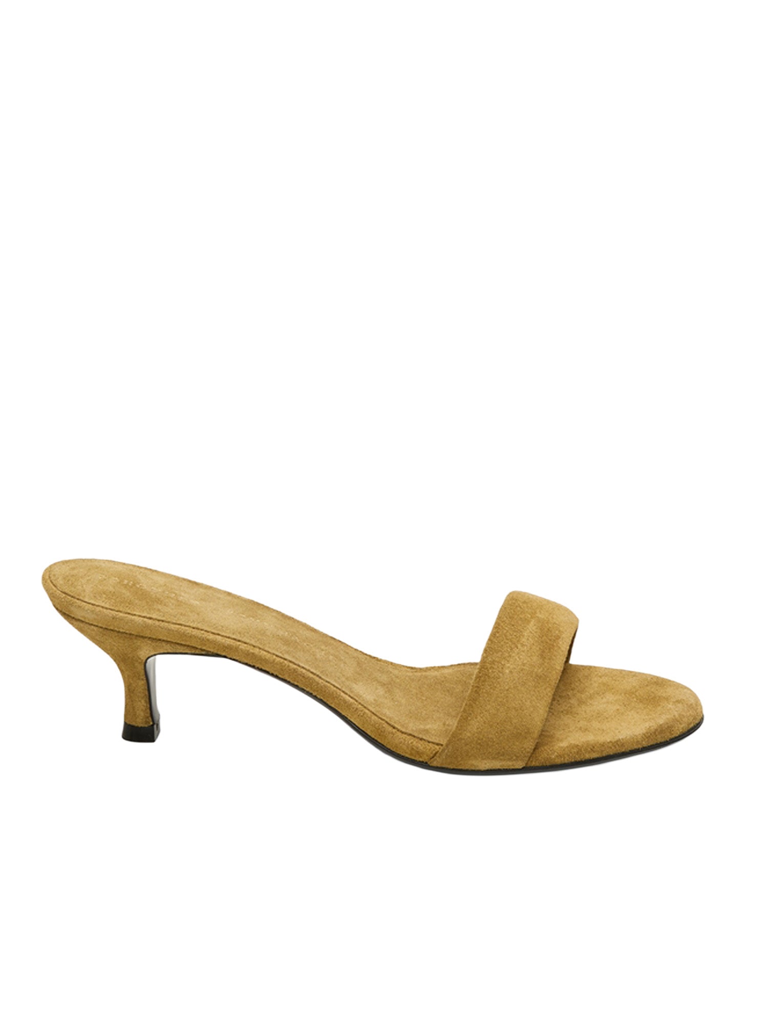 Kitten heel suede slides with padded strap.
