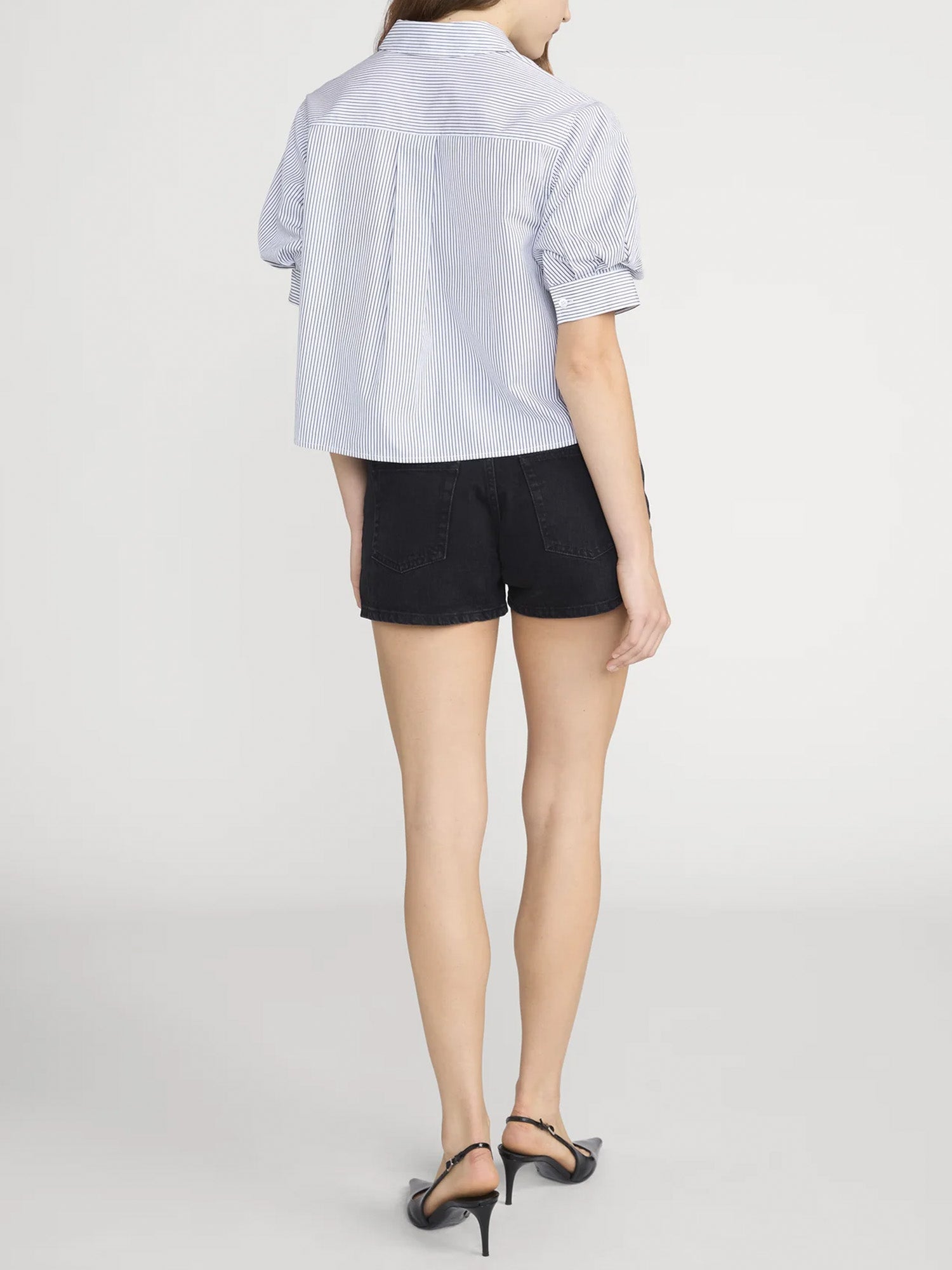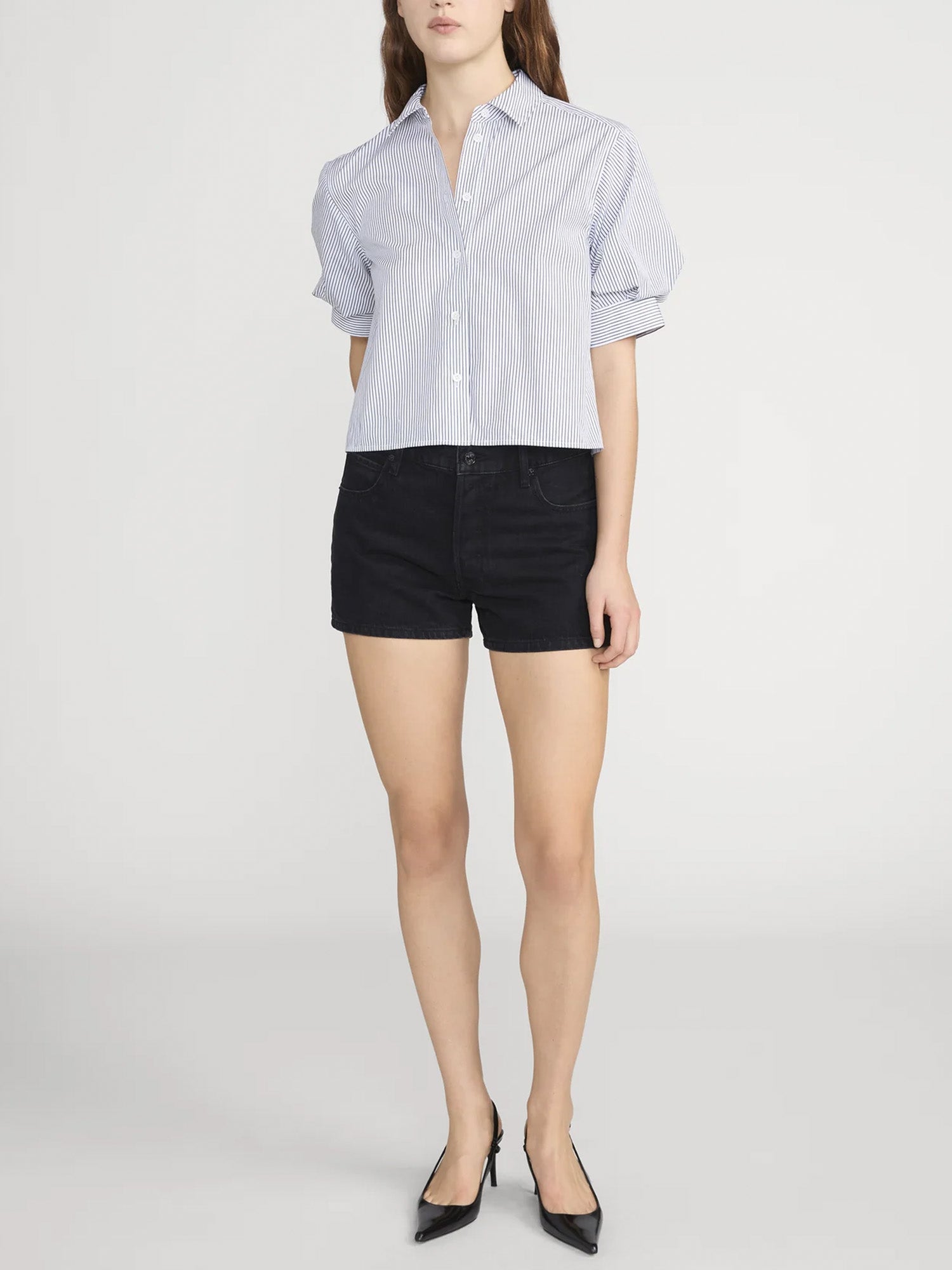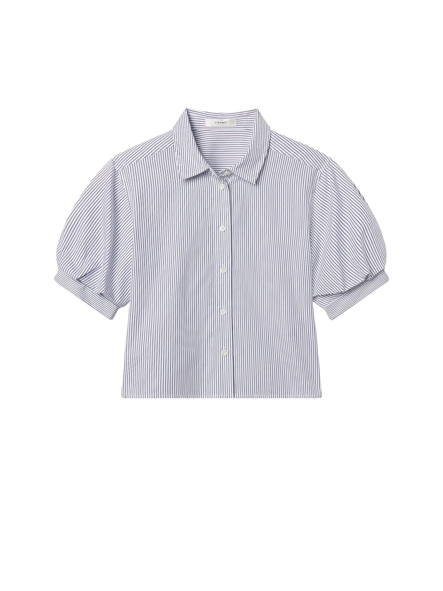 The Billow Sleeve Shirt is a modern take on a classic button-down. Cut from lightweight cotton with a navy stripe, it features short puff sleeves, a crisp collar, and a relaxed drape to the hip. Finished with button closure for a polished look.