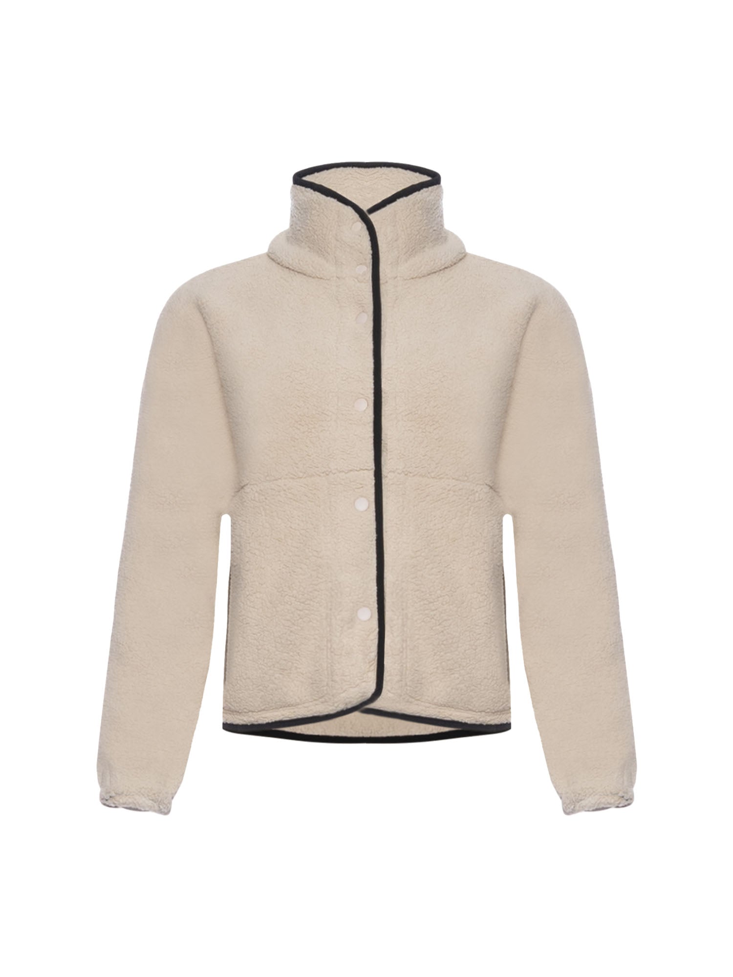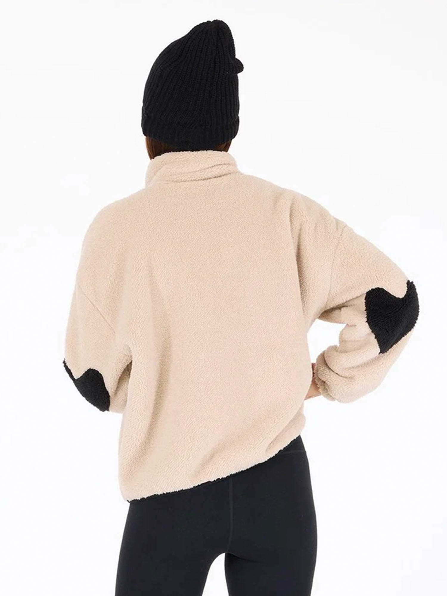 Snap front jacket with side pockets, contrast trim & heart elbows, elastic cuffs