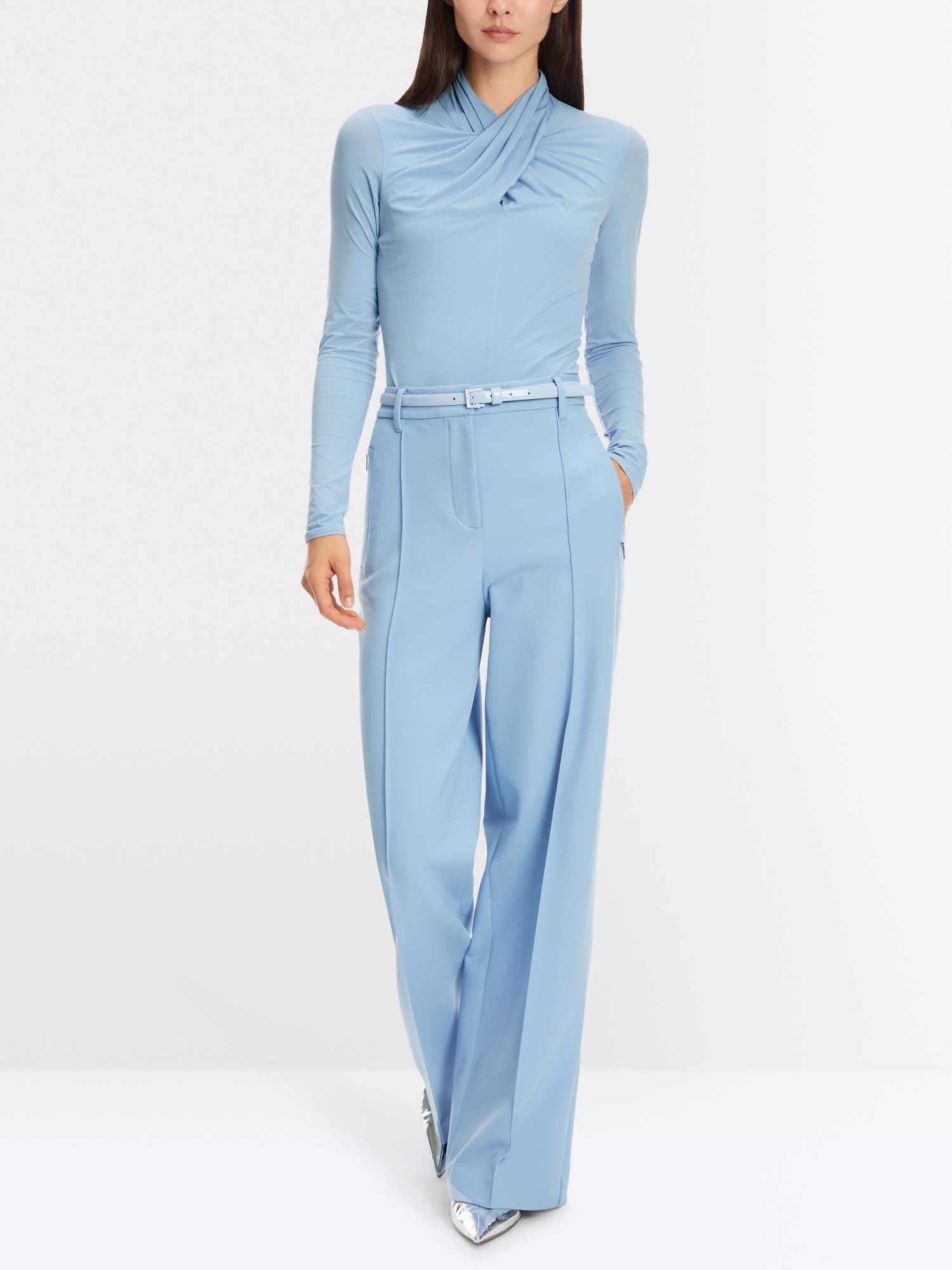 Long-sleeved shirt made from highly stretchy jersey. This garment has a slim, straight cut and a collar with a sophisticated wrap effect. Versatile combination - for business and evening.