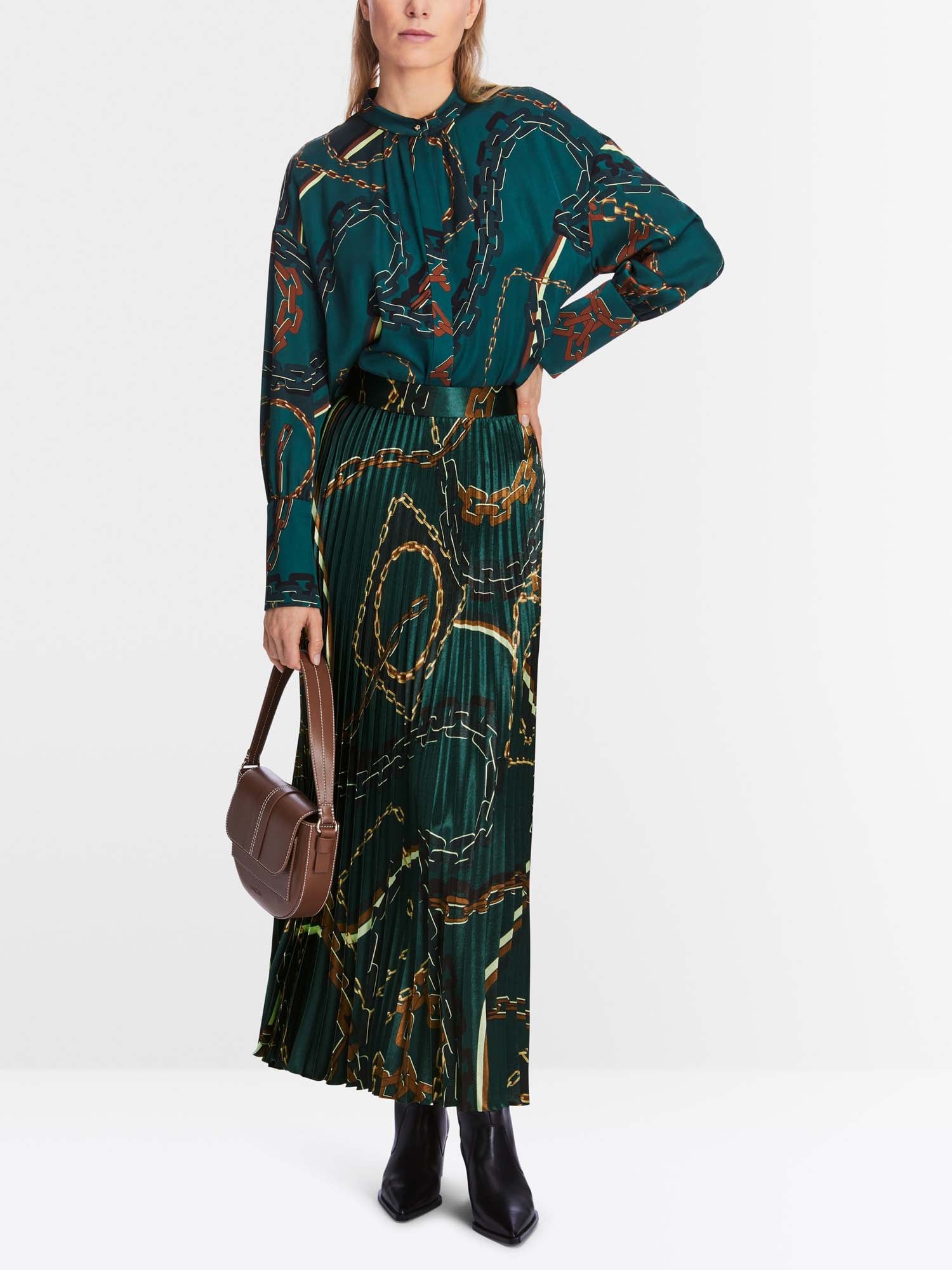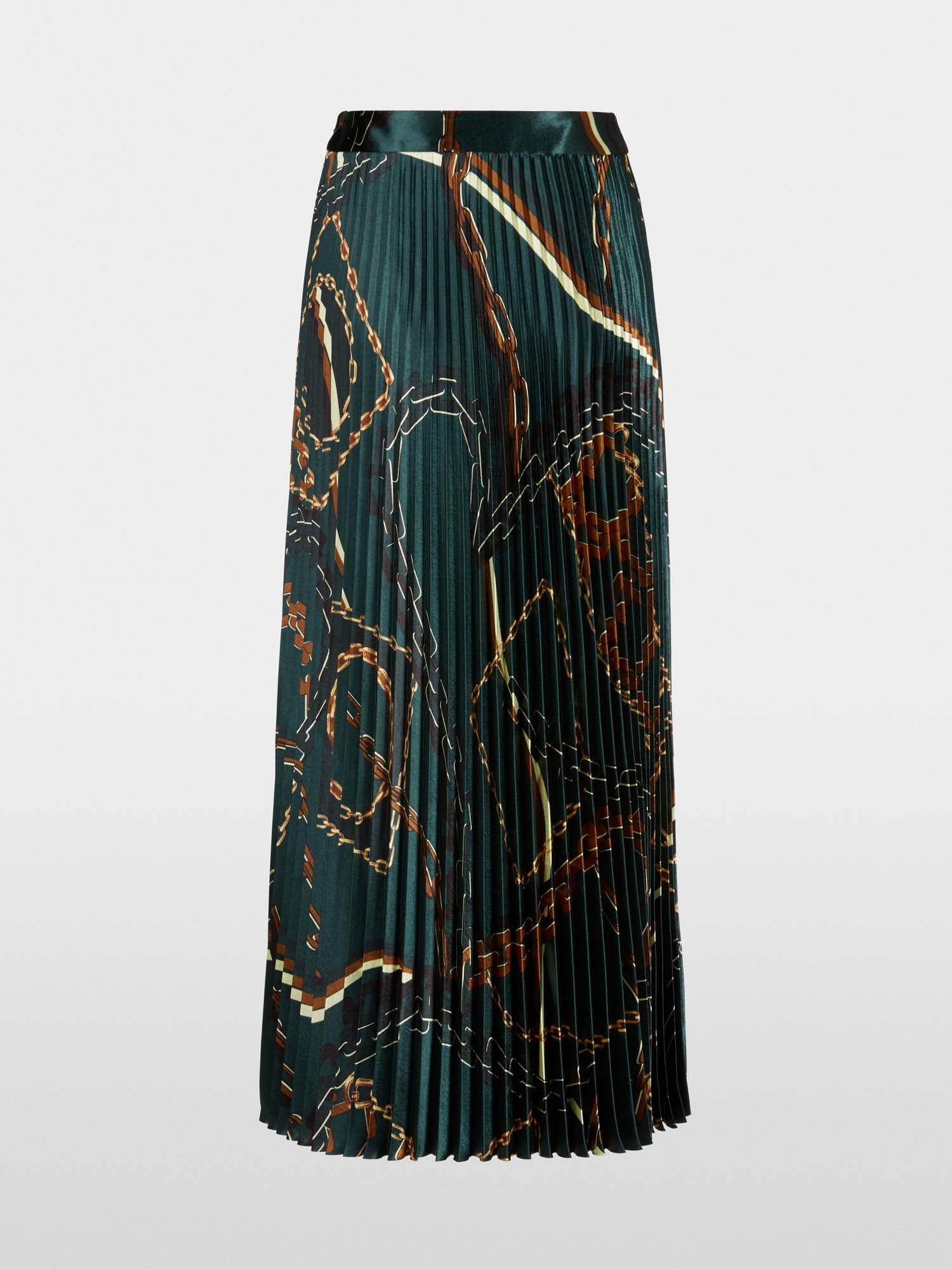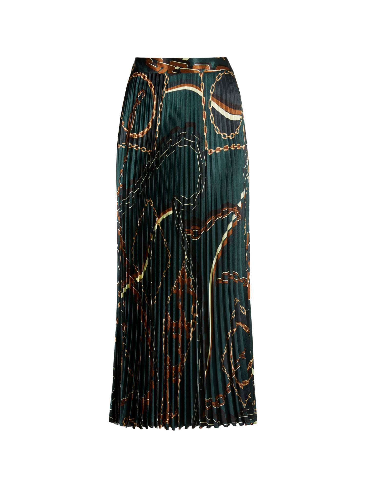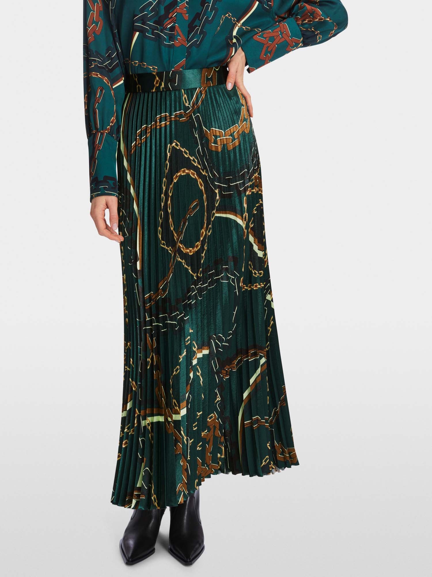 This softly flowing pleated skirt impresses with its elegant swing. The skirt comes in a midi length and has a zipper on the side. Featuring an all-over large chain design, this open-edged skirt is an attractive eye-catcher.