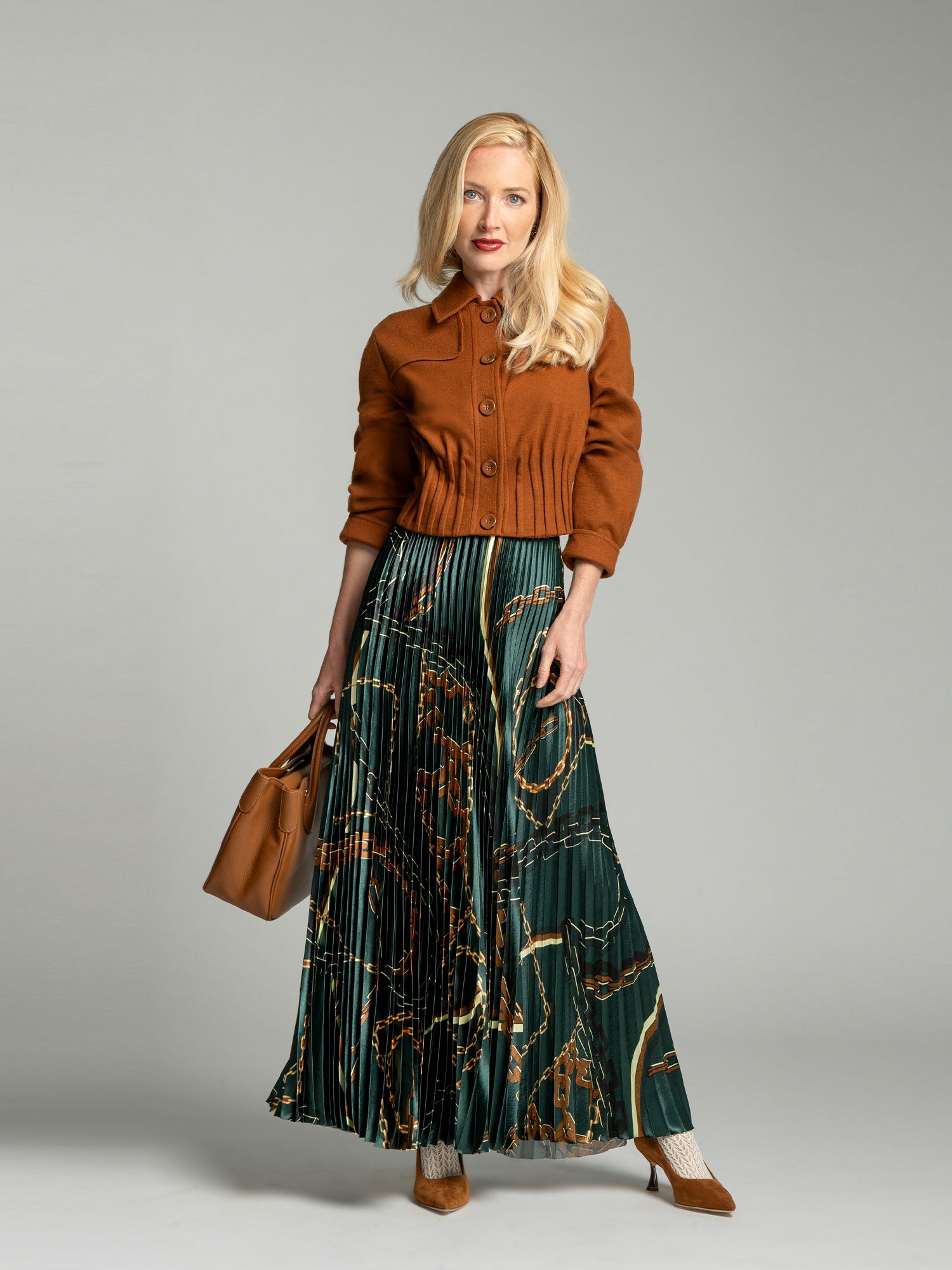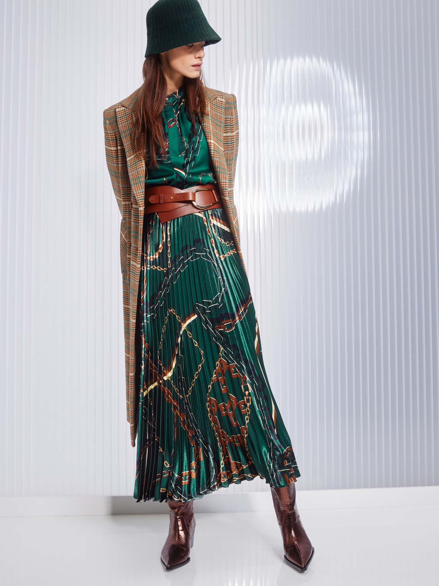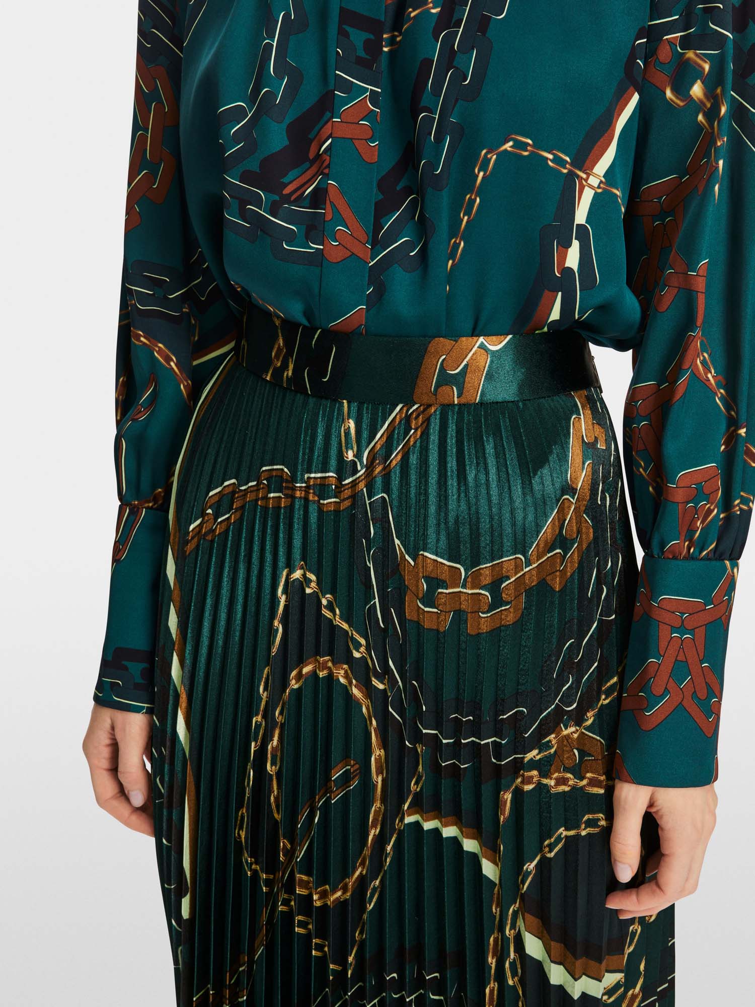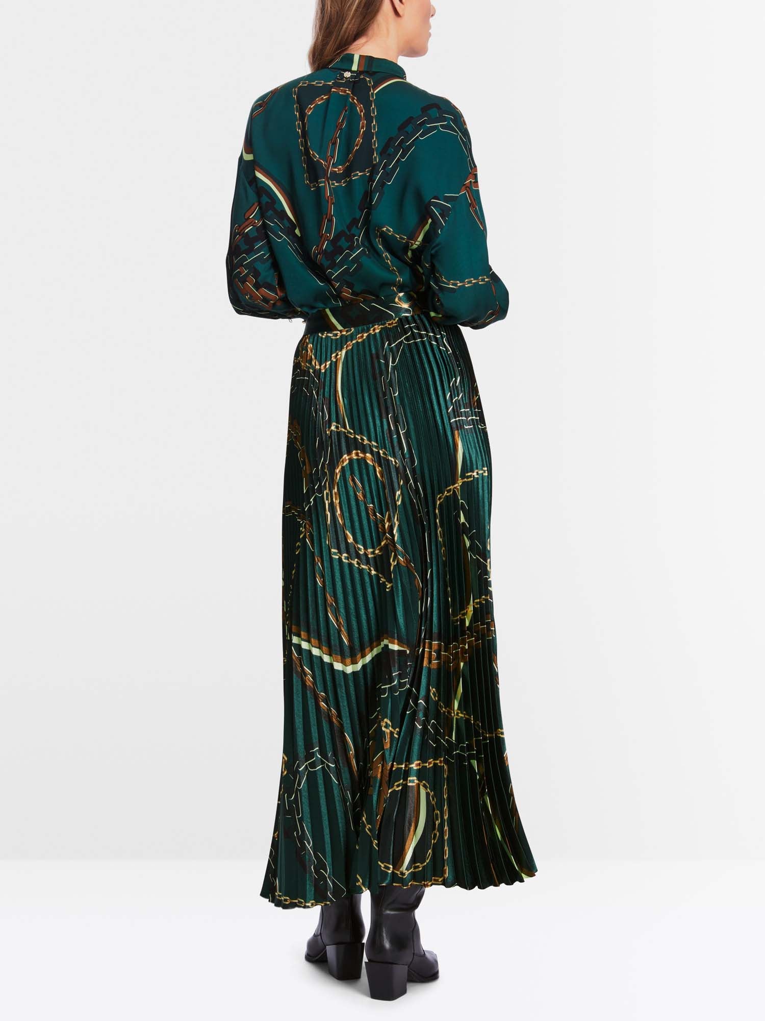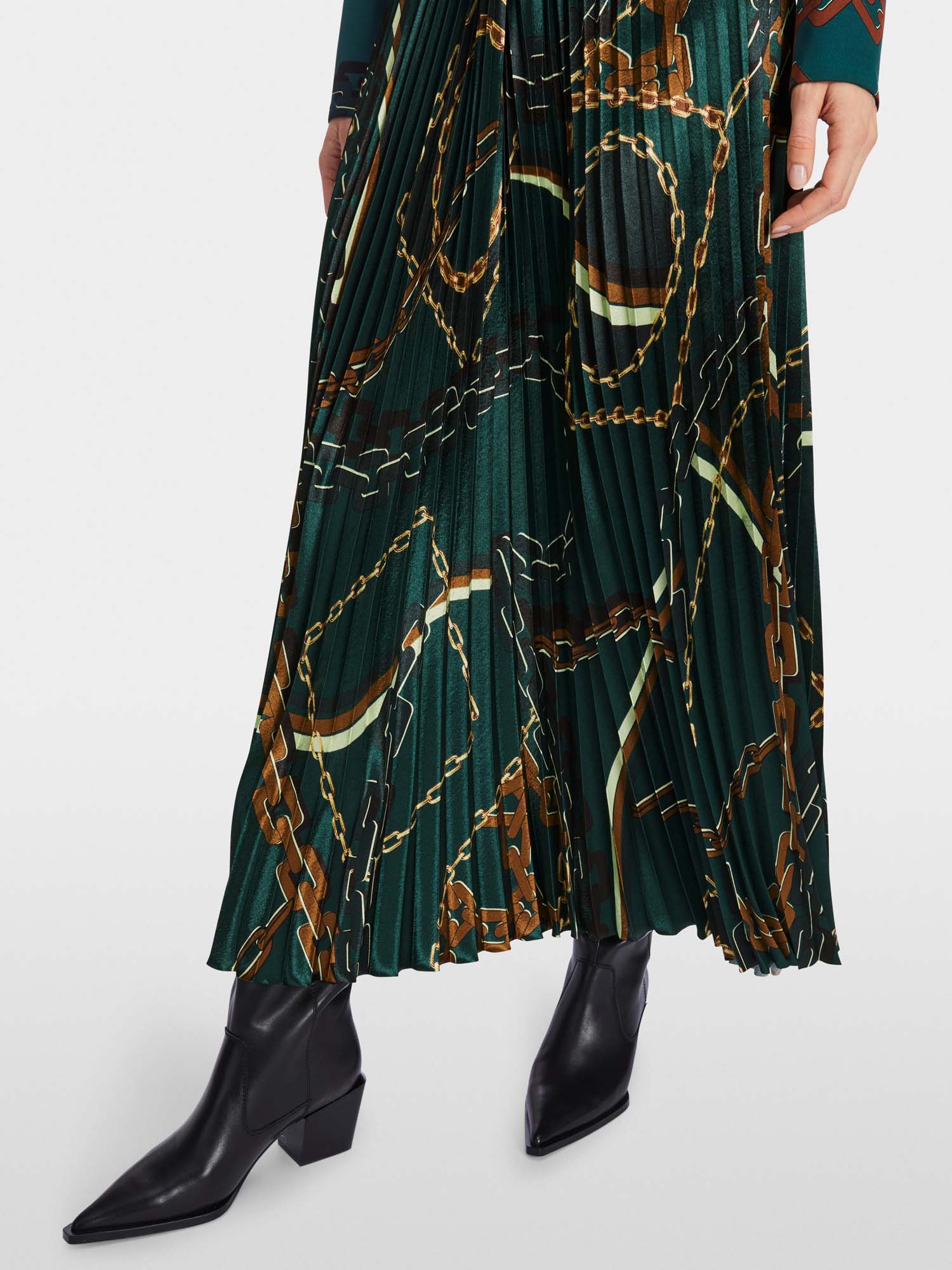 This softly flowing pleated skirt impresses with its elegant swing. The skirt comes in a midi length and has a zipper on the side. Featuring an all-over large chain design, this open-edged skirt is an attractive eye-catcher.