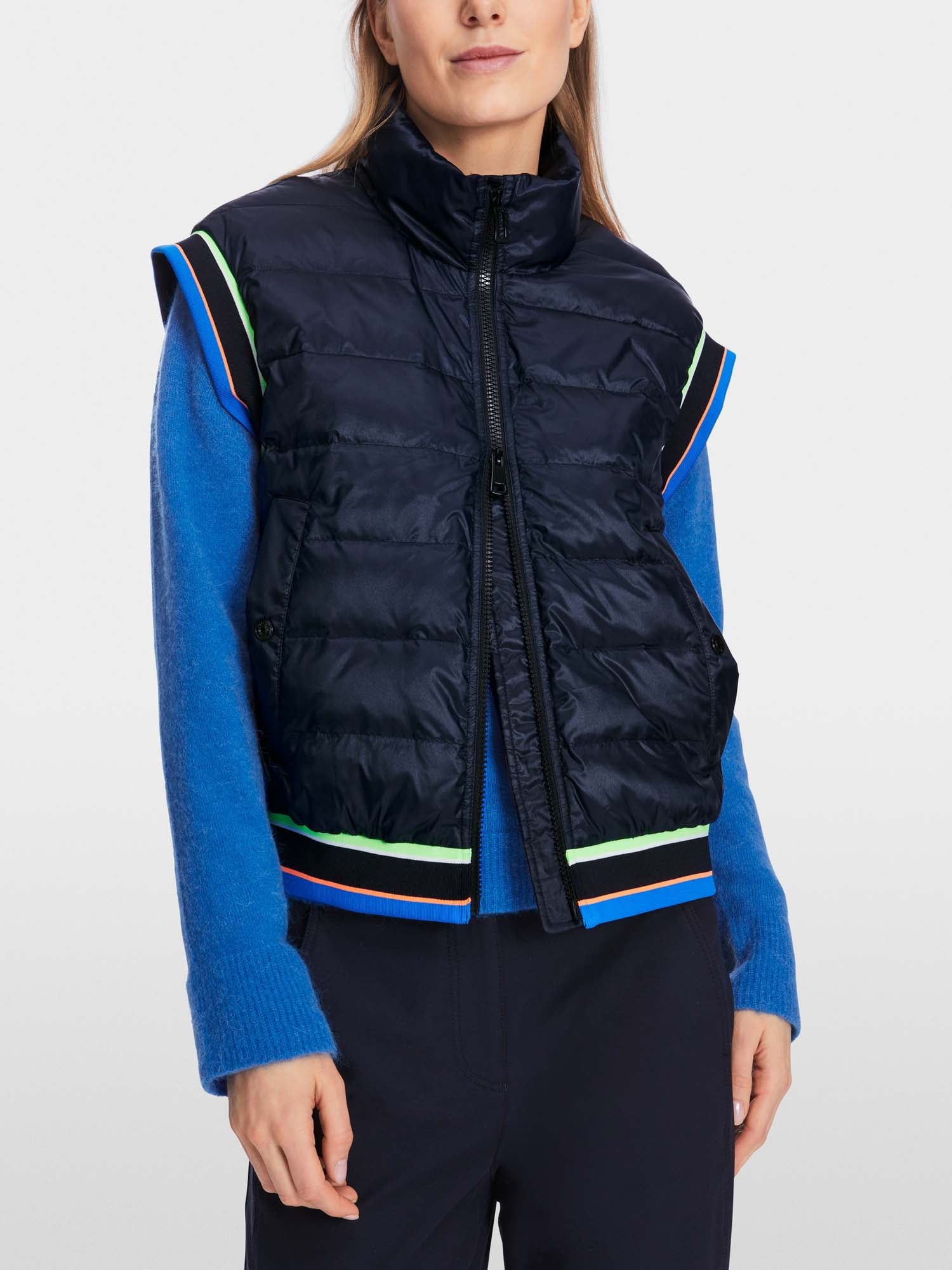 Oversized down vest made from shiny, water-repellent fabric. The garment has a zip and stand-up collar. The armholes and hem are trimmed with ribbed cuffs. The inside pockets are lined with warm fleece. The lining is made from recycled polyester. The down comes from breeders with certified animal welfare standards.