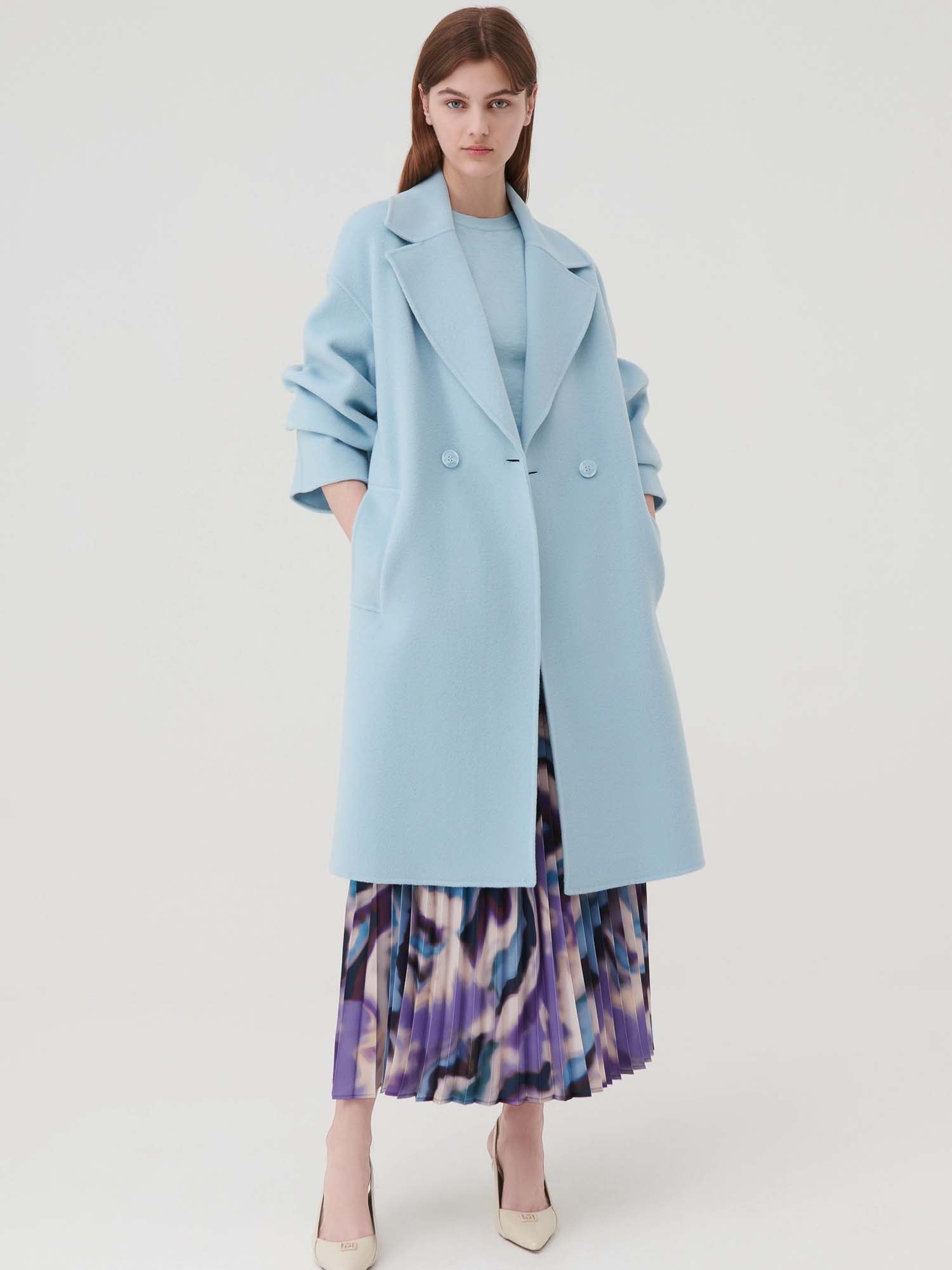 Straight-fit double-faced wool coat. Lapel collar and long, low set-in sleeves. Double-breasted fastening and welt pockets. Unlined.