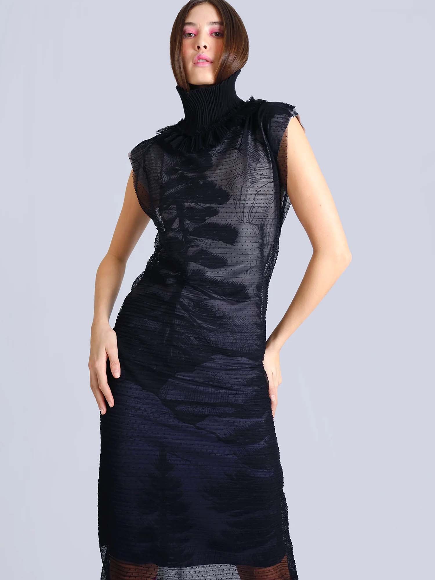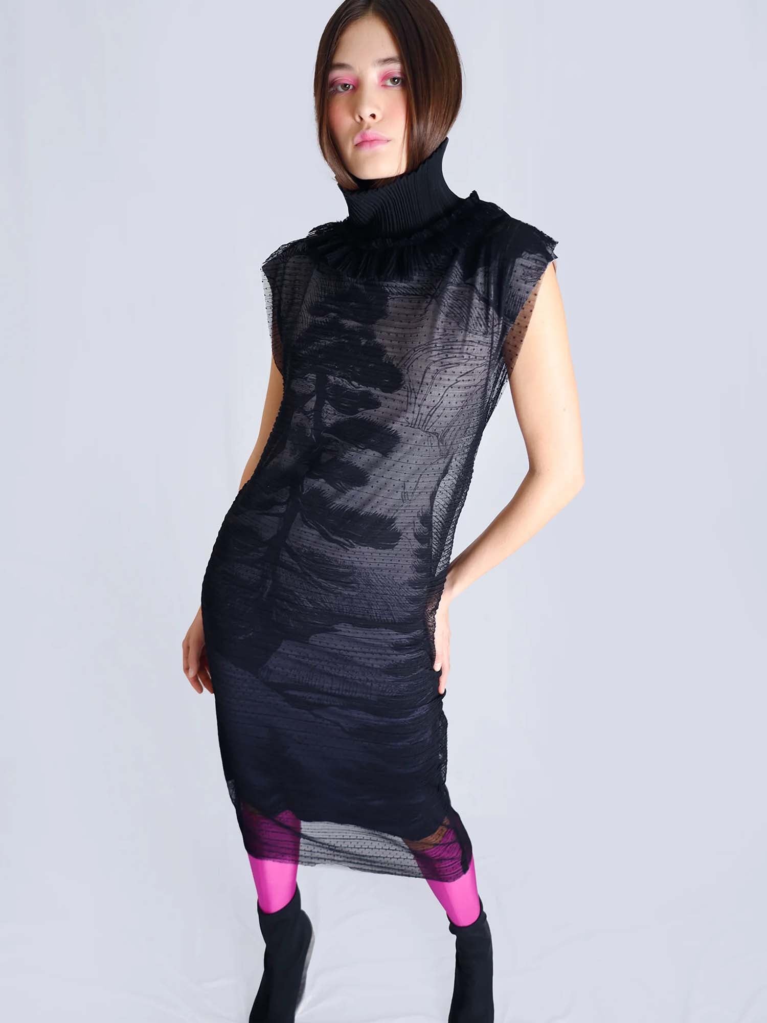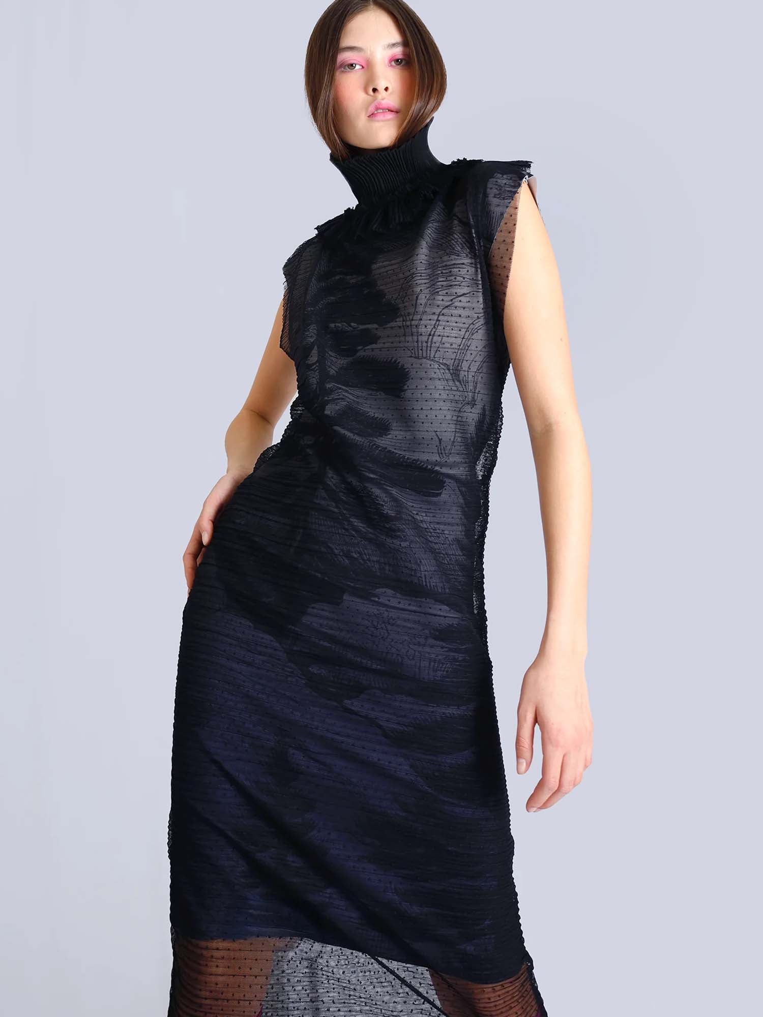 The Naarat dress is a poetic composition of texture and depth. Crafted with a printed jersey base and a dotted mesh overlay, this midi silhouette captures movement and transparency with ease. A pleated chiffon high collar adds drama, while the soft cap sleeves and layered lengths create an effortlessly elongated form. A true study in contrast and elegance.