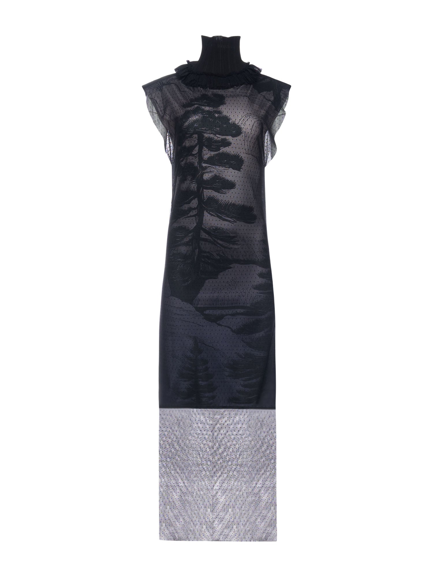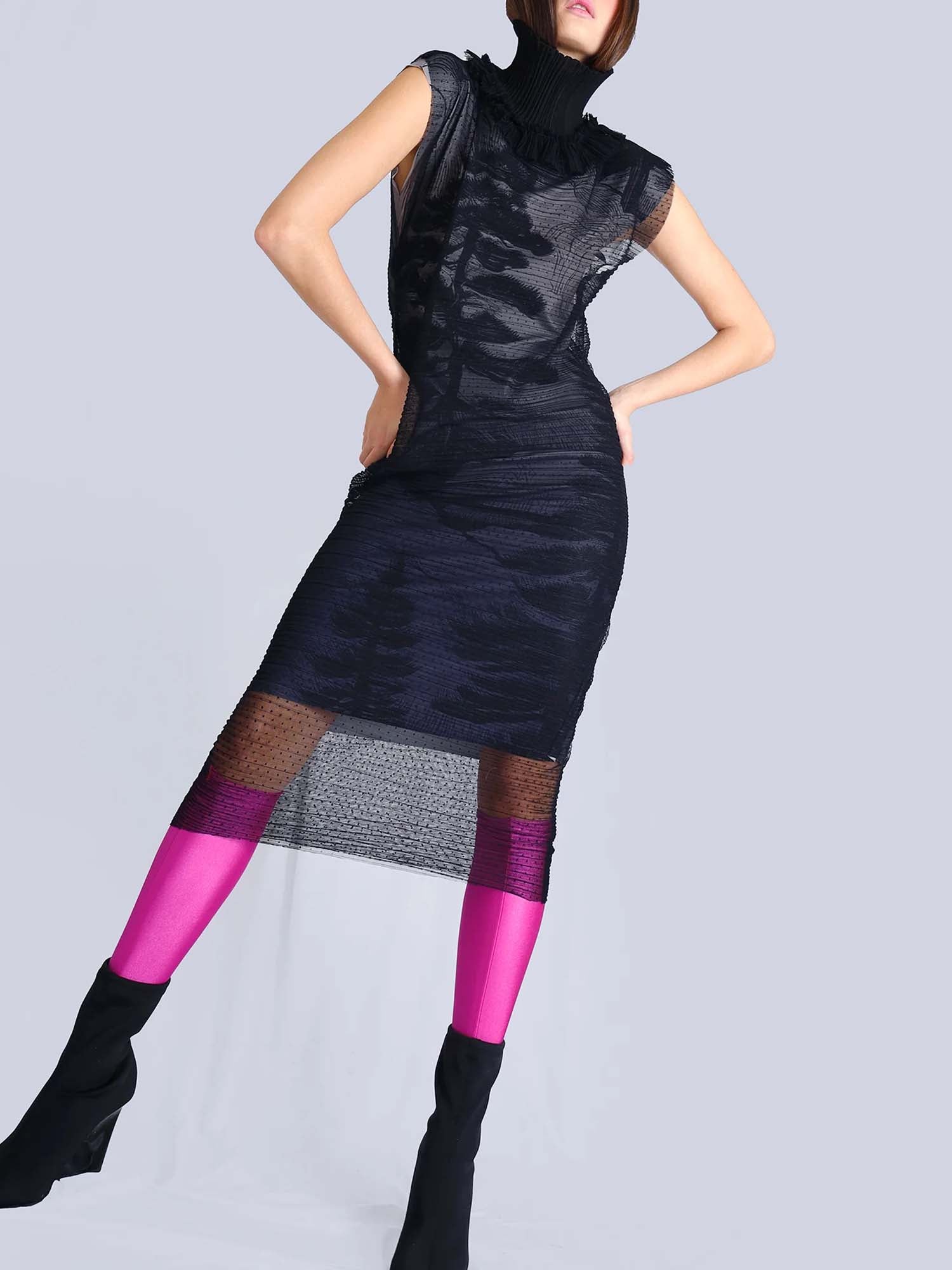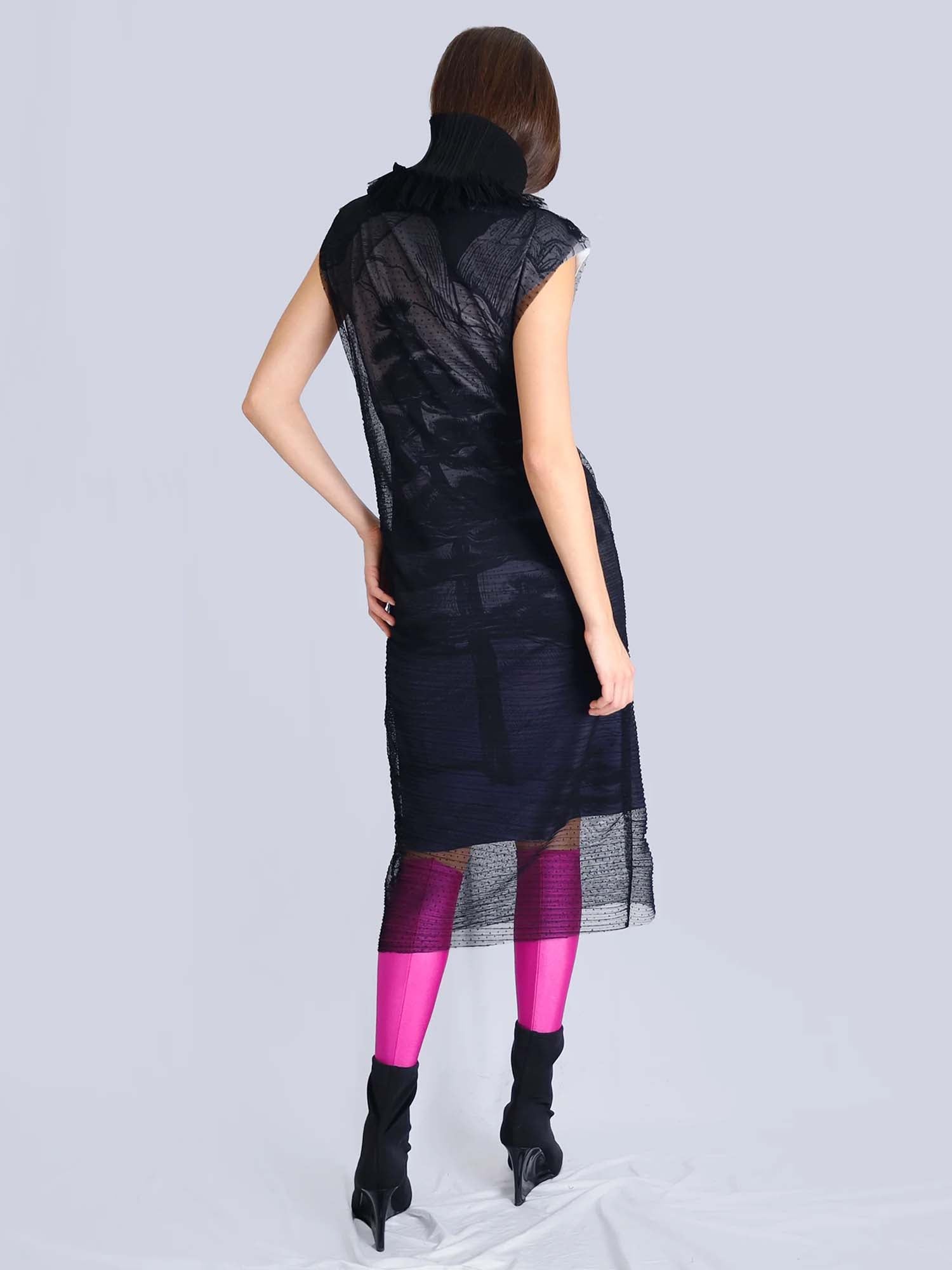 The Naarat dress is a poetic composition of texture and depth. Crafted with a printed jersey base and a dotted mesh overlay, this midi silhouette captures movement and transparency with ease. A pleated chiffon high collar adds drama, while the soft cap sleeves and layered lengths create an effortlessly elongated form. A true study in contrast and elegance.