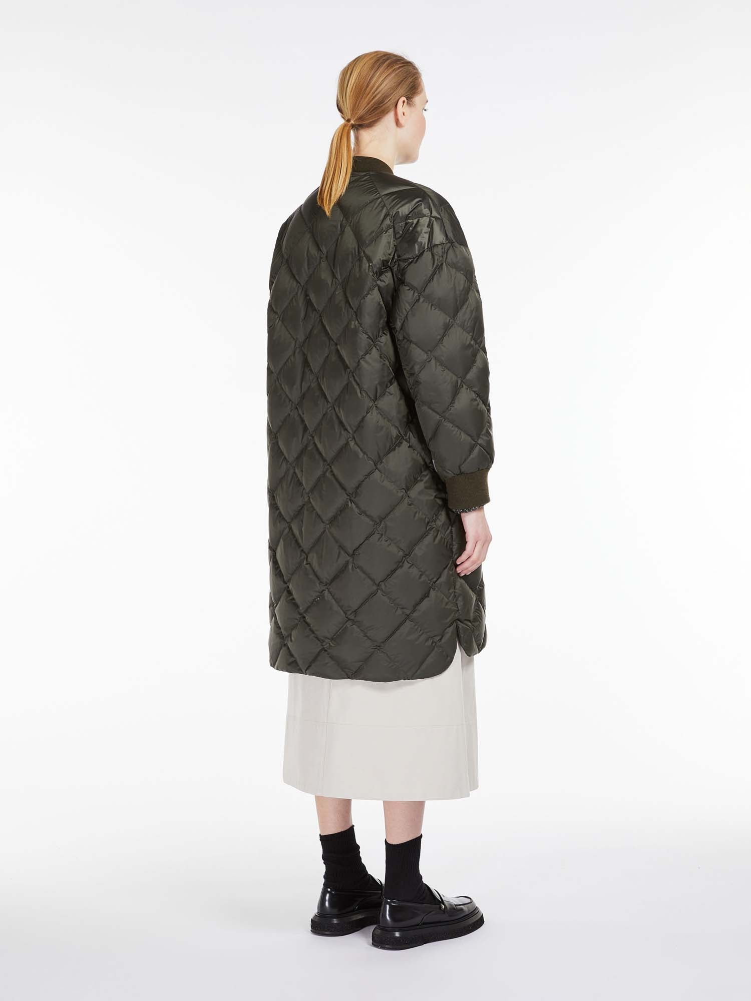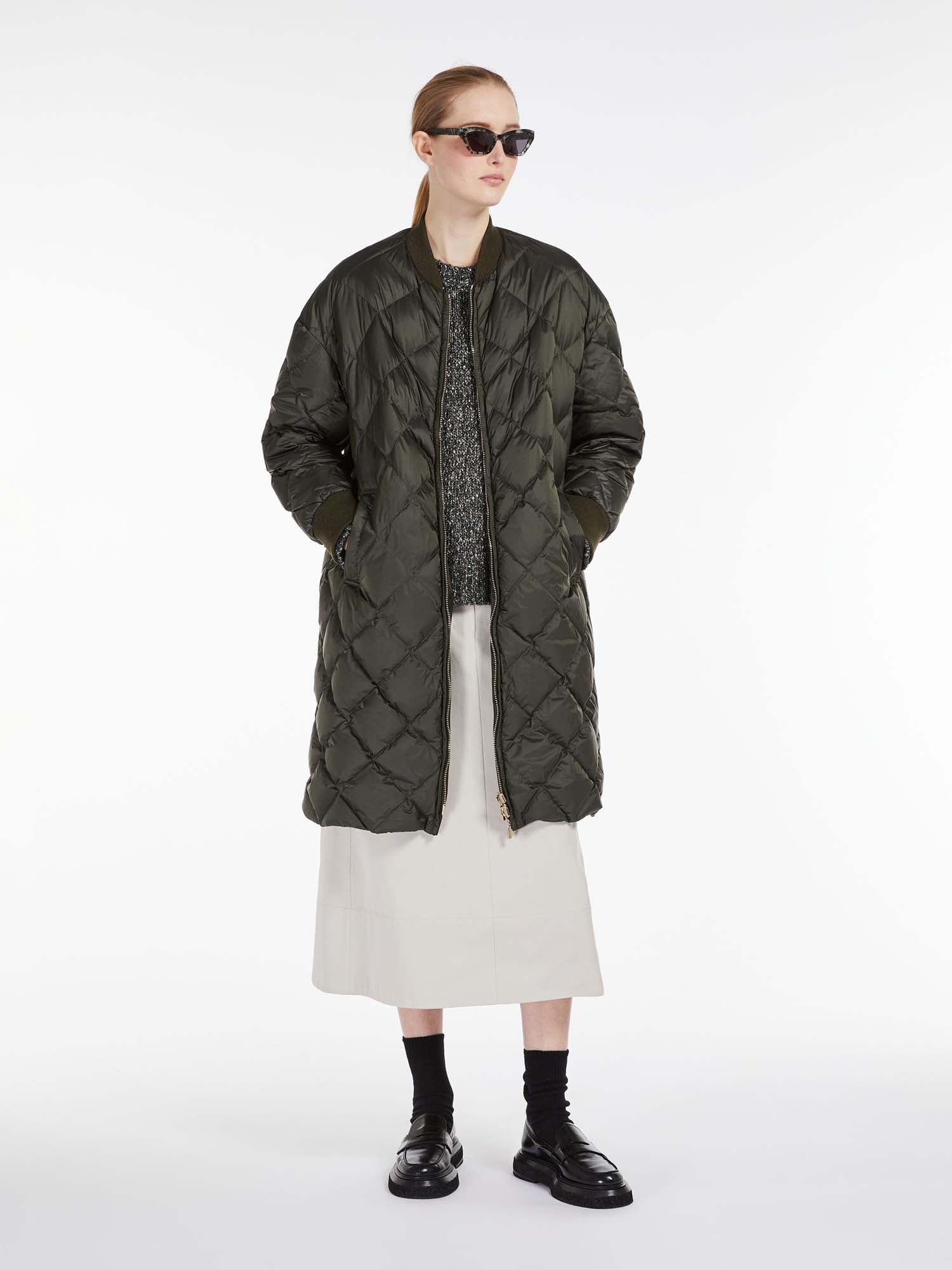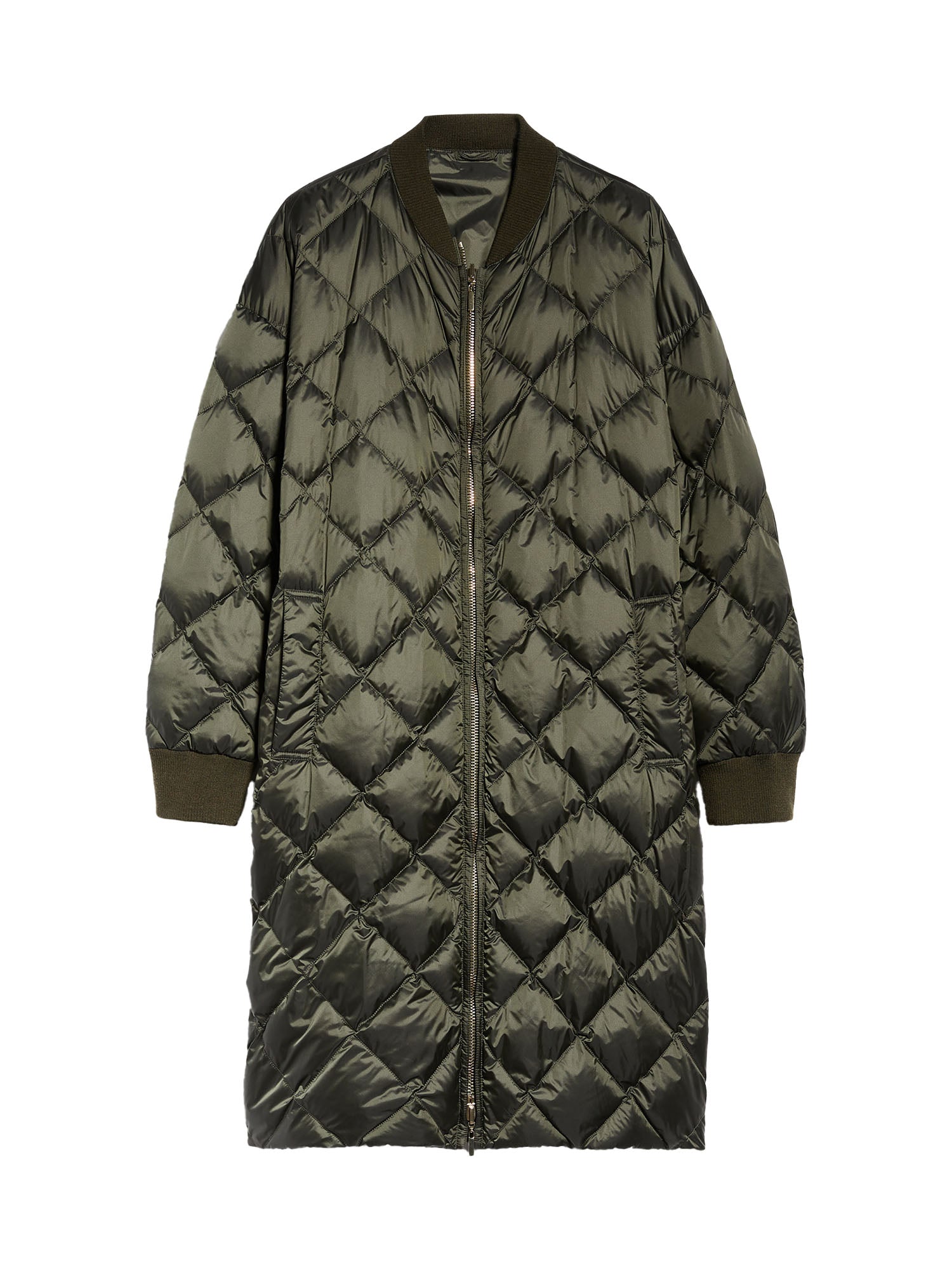 Long reversible bomber jacket in water-resistant technical canvas, padded with goose down, with a diamond-quilted motif on one side and smooth on the inside. The style features a rib-knit collar and cuffs and welt pockets on the sides. Visible metal zip fastening. Length: 106 cm.