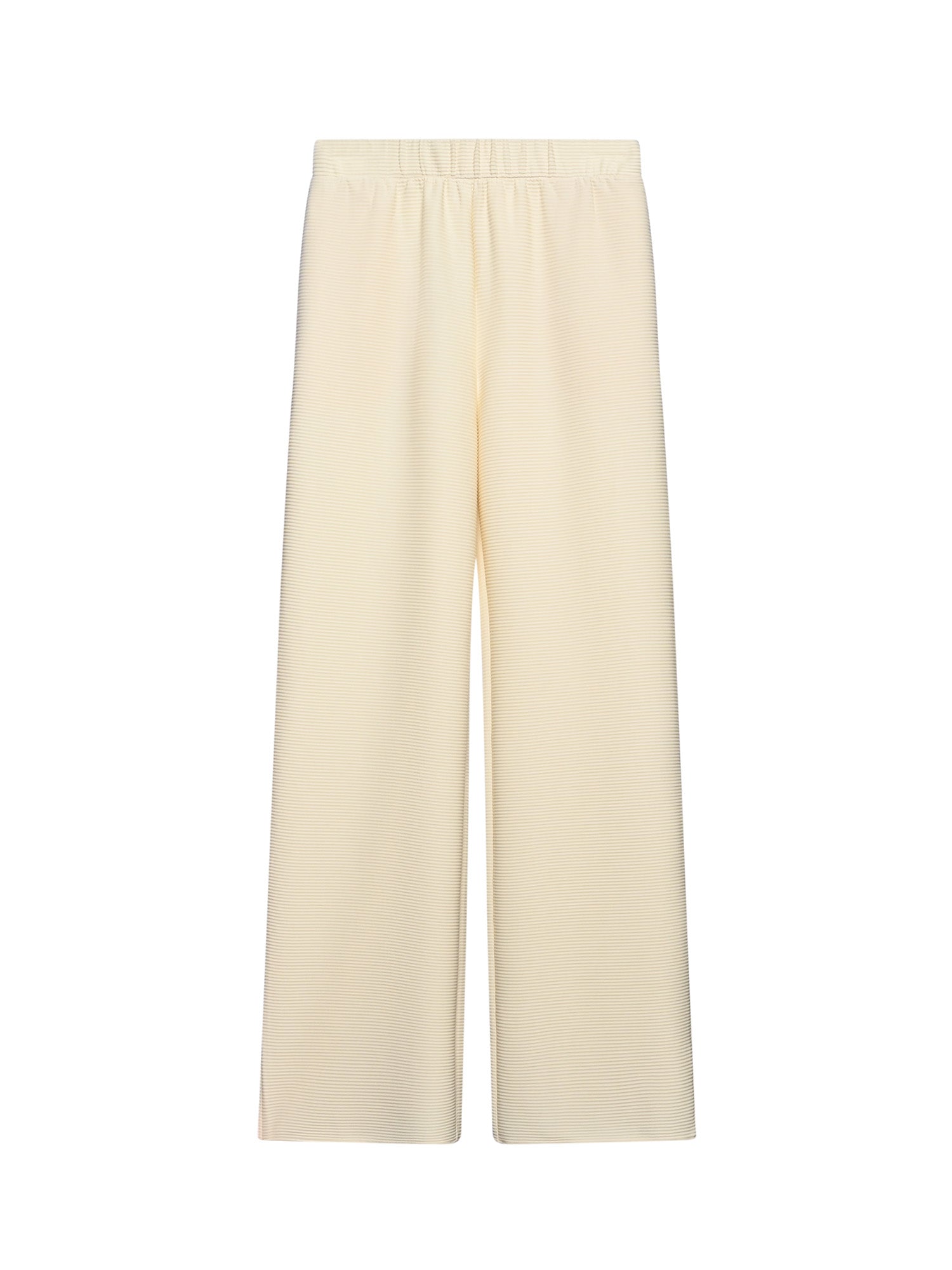 Relaxed wide legs and a high-rise elastic waist give these full-length pants a comfortable yet refined silhouette. A subtle ribbed texture adds a minimalist detail, making them a versatile everyday essential.