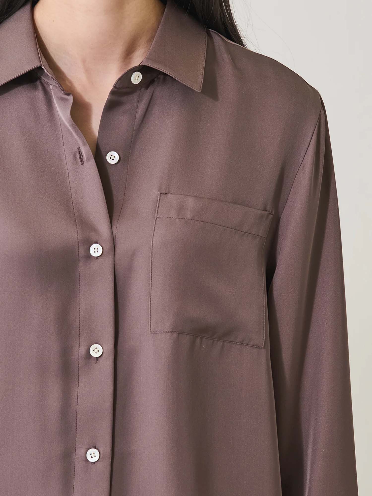Our 100% silk boyfriend shirt is a relaxed yet sophisticated wardrobe staple. Featuring a functional front pocket and mother of pearl buttons, this piece can be styled with your favourite denim or their silk drawstring pant for an elevated matching look this season.
