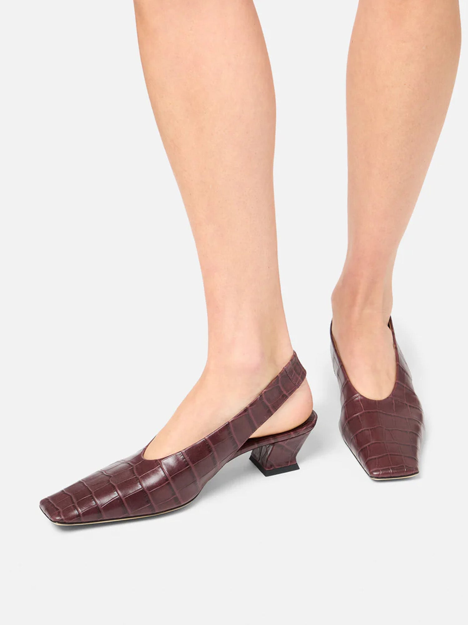 Square-toe slingback in merlot faux crocodile with a soft construction and sculptural block heel. A bold yet refined statement for modern dressing.