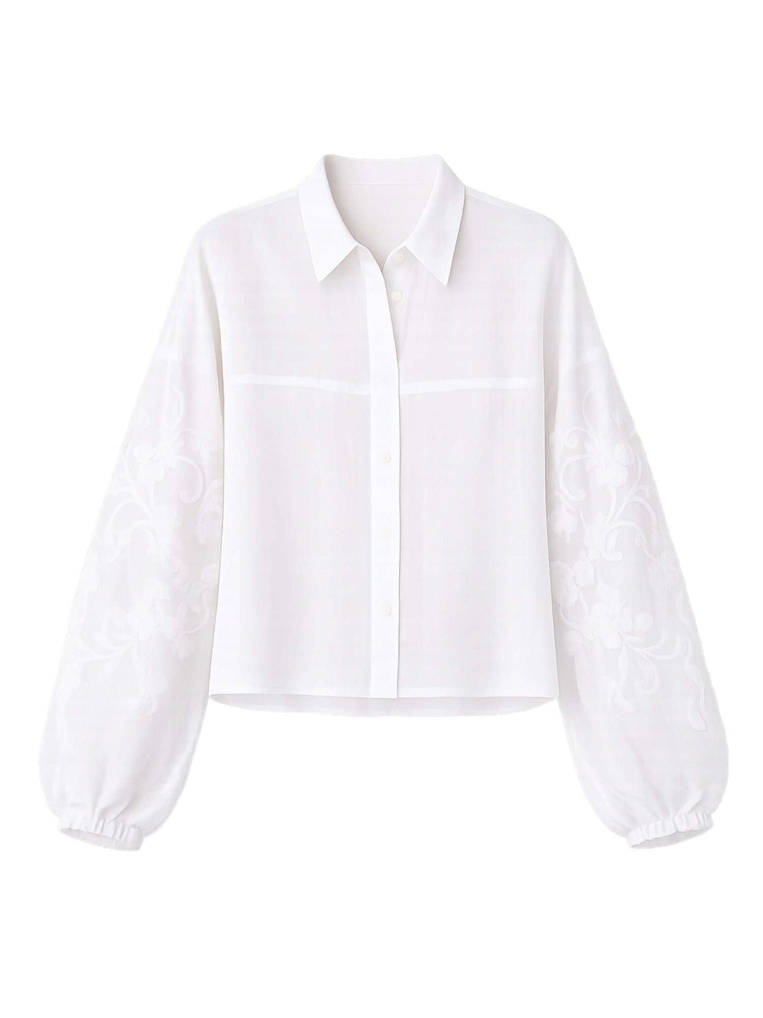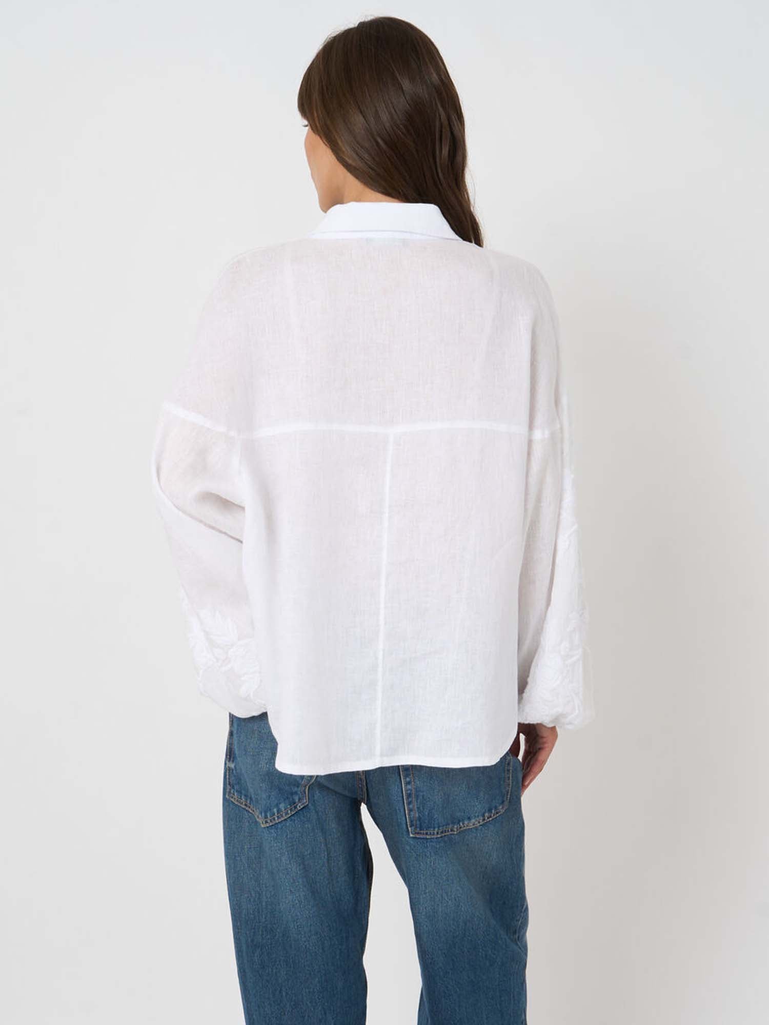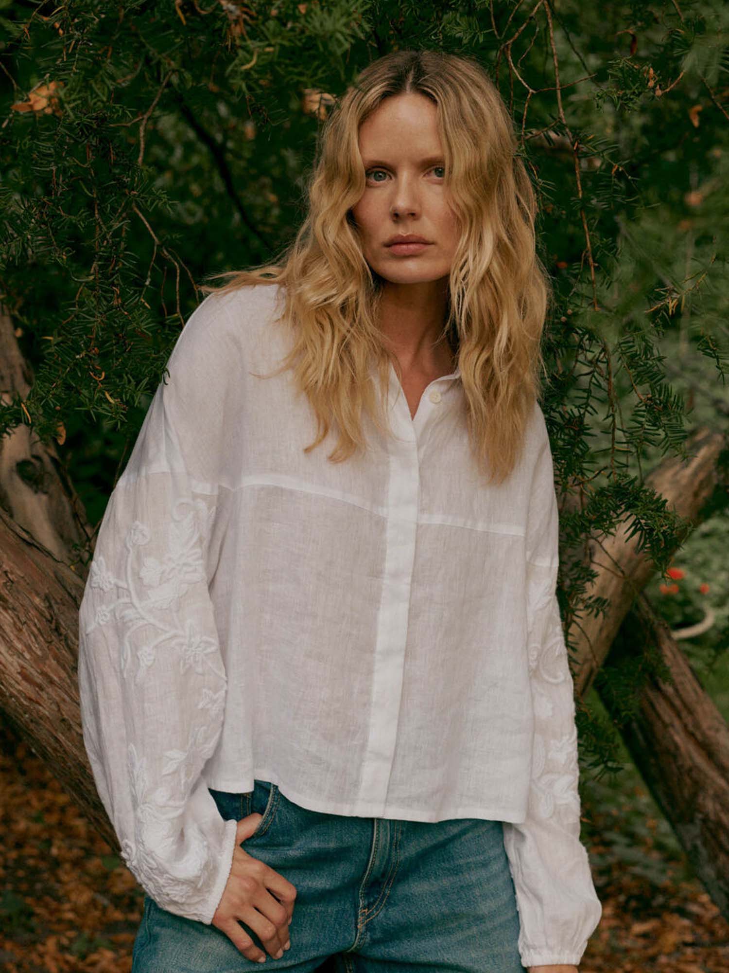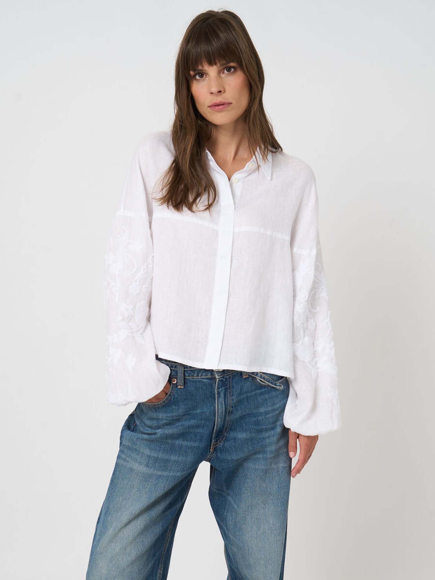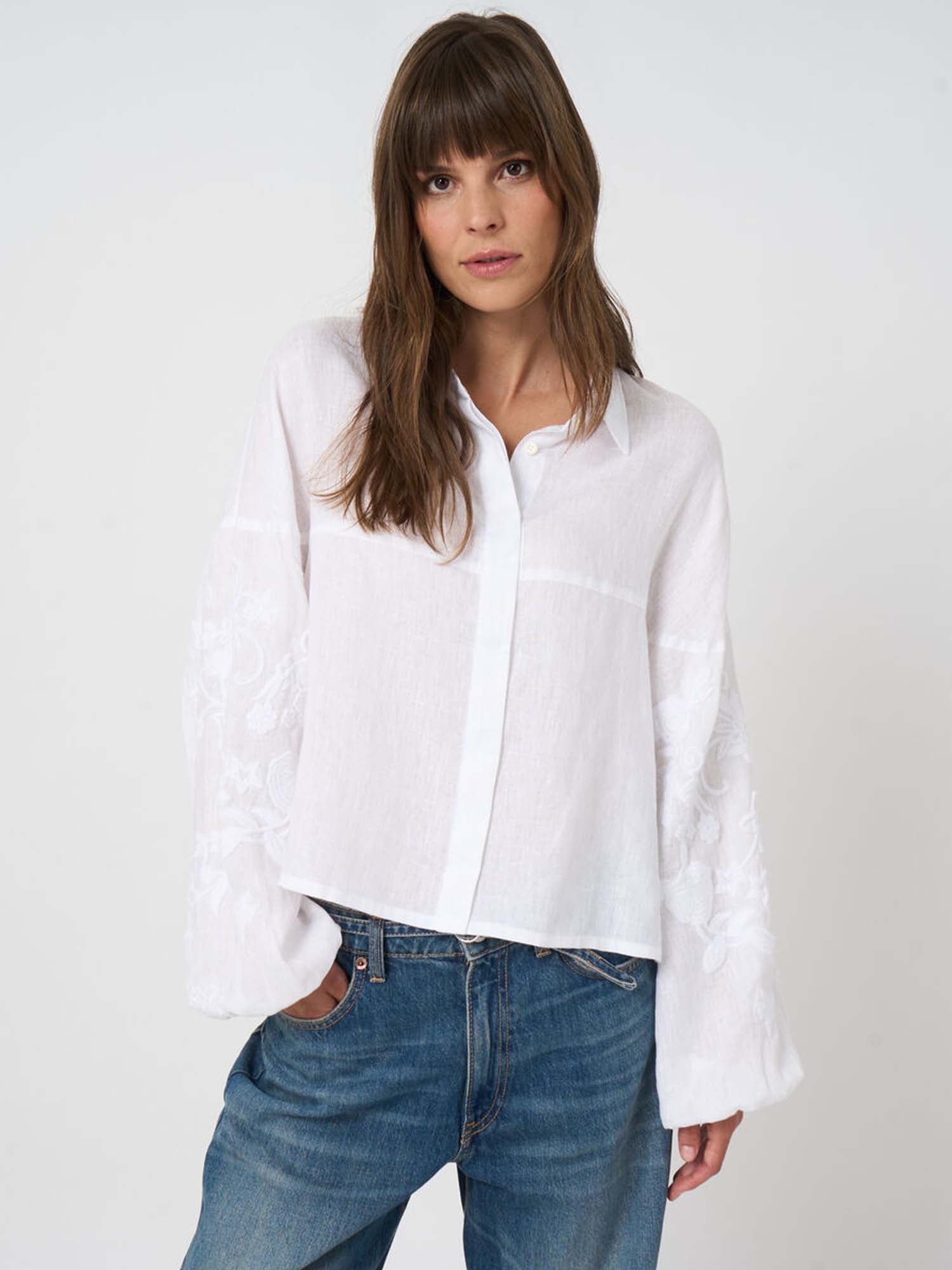Pure, all-linen woven fabric feels cool and breathable, with natural linen texture and embroidered sleeves. A relaxed fit with drop shoulders, puffed sleeves, and a curved hem and raised front, plus a shirt collar. Versatile for work, travel, and weekends, it layers under blazers or over tanks by REPEAT cashmere.
