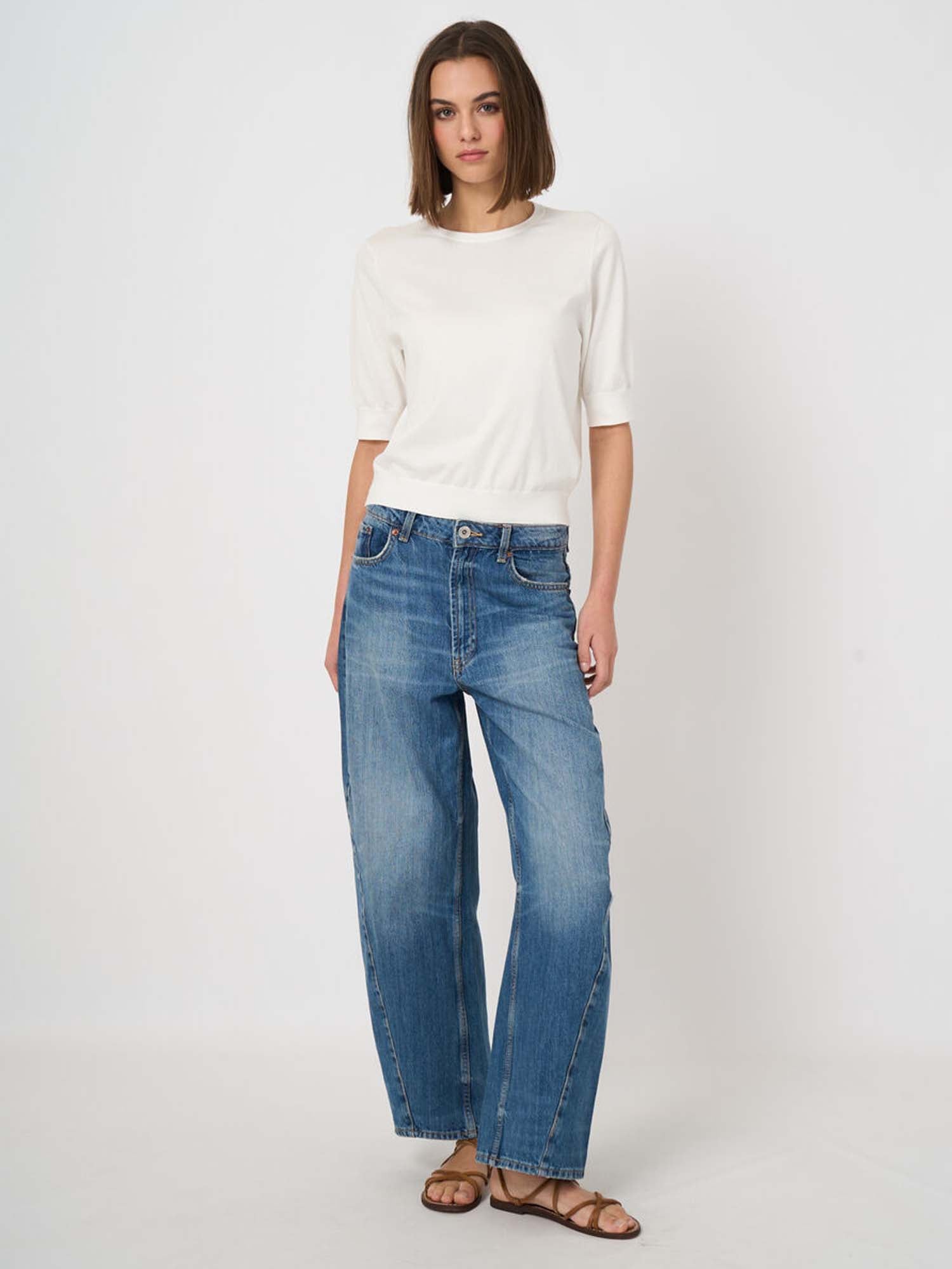 Spun from 100% superfine cotton, the featherweight, silky knit feels cool and smooth, finished with a ribbed crew neck and ribbed hem. Cut in a straight boxy cut for a modern, square fit, the short sleeves keep proportions crisp. From REPEAT cashmere, perfect for desk-to-dinner layering.