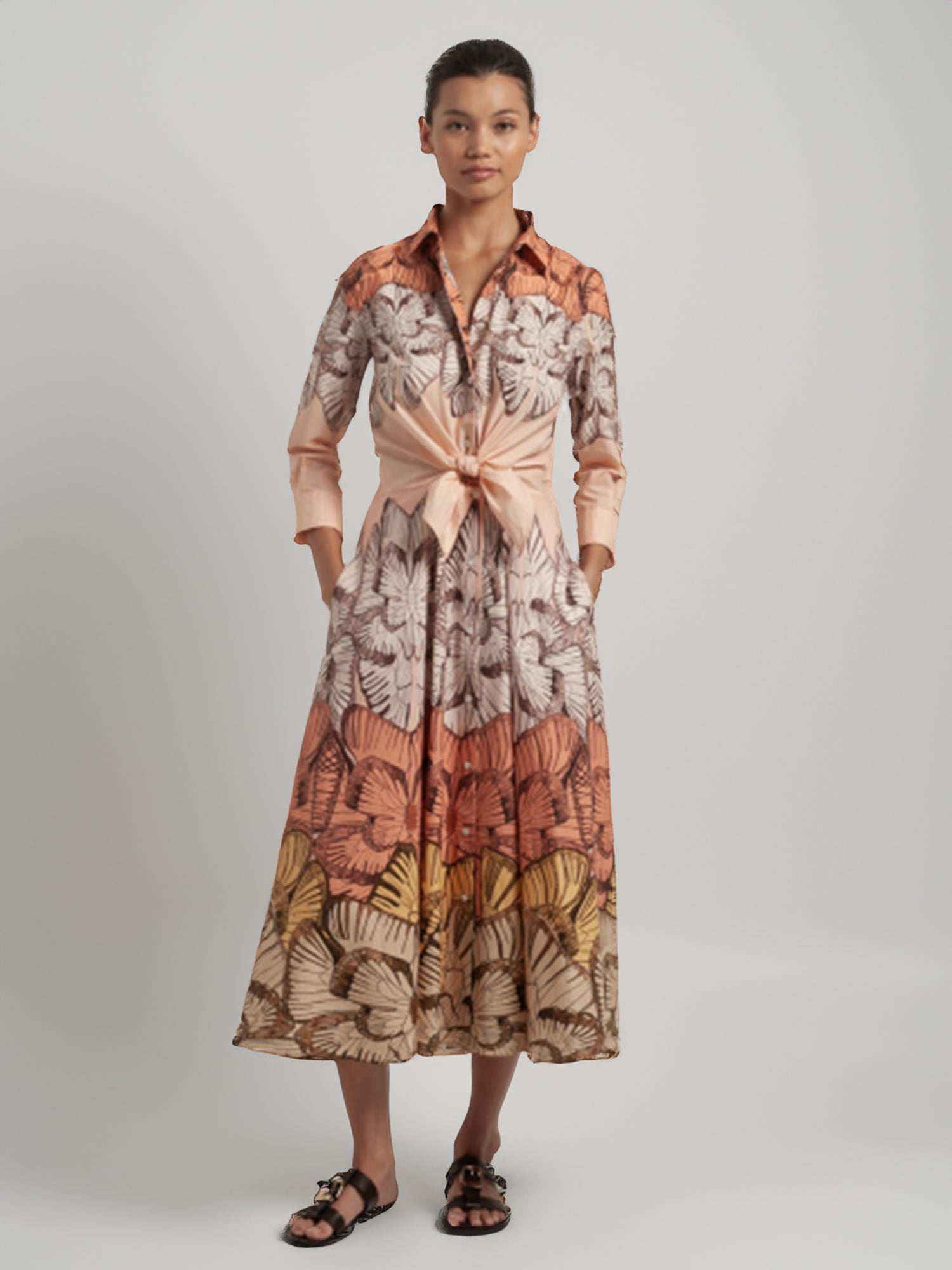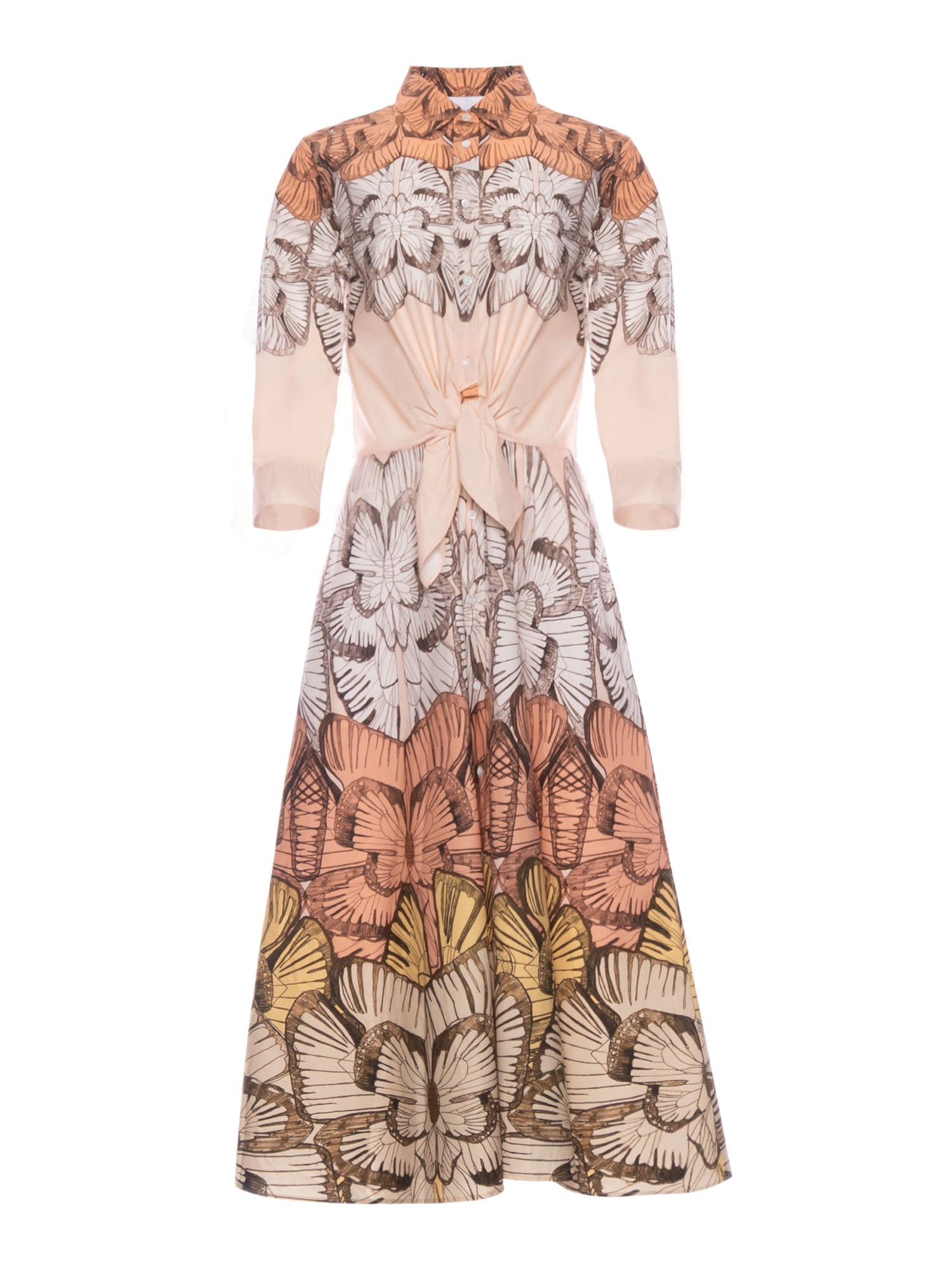 Mid-length dress with a gorgeous butterfly pattern, button-up finished with a crisp collar and a tie waist to accentuate your silhouette.