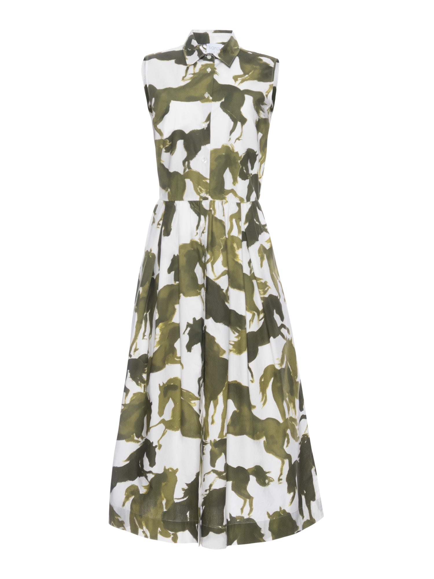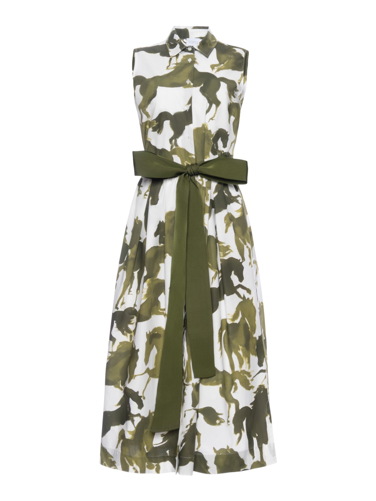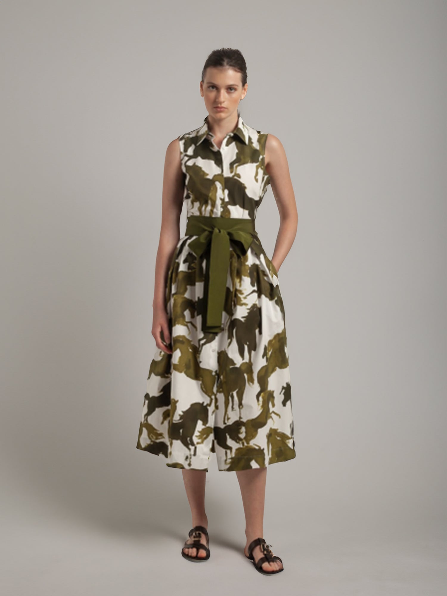 Mid-length white button up dress with green horse pattern, includes a belt that can be tied in many ways to accentuate your waist.