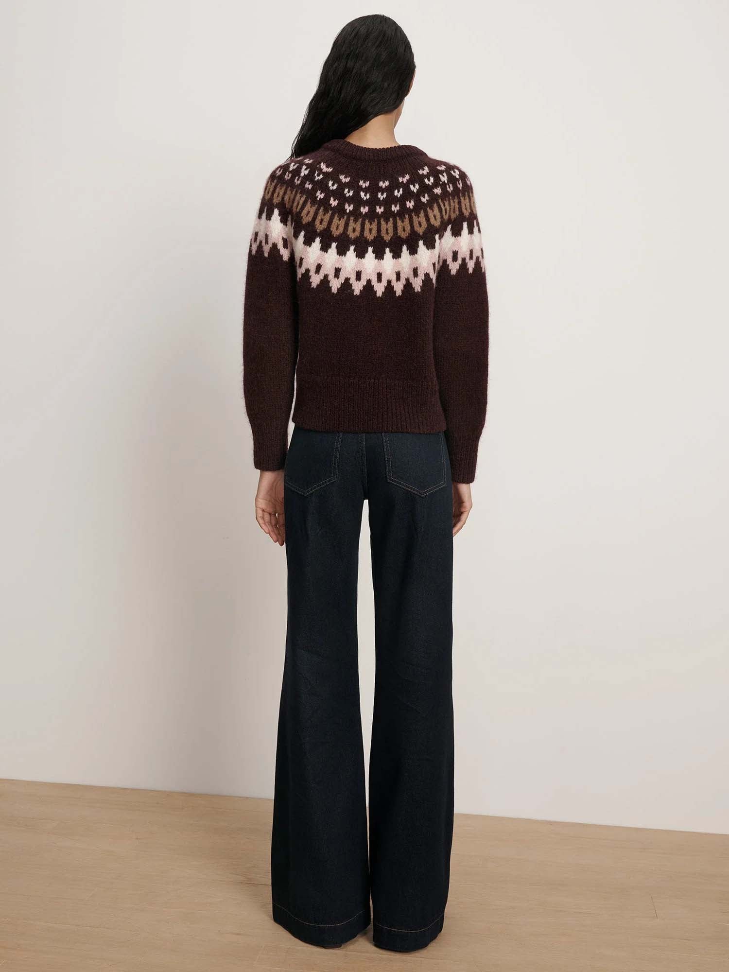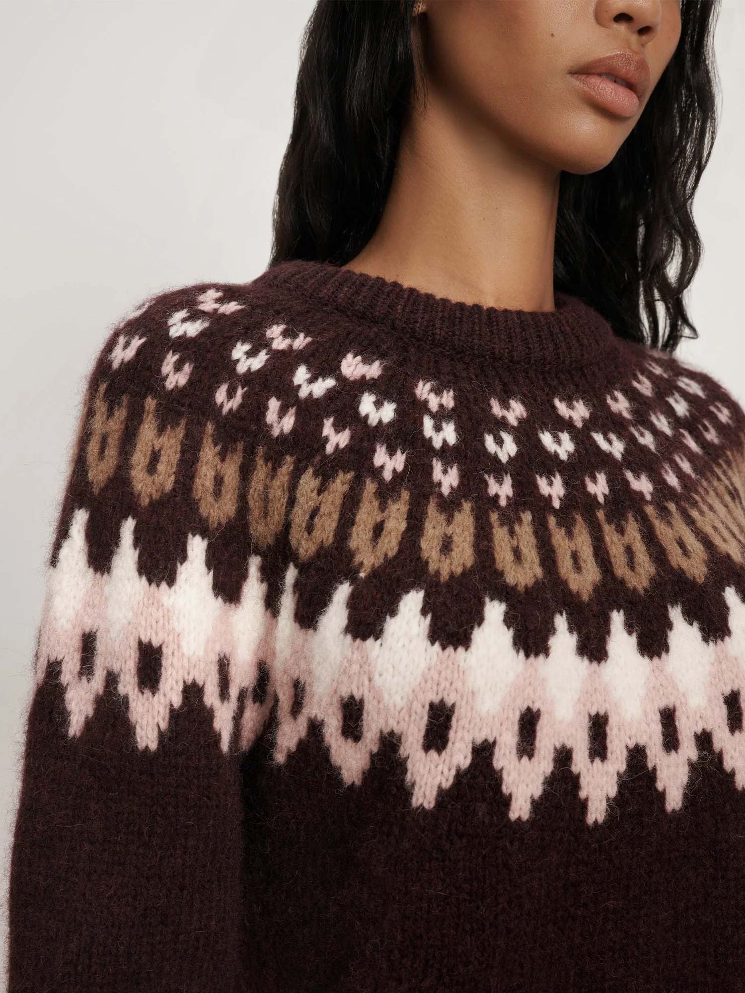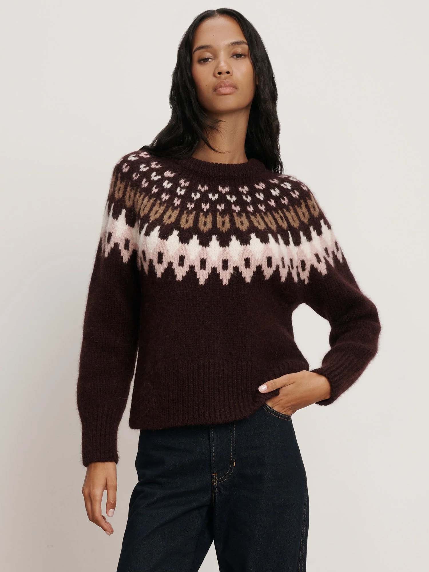No wardrobe is complete without a great Fair Isle knit. Spun from a luxuriously soft baby alpaca and merino wool blend, the maroon Anne sweater features a relaxed fit and slightly boxy shape that hits at the high hip. A classic crew neckline and chunky ribbing at the cuffs, neck, and hem complete the look of this nordic sweater. Pair with jeans for ease and a maxi skirt for polish.