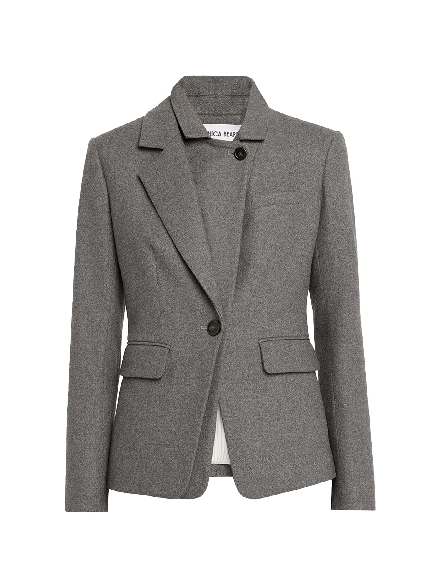 The Blyth Jacket is a single breasted jacket featuring an extra notched lapel on one side, single button closure, chest welt pocket, hip flap pockets, button cuffs, and cut-away hem.