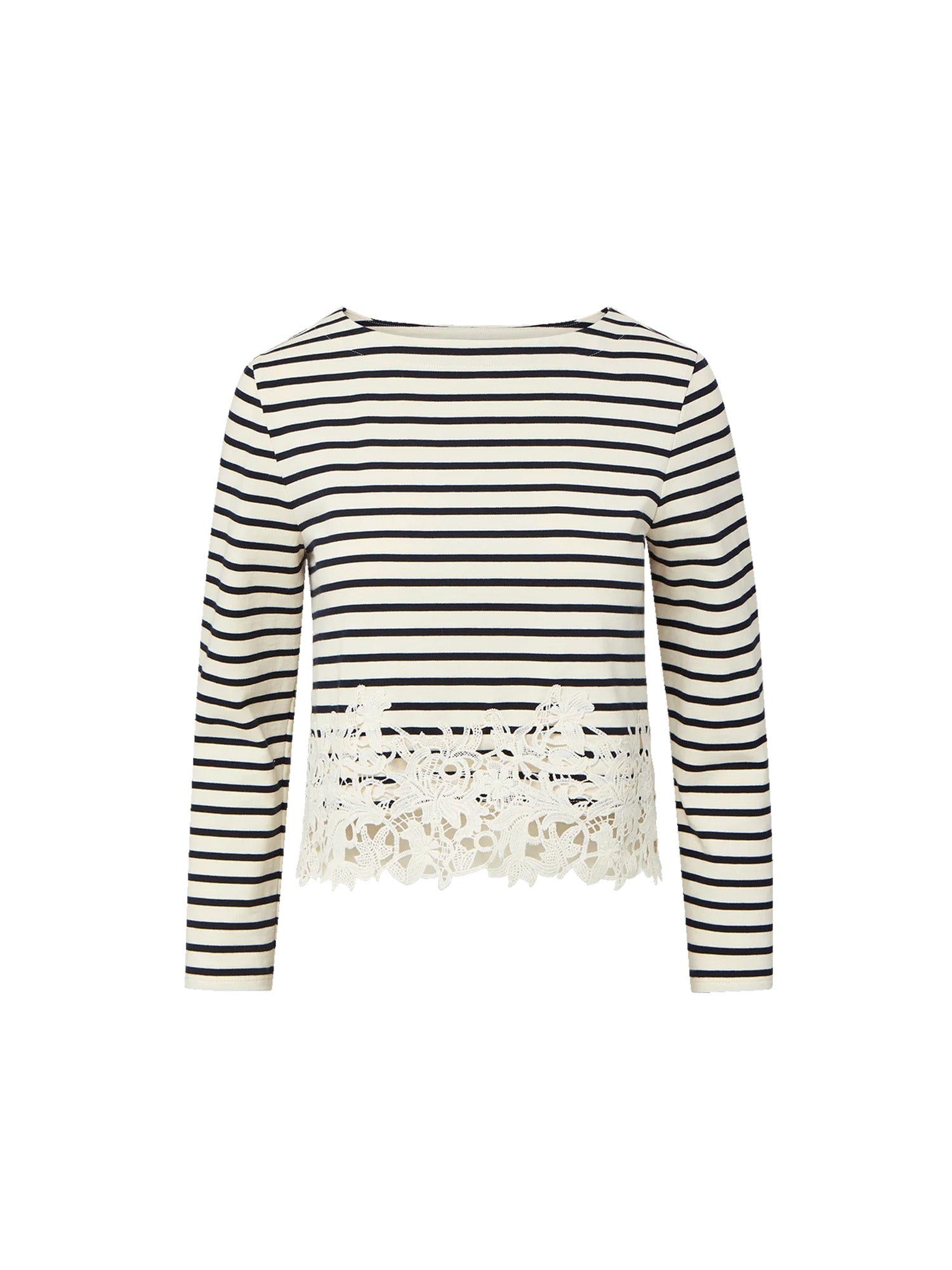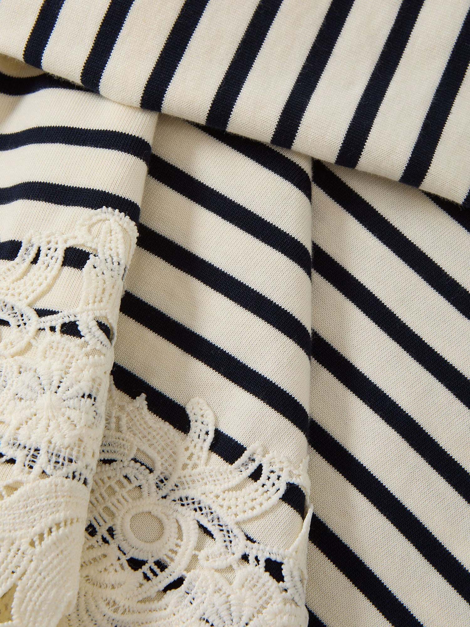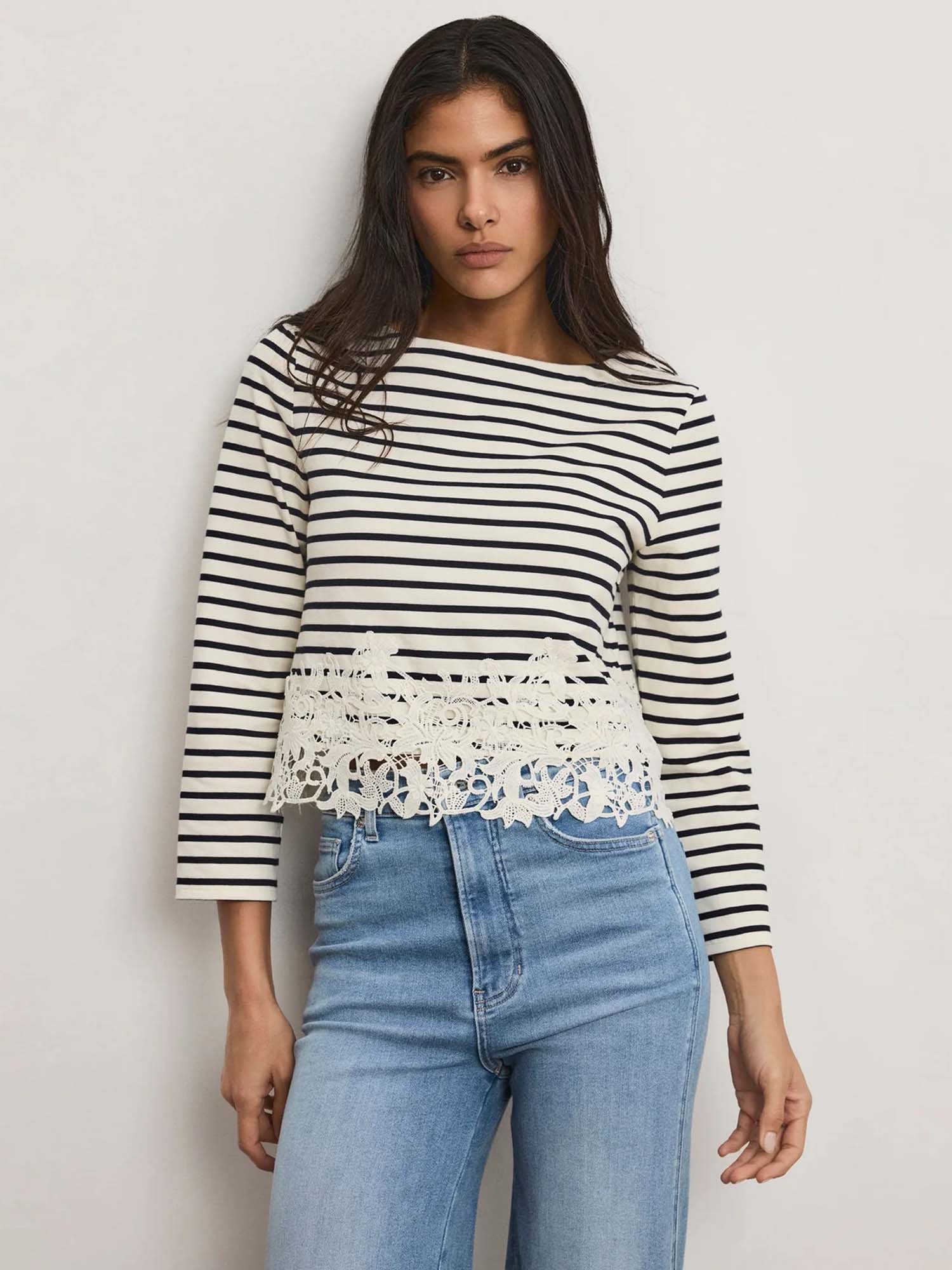 A feminine take on nautical stripes. Made from soft cotton jersey, the navy-and-white Hovey T-shirt is a long-sleeve marinière top with a band of floral lace at the hem. The clean, casual silhouette keeps it versatile and wearable while the embellishment adds interest without excess. Pair this striped top with jeans or tailored denim to elevate the everyday.