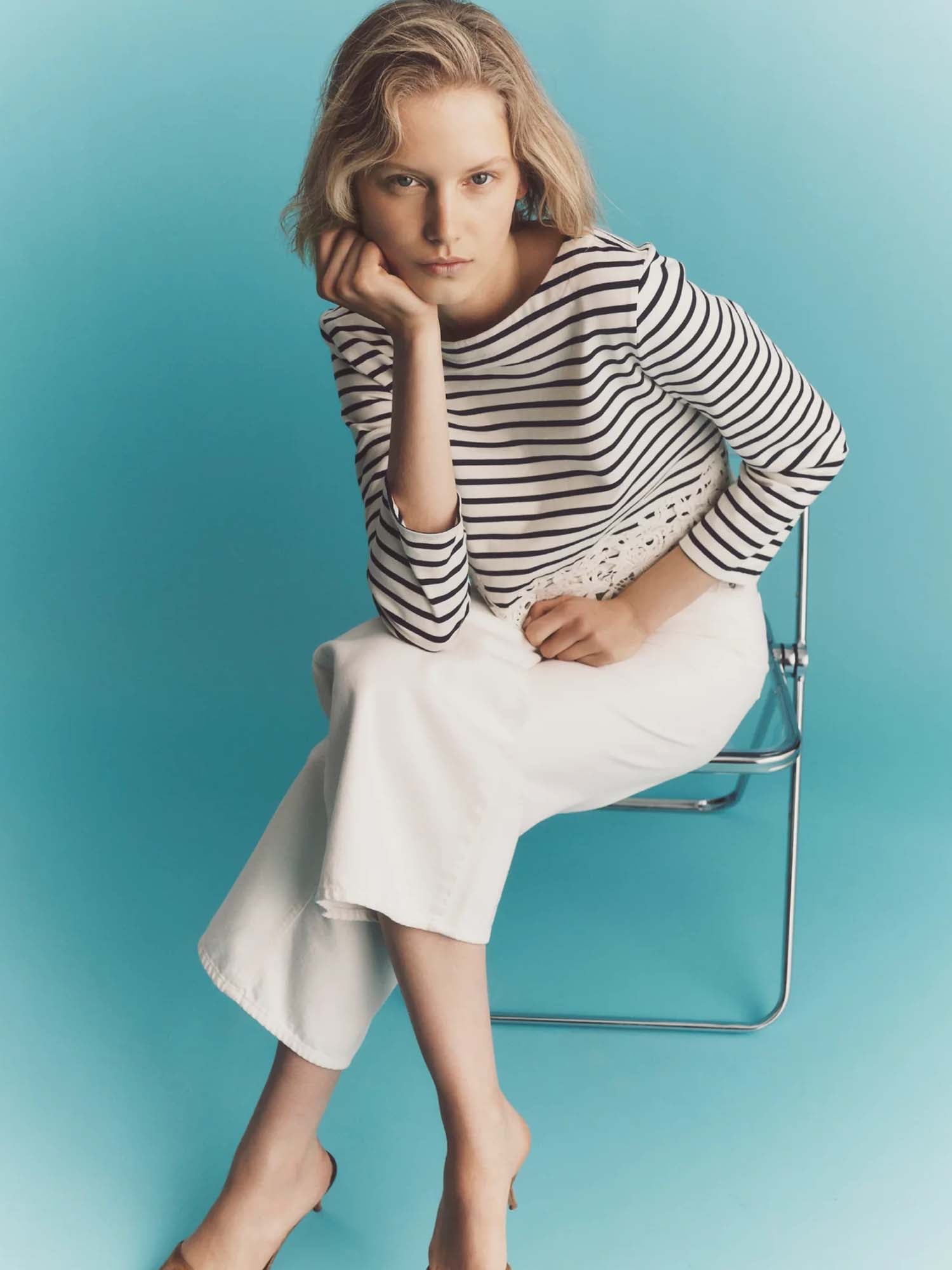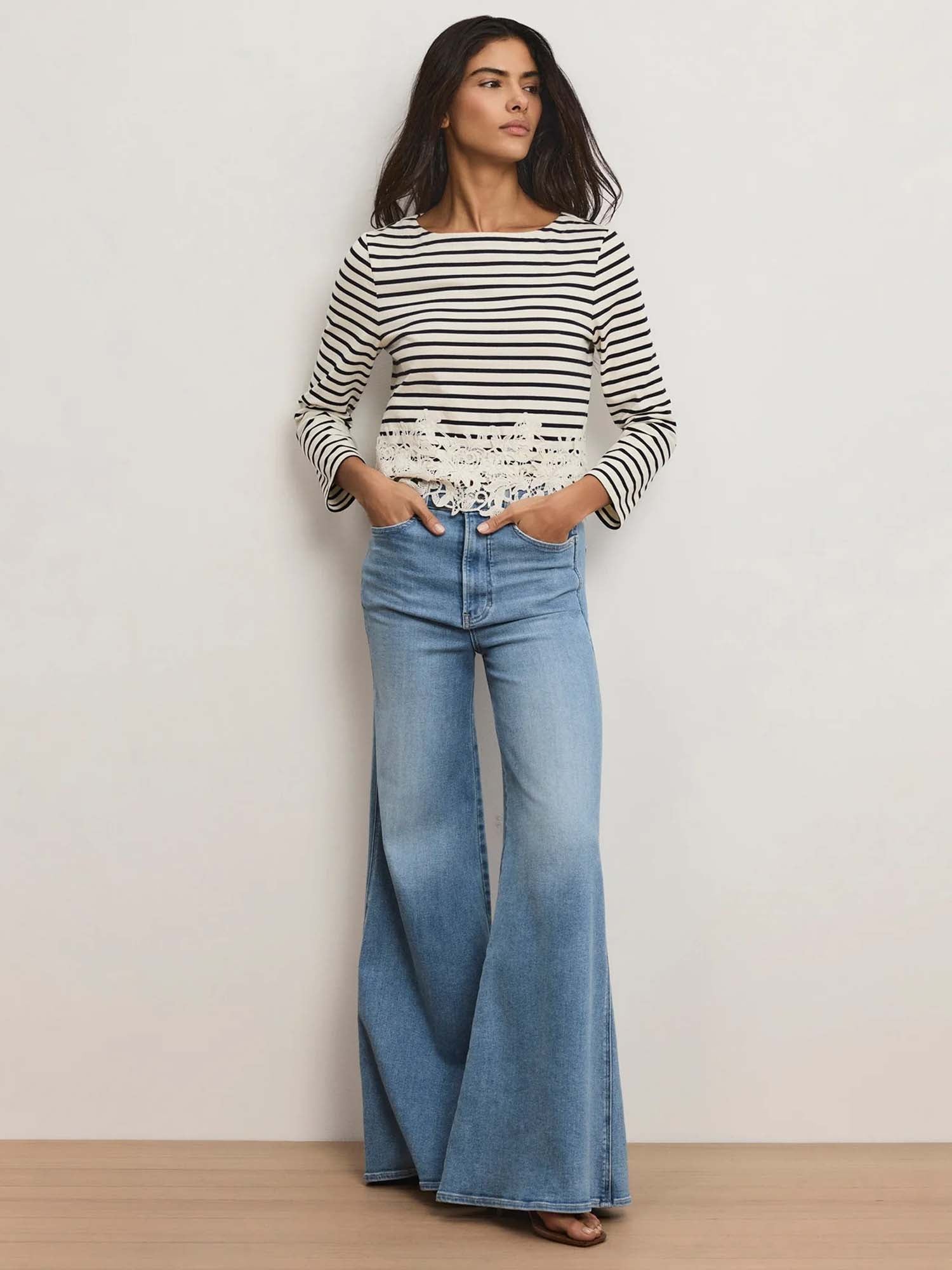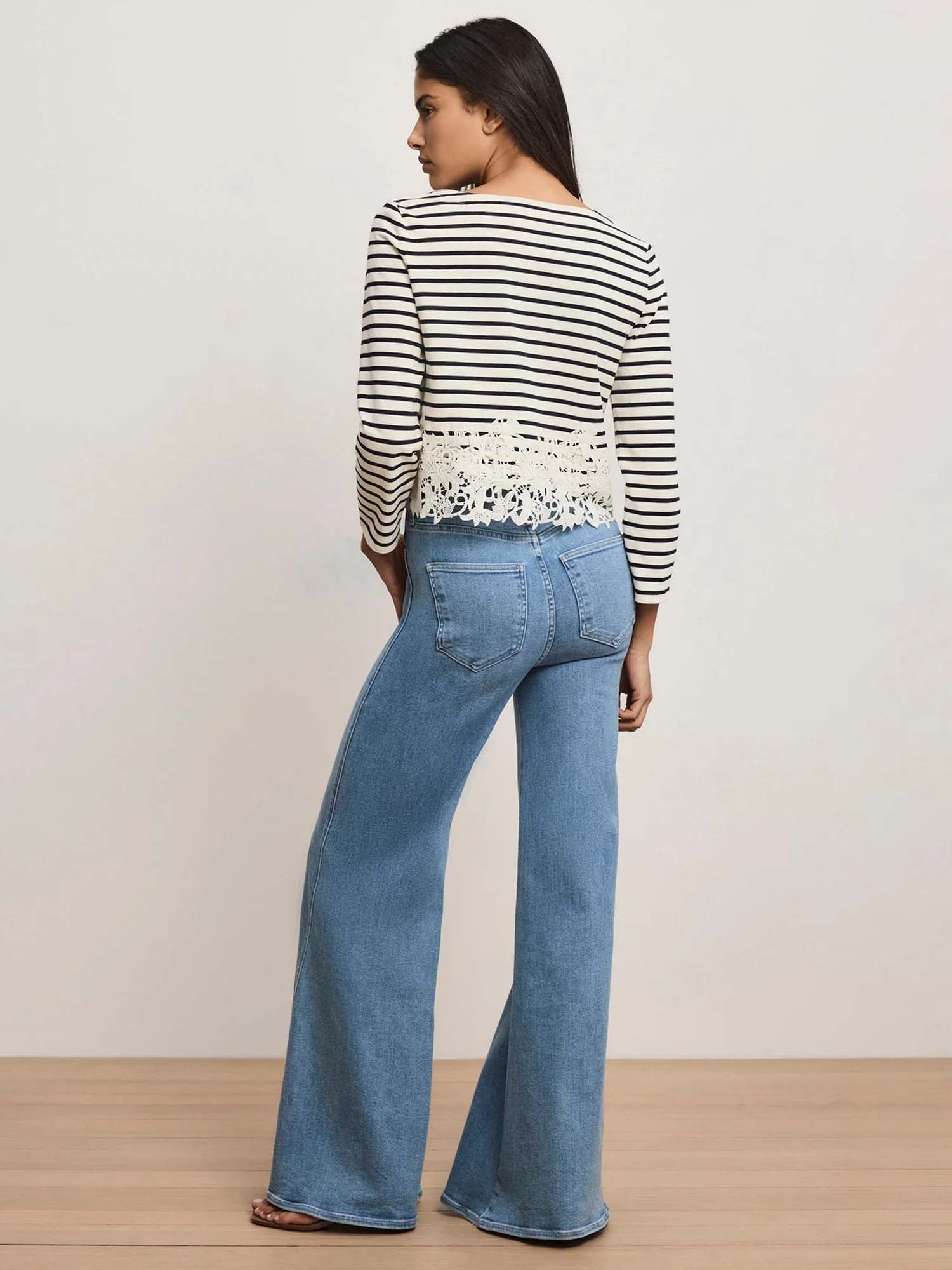 A feminine take on nautical stripes. Made from soft cotton jersey, the navy-and-white Hovey T-shirt is a long-sleeve marinière top with a band of floral lace at the hem. The clean, casual silhouette keeps it versatile and wearable while the embellishment adds interest without excess. Pair this striped top with jeans or tailored denim to elevate the everyday.