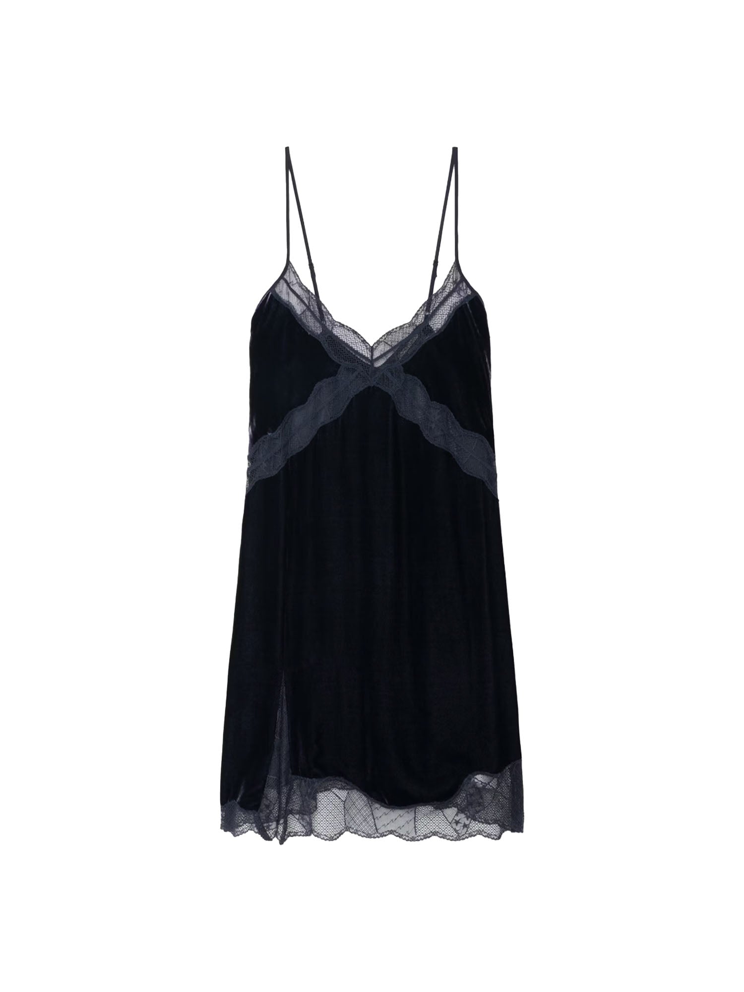 Short velvet dress with lingerie inspiration, featuring French lace insertion, side slit, and adjustable straps.