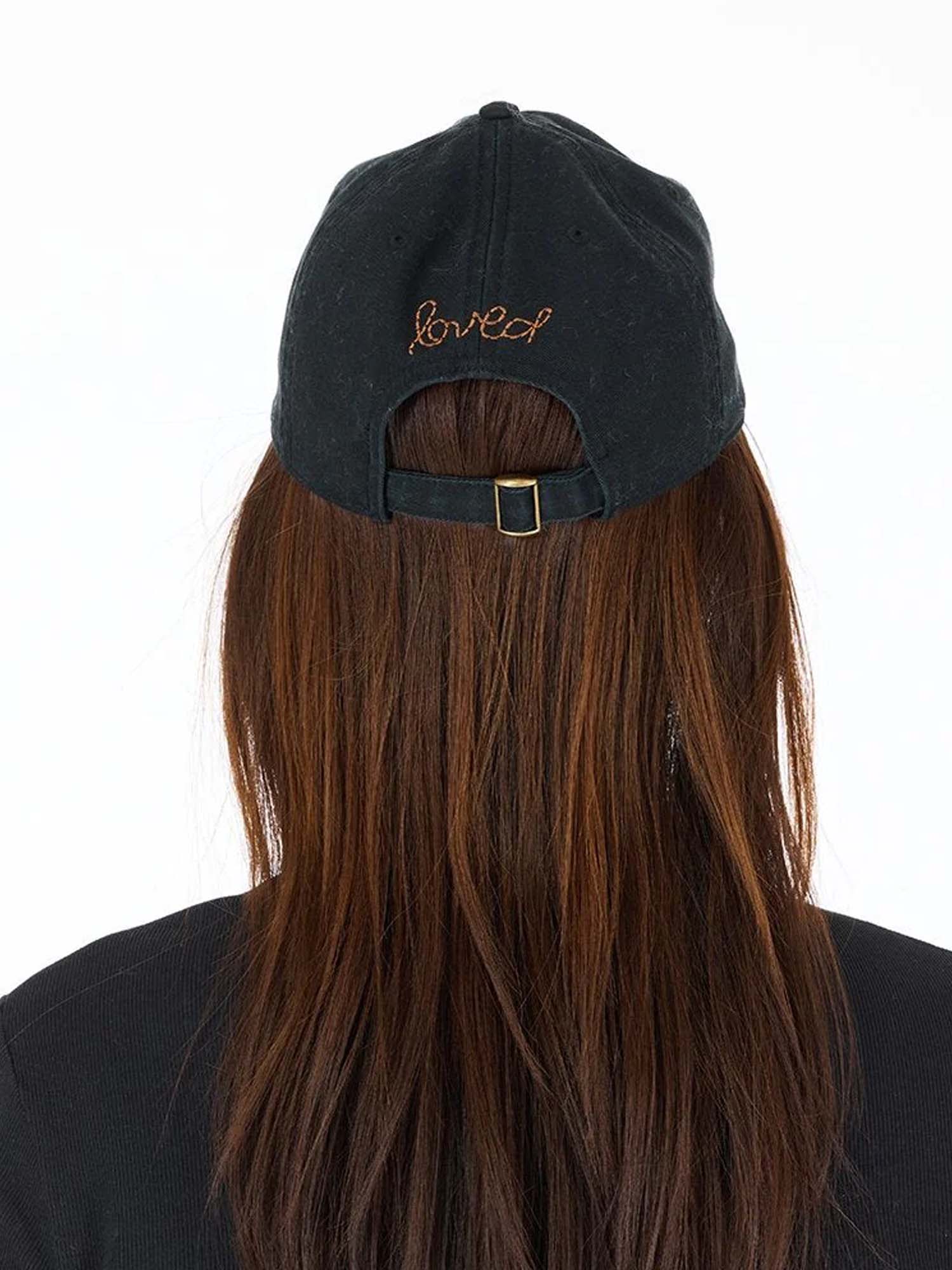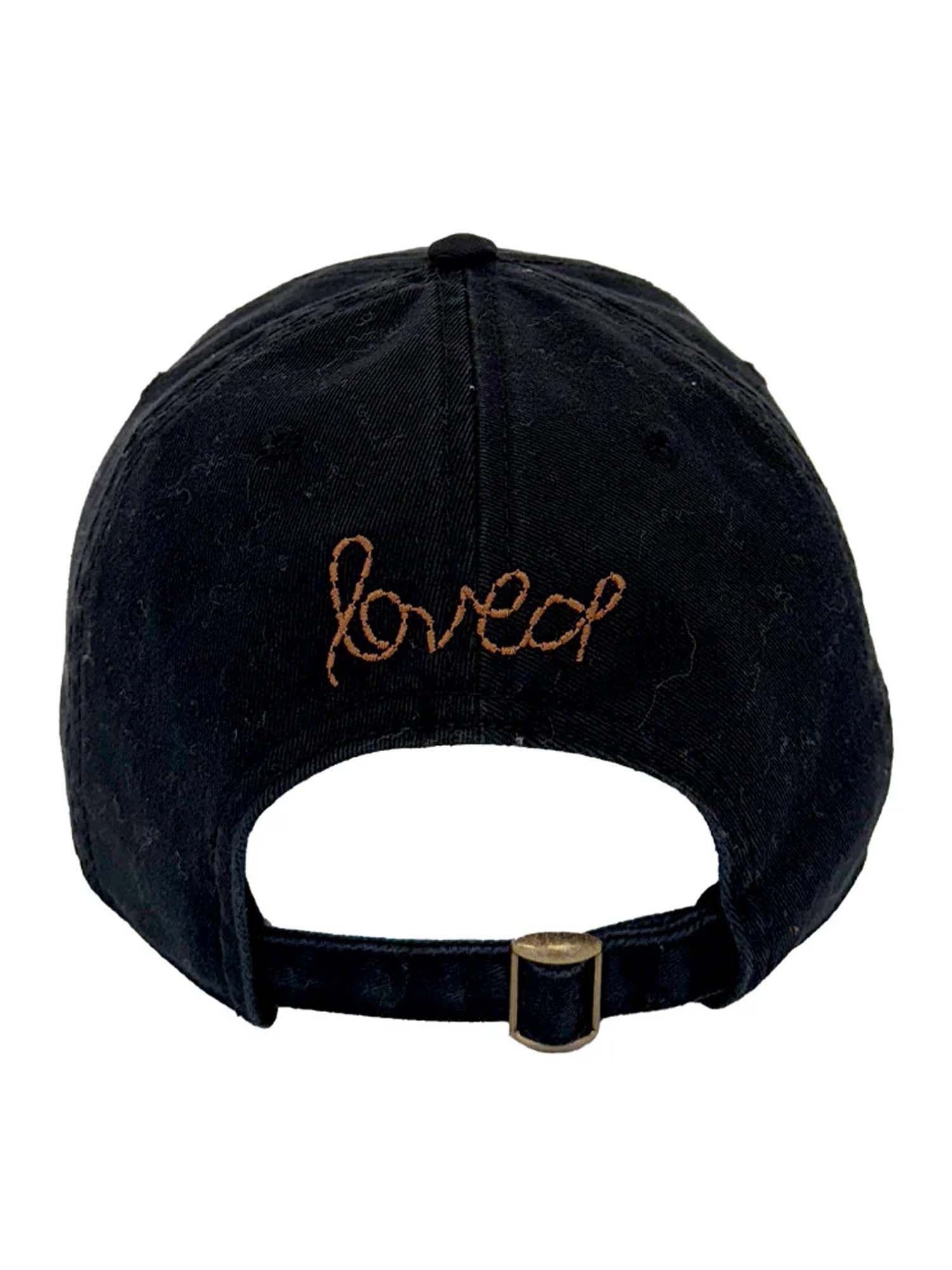 KR's Imperfect Heart Hat, made from cotton-twill in black with Kerri's Imperfect Heart patch in saddle leather, on the front and her embroidered 'loved' over the adjustable tab at the back. It'll make any outfit you style it with look effortlessly cool.