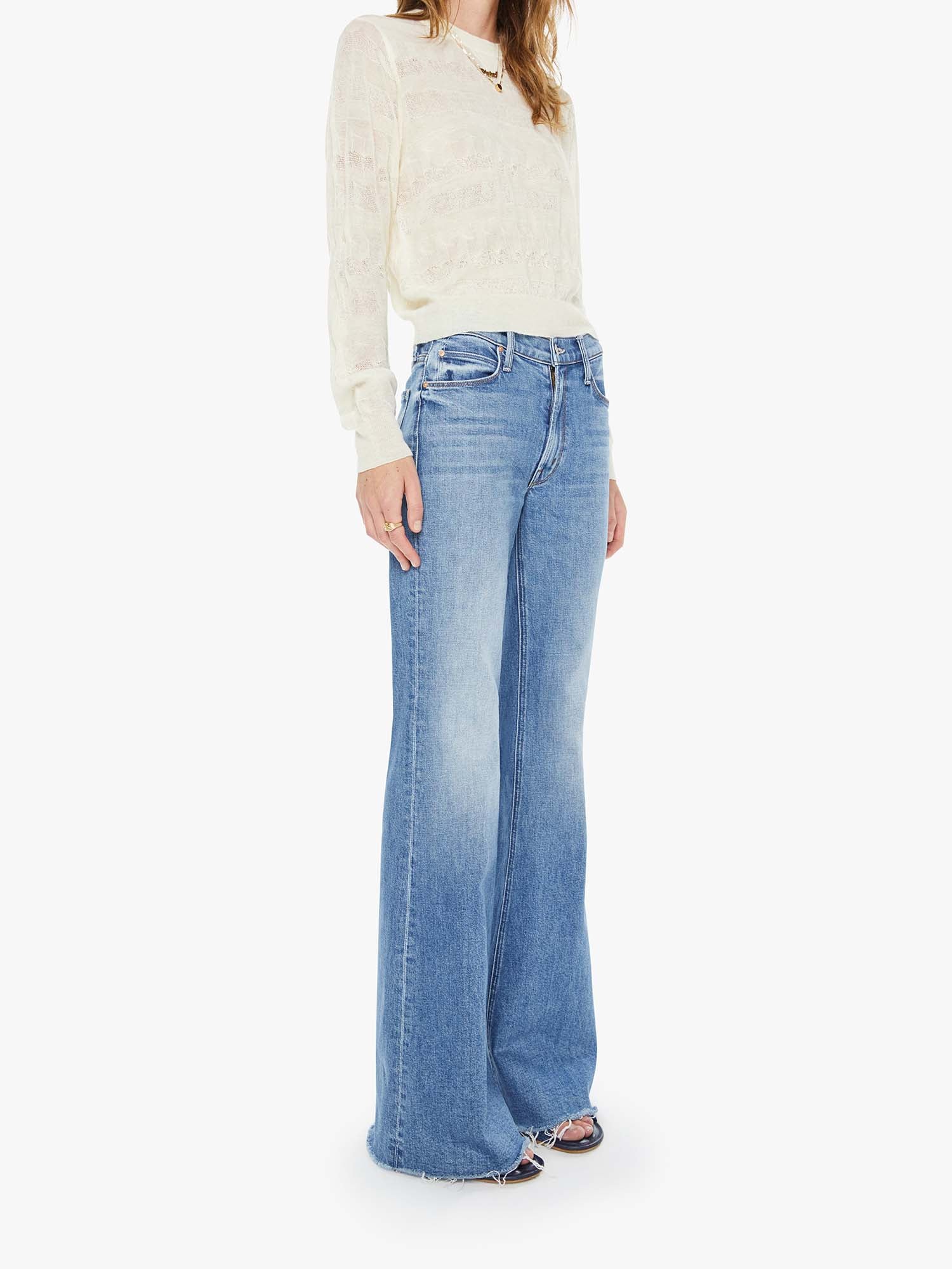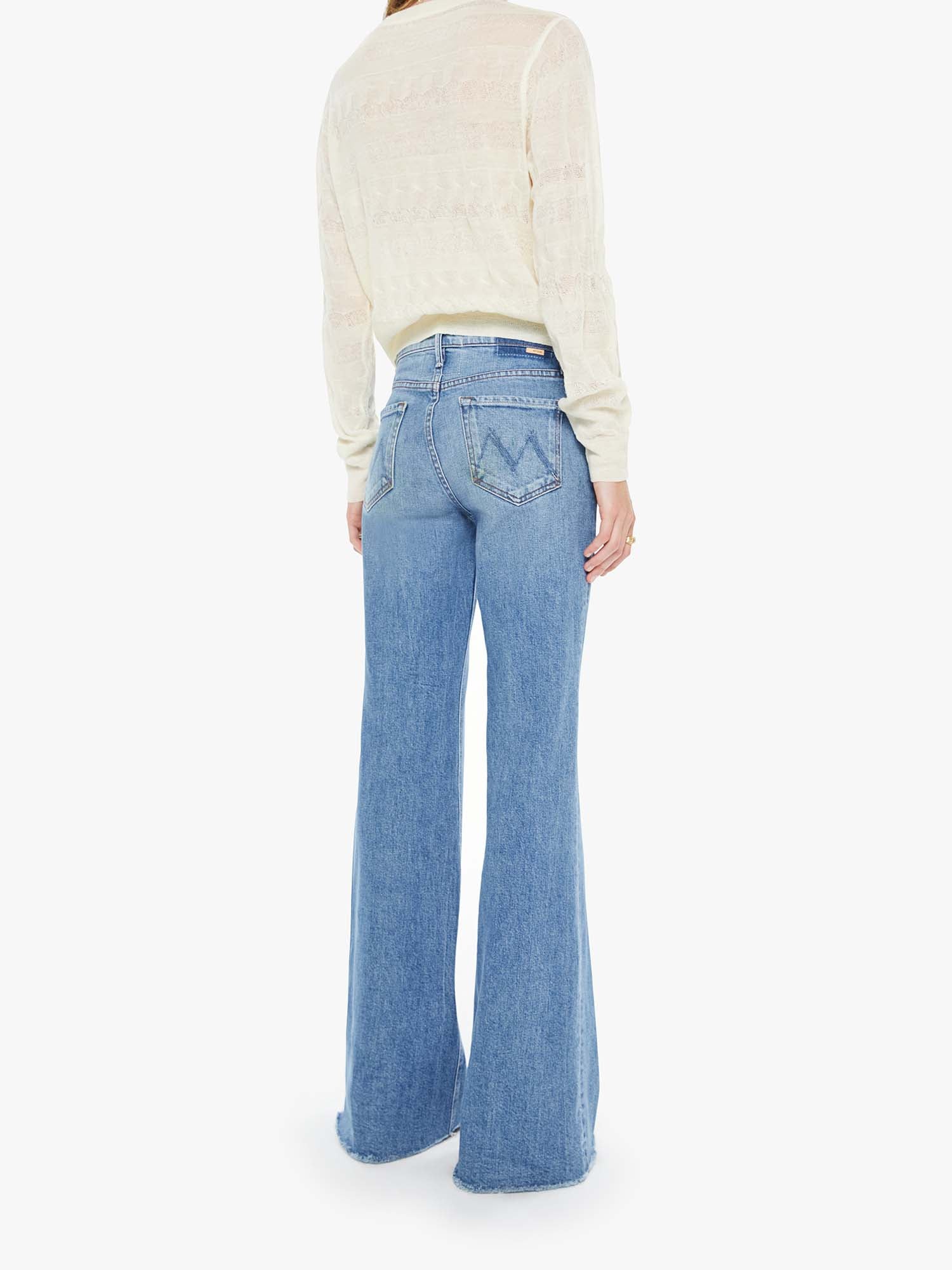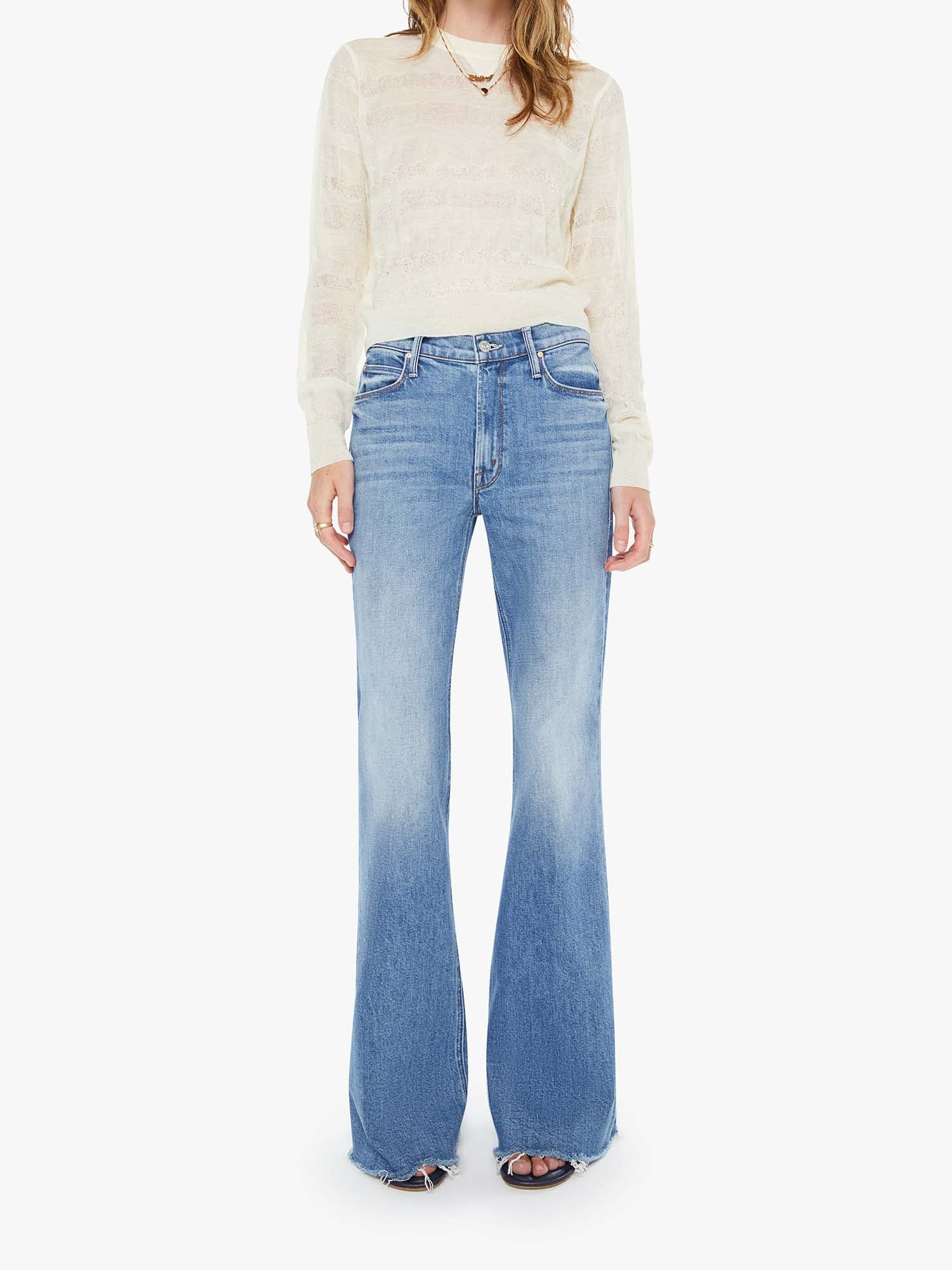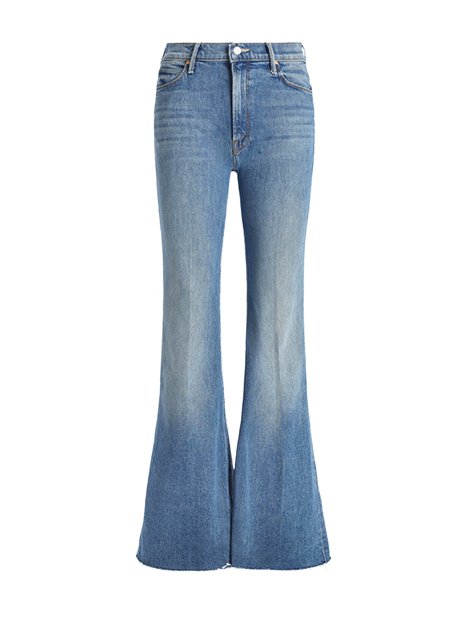 Fair and square. A high-rise flare with a zip fly, long 34-inch inseam and a frayed hem. Made from semi-rigid SUPERIOR denim, Heads Or Tails is a vintage blue with subtle whiskering and fading throughout.