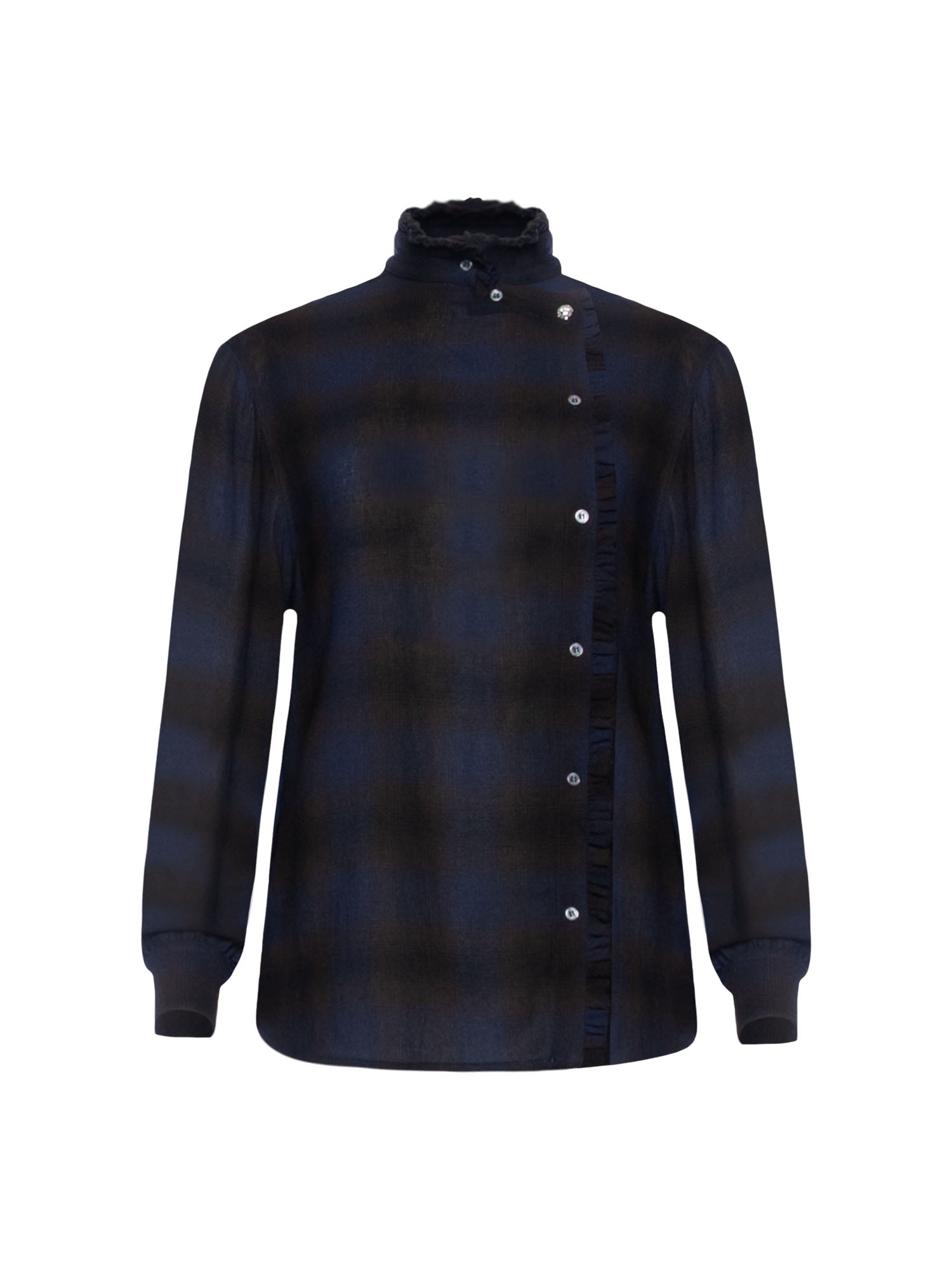 Shirt with side fastening and mini ruffles along the button placket. The garment features a raised collar with ruffles detail and long sleeves with cuffs closed by covered buttons. The fit is regular with a straight line and rounded bottom.