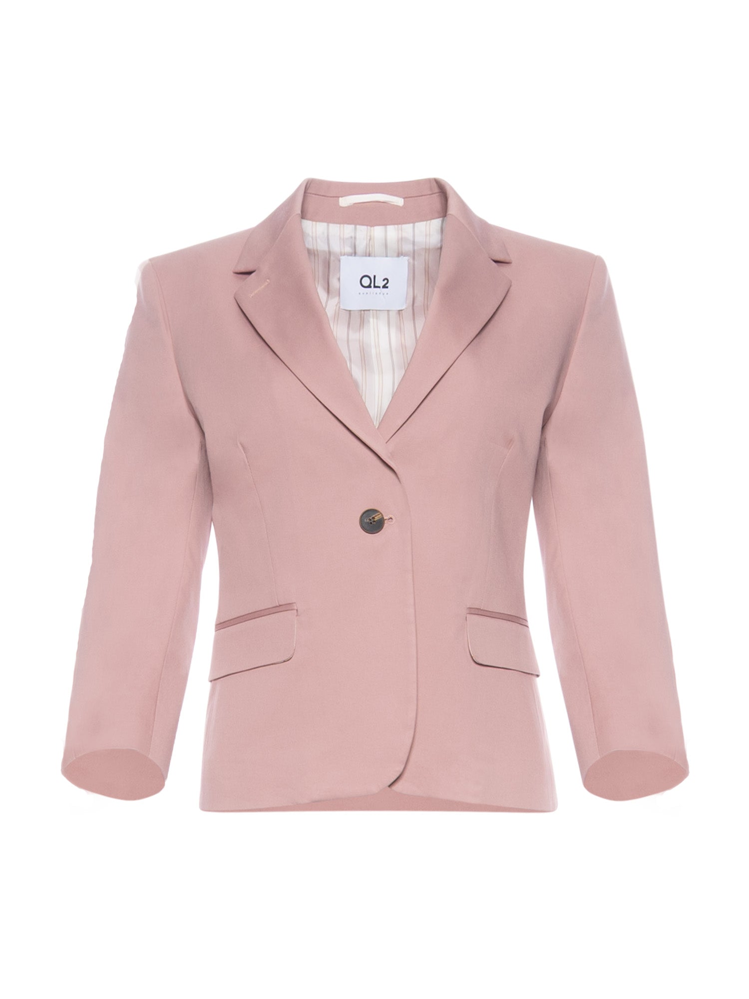 Single-Breasted Jacket, cropped style, with tuxedo trim pockets and tortoise-shell style button-closure.