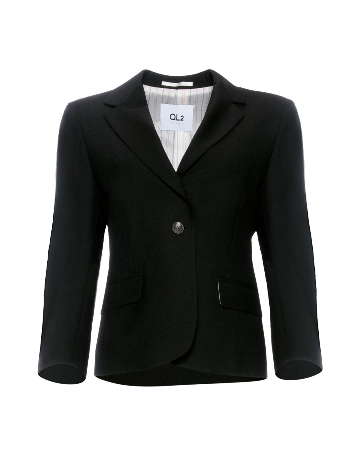 Single-Breasted Jacket, designed for fit just above the hip, with pockets and tortoise-shell style button-closure.