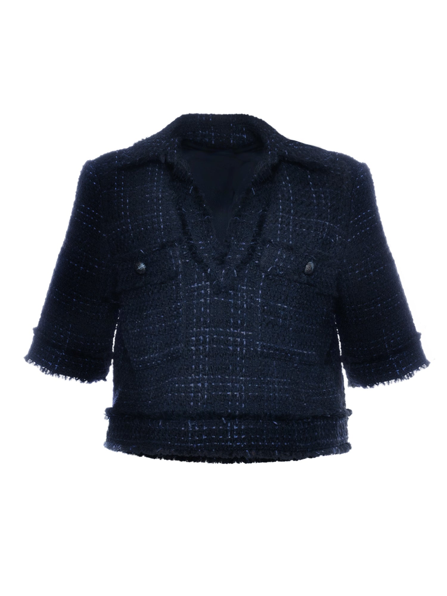 Lightweight tweed. Expertly tailored from Italian stretch cotton, the navy and white features a boxy, cropped fit and an elevated design. Pair with jeans to elevate the everyday or style with our matching short for an elegant night out.