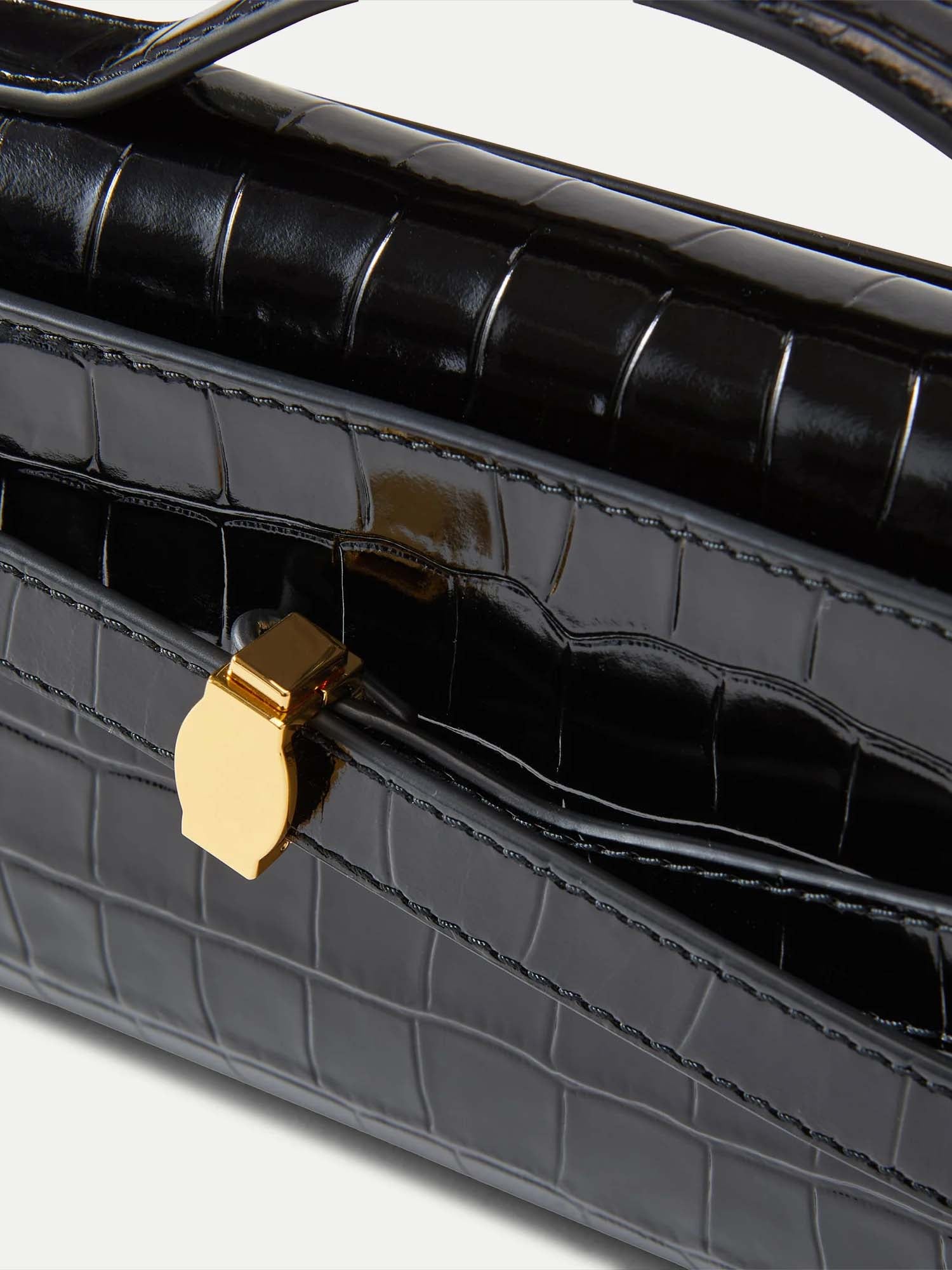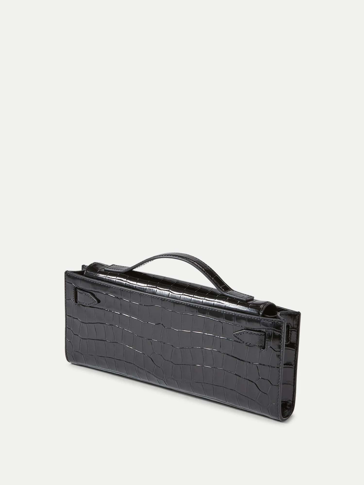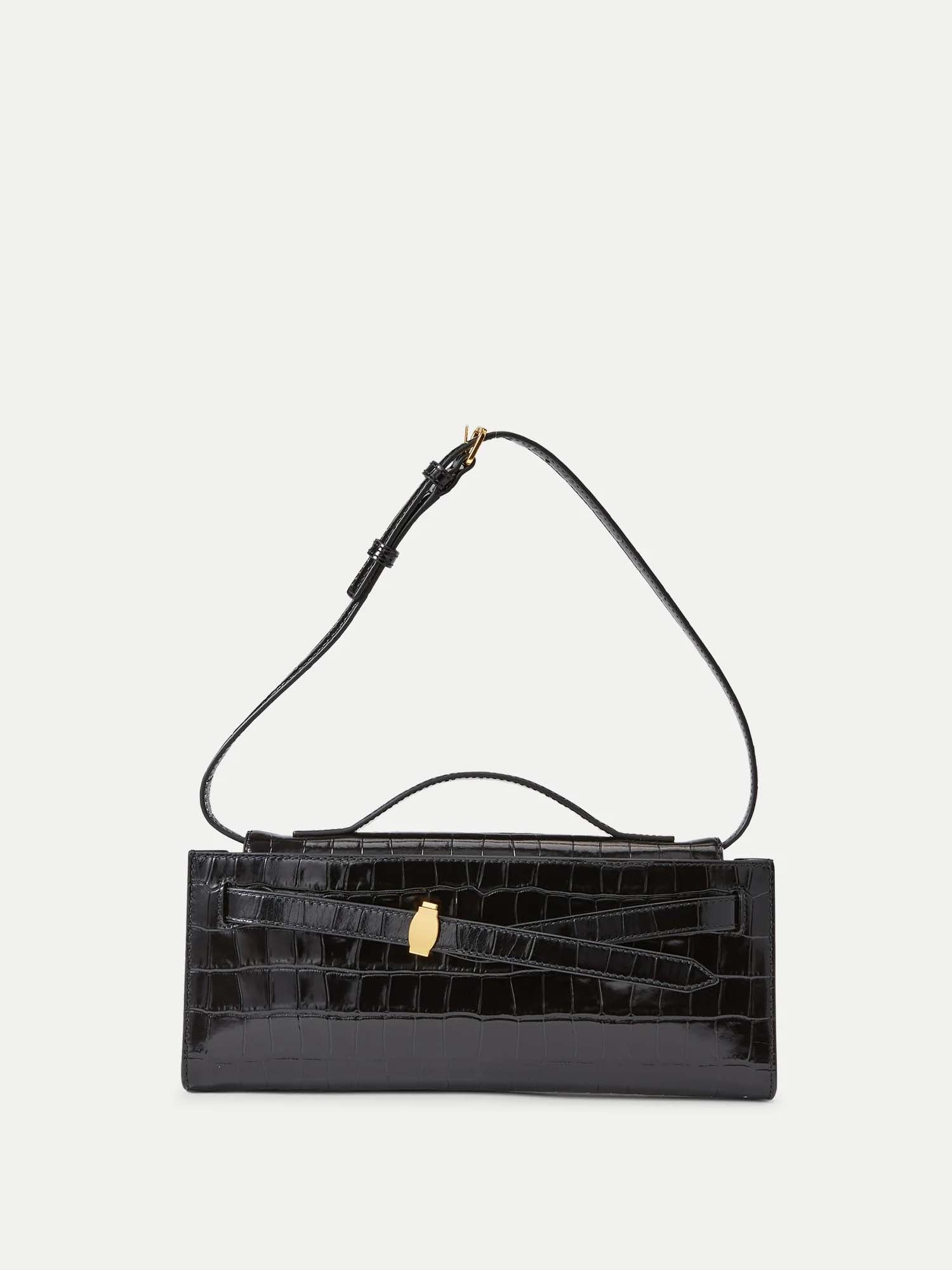 Our iconic Dash bag, now as a clutch. Crafted from black croc-embossed leather with subtle shine, it carries the essentials you need—including the largest iPhone—and features a slim top handle and an adjustable belted strap. An interior zip pocket keeps cash and credit cards organized and secure, while the removable suede strap adds hands-free versatility.