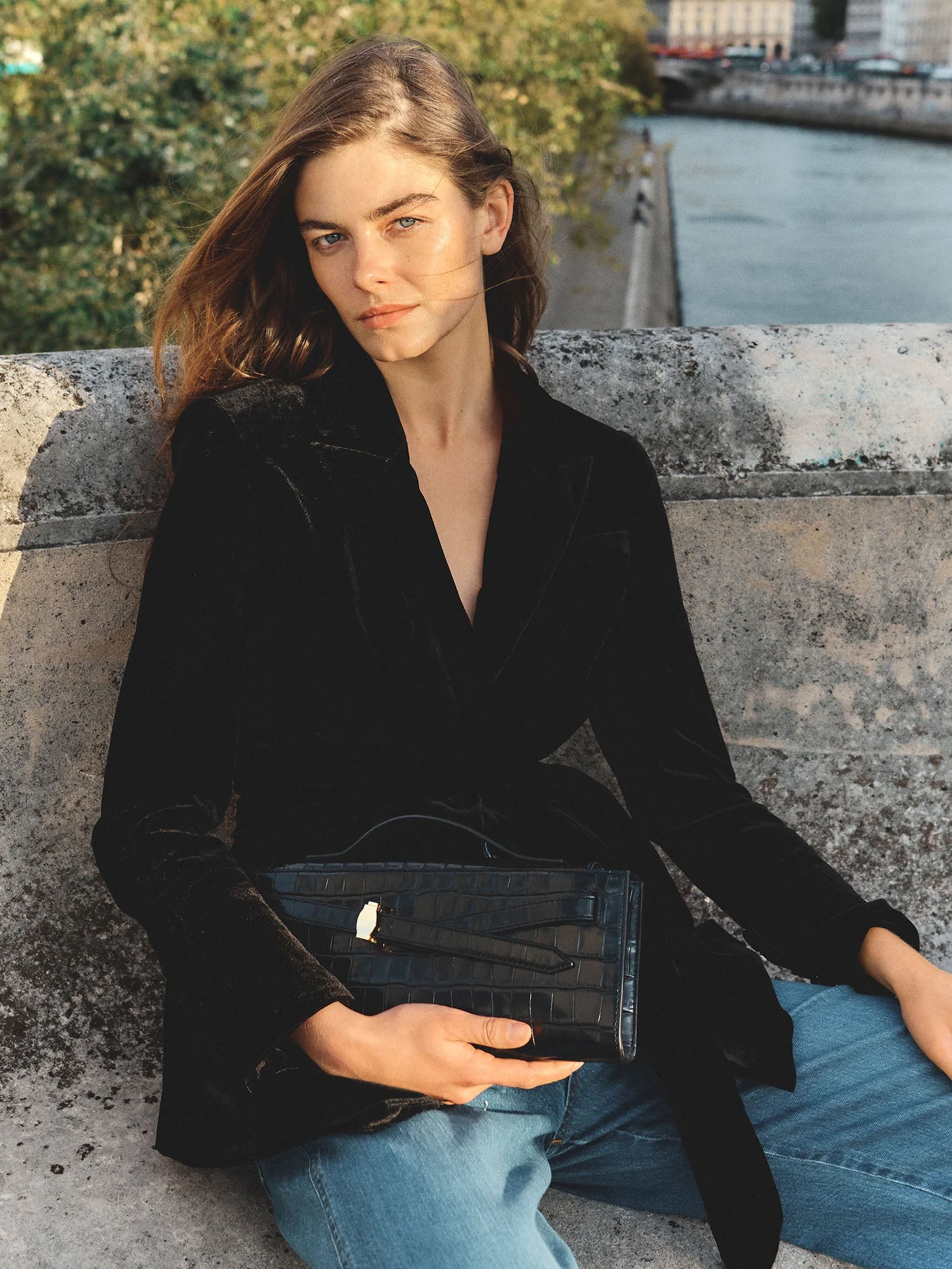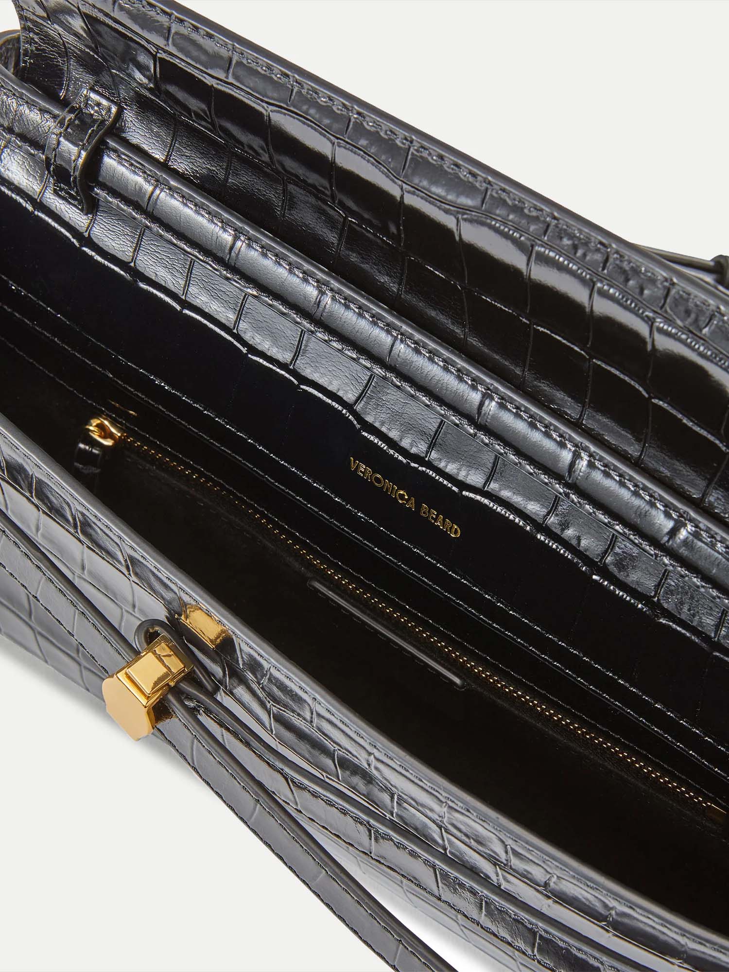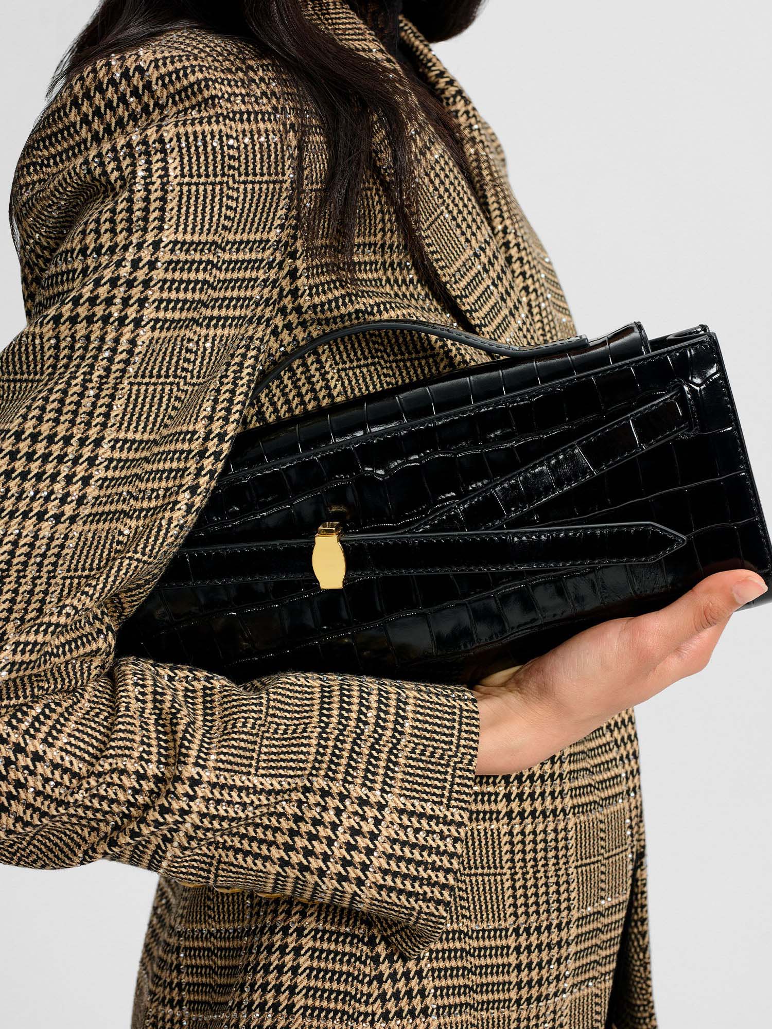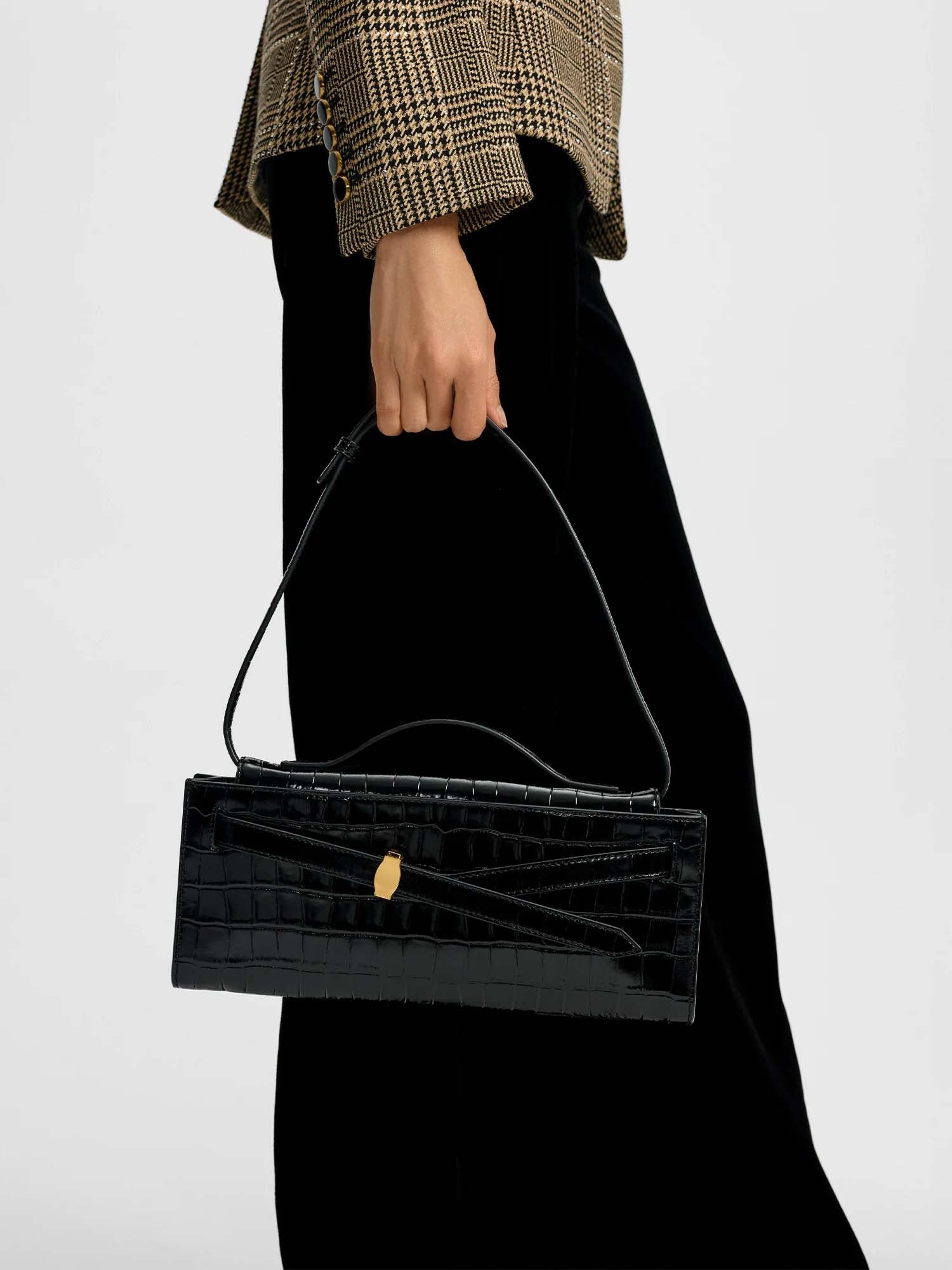 Our iconic Dash bag, now as a clutch. Crafted from black croc-embossed leather with subtle shine, it carries the essentials you need—including the largest iPhone—and features a slim top handle and an adjustable belted strap. An interior zip pocket keeps cash and credit cards organized and secure, while the removable suede strap adds hands-free versatility.