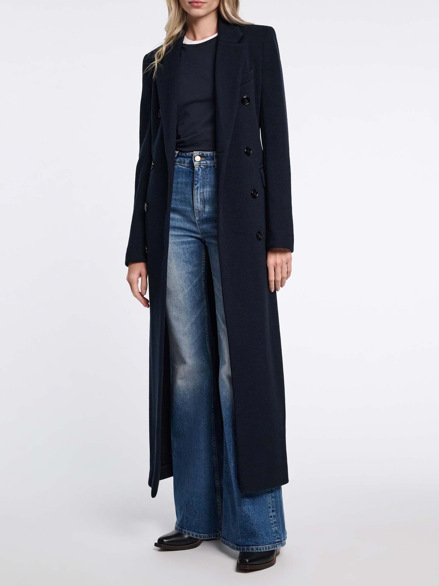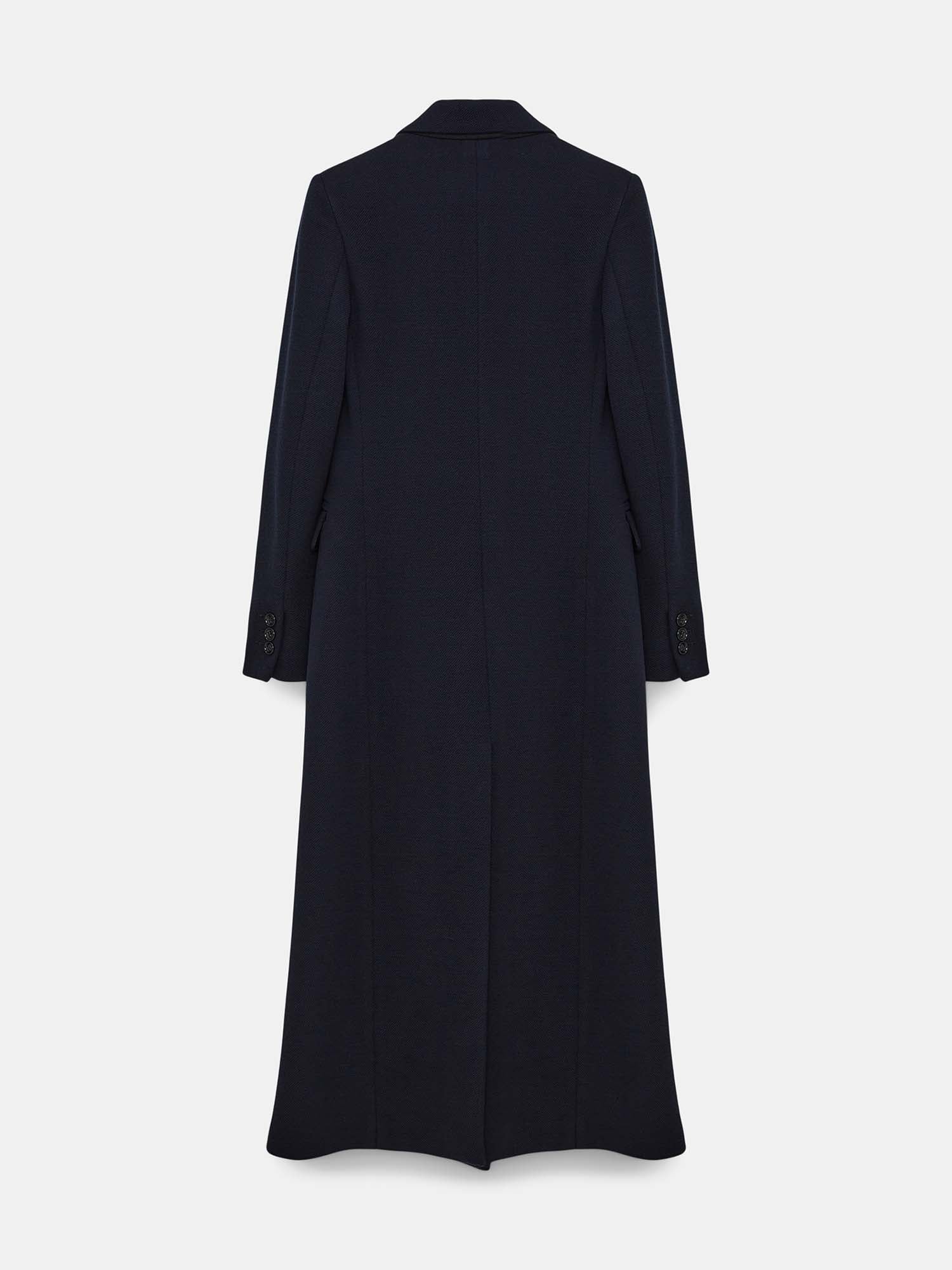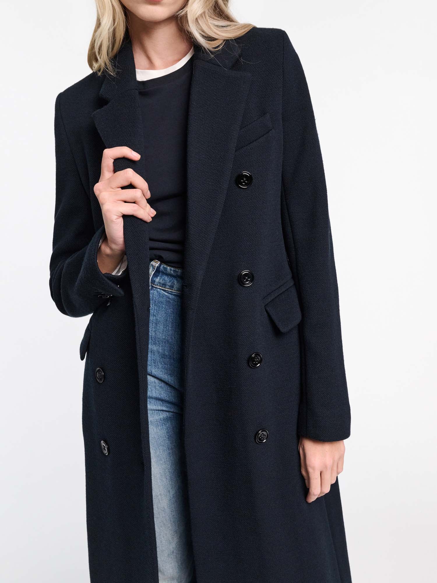 An elegant top layer, the double-breasted coat is styled in wool with stretch for the perfect, figure-hugging silhouette. It's longer length looks flawless atop pants and dresses alike.