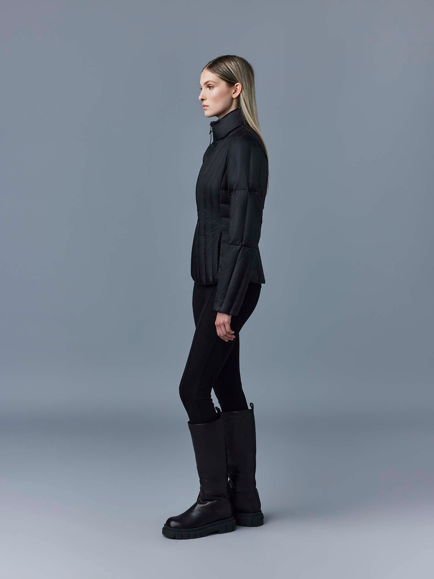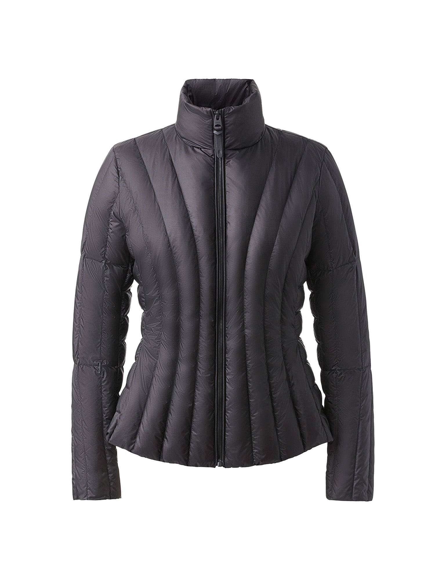 LANY is a lightweight down jacket for women featuring modern vertical quilting. The form-fitting silhouette is made from a translucent ripstop material and detailed with a stand collar and hidden zippered waist pockets. Featuring signature ultra-lightweight insulation, it is a windproof, water-repellent, and machine-washable multi-season piece.