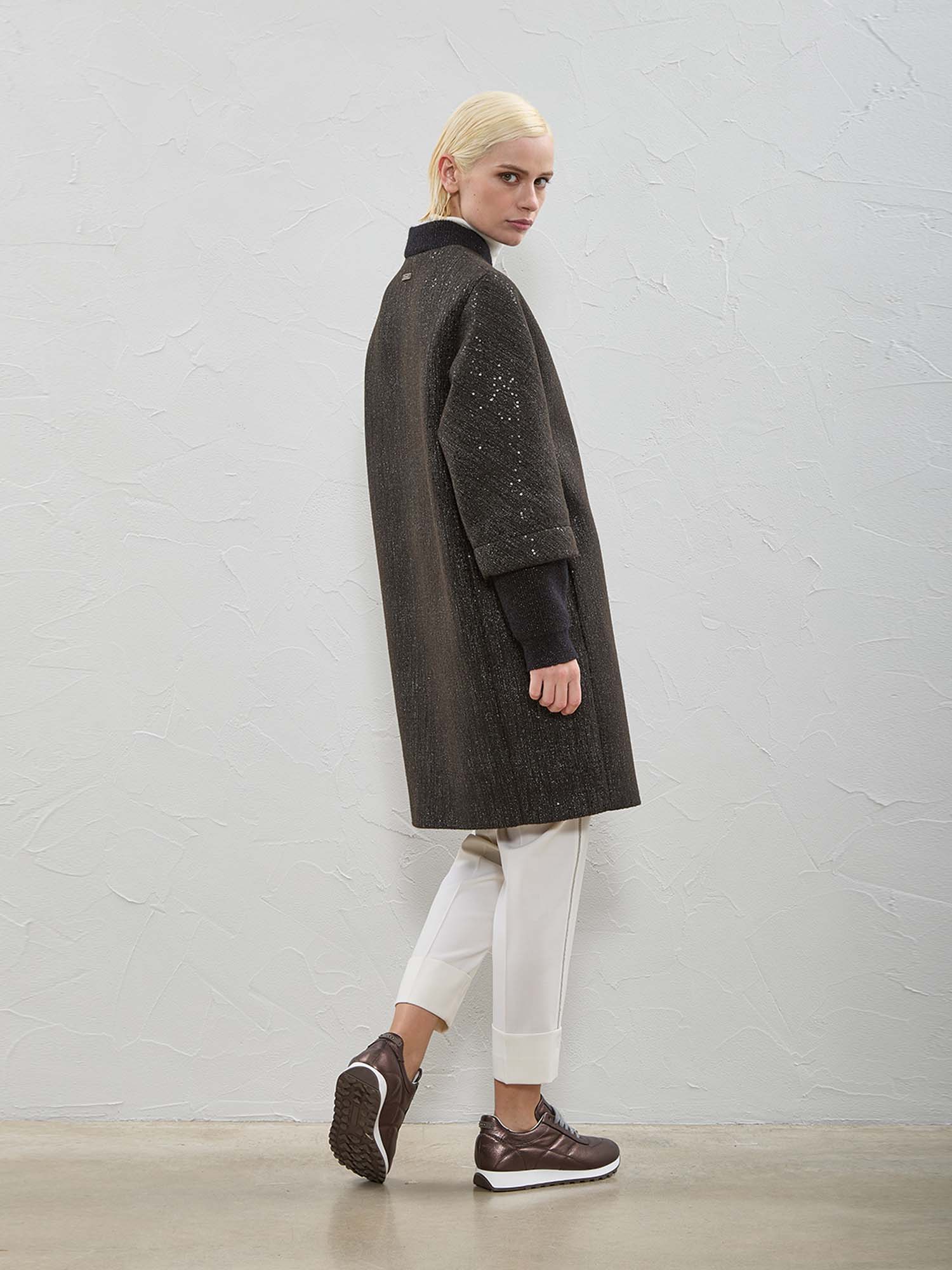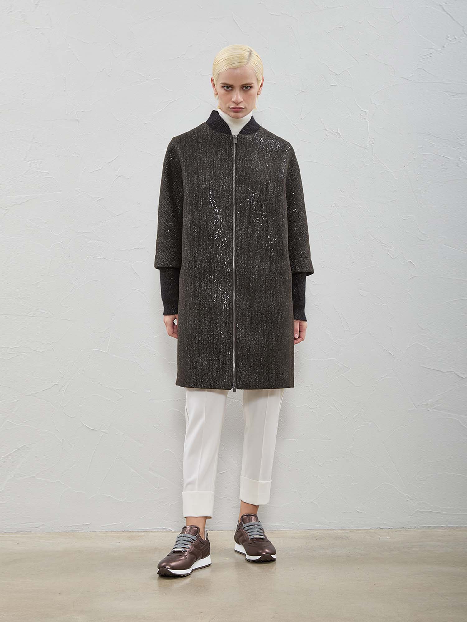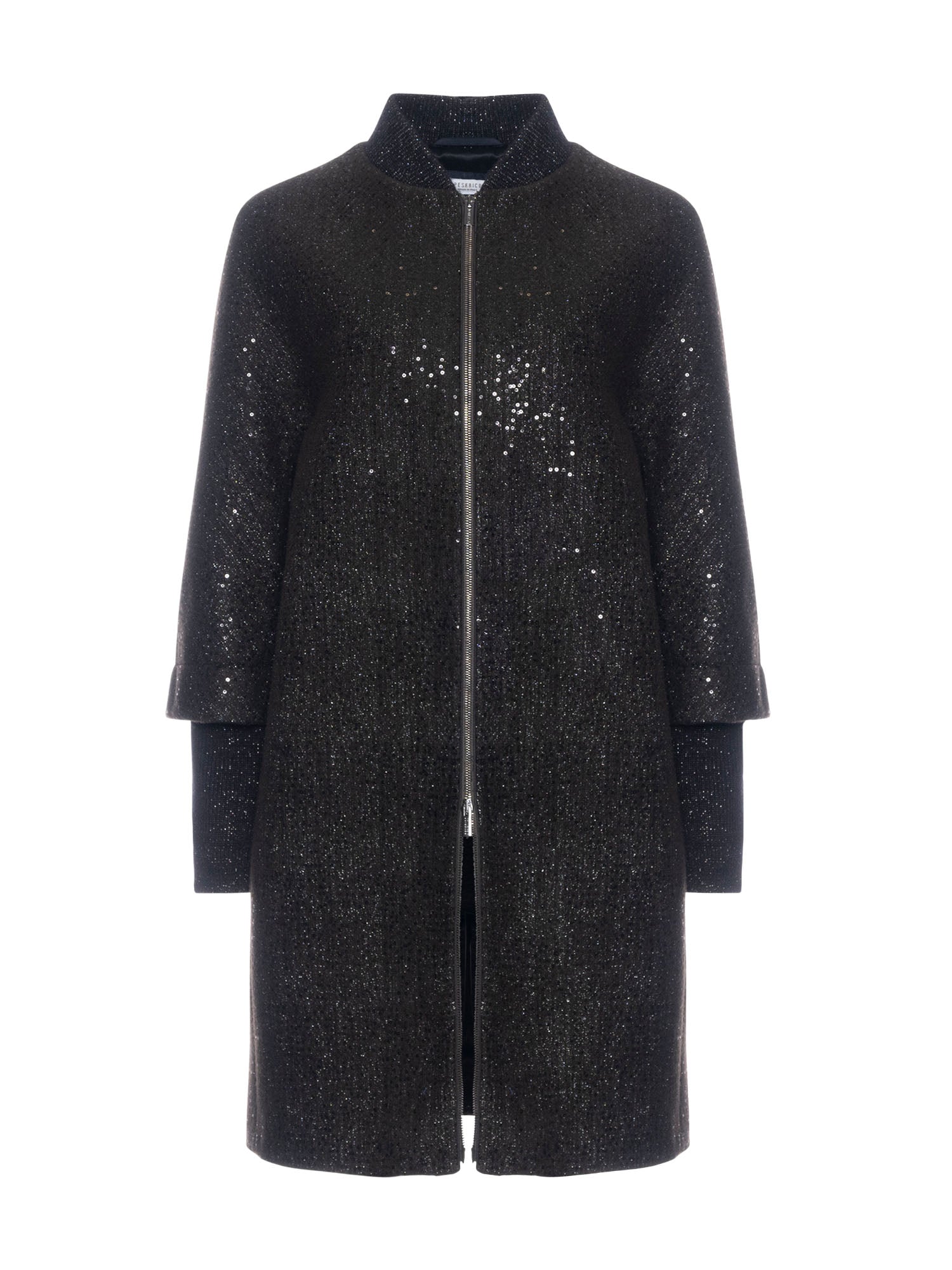 Zipped jacket in soft jersey cloth given a sparkling frosted effect by the addition of lurex and transparent sequins. The casual bomber jacket collar and knitted lurex hand warmers juxtaposed with generous volume with kimono sleeves make this a sophisticated, stylish piece. In-seam side pockets and zip closure.