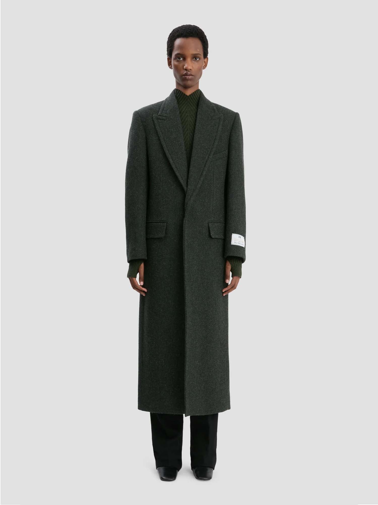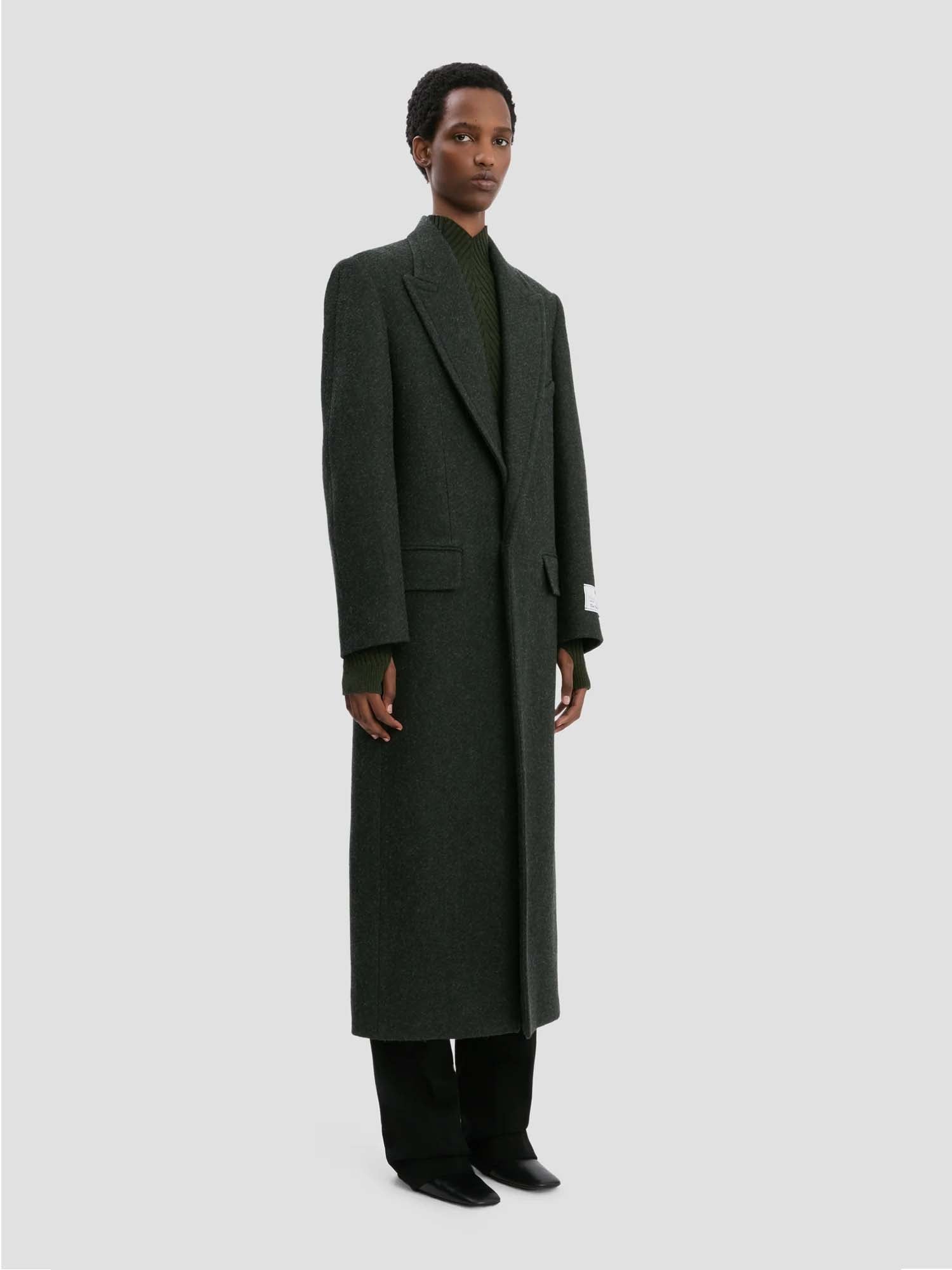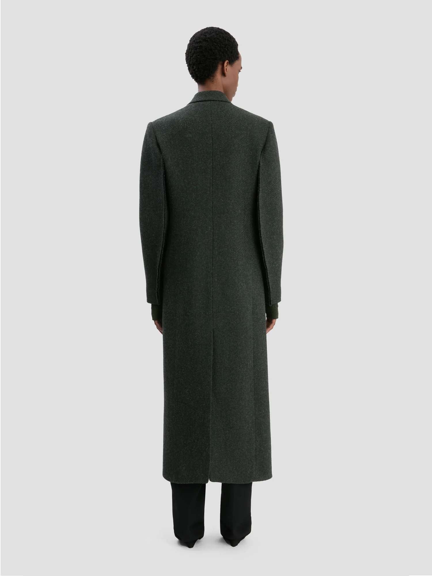 A curved, wide sleeve with raw edge detailing brings contemporary flair to this meticulously tailored overcoat. With a longline, calf-length design and single-breasted fit, it offers a streamlined silhouette, while stitch detailing on the collar and lapel add visual interest. Pocket flaps and a back vent opening complete the look.