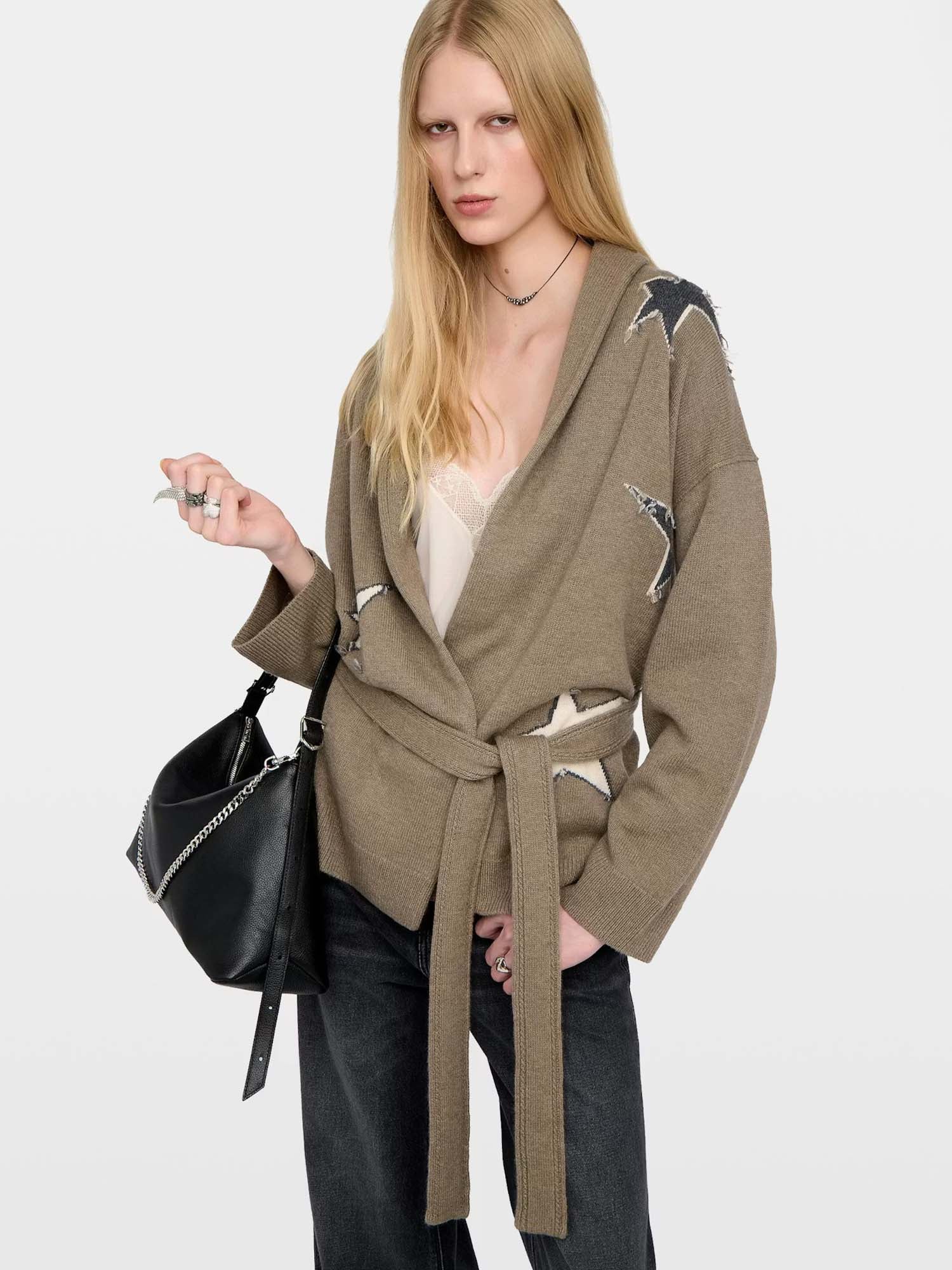 A mid-length cardigan coat crafted from a luxurious merino wool and cashmere blend, featuring bold intarsia star detailing. Designed with a V-neck, double-breasted silhouette, and belt closure for a refined yet effortless finish.