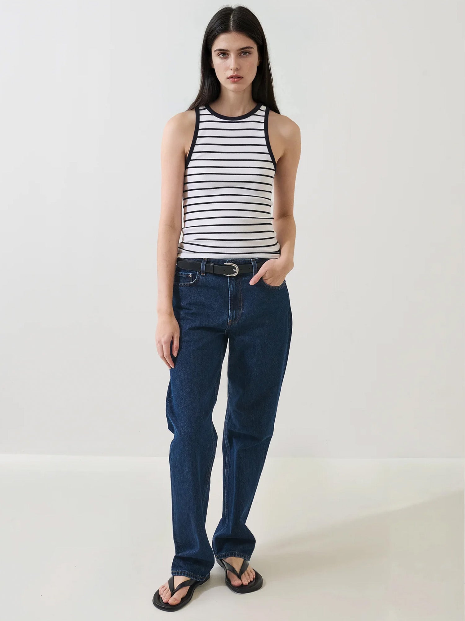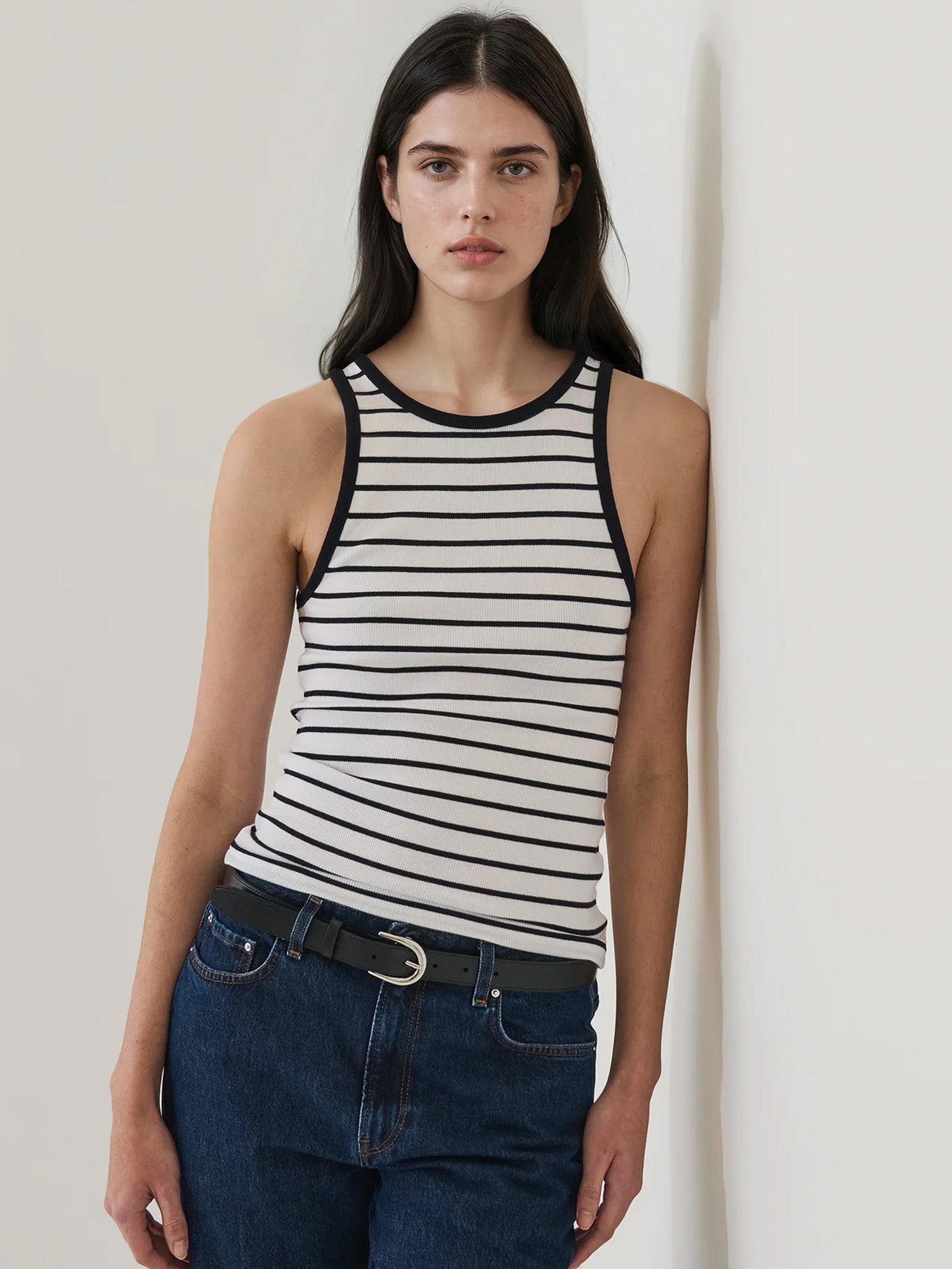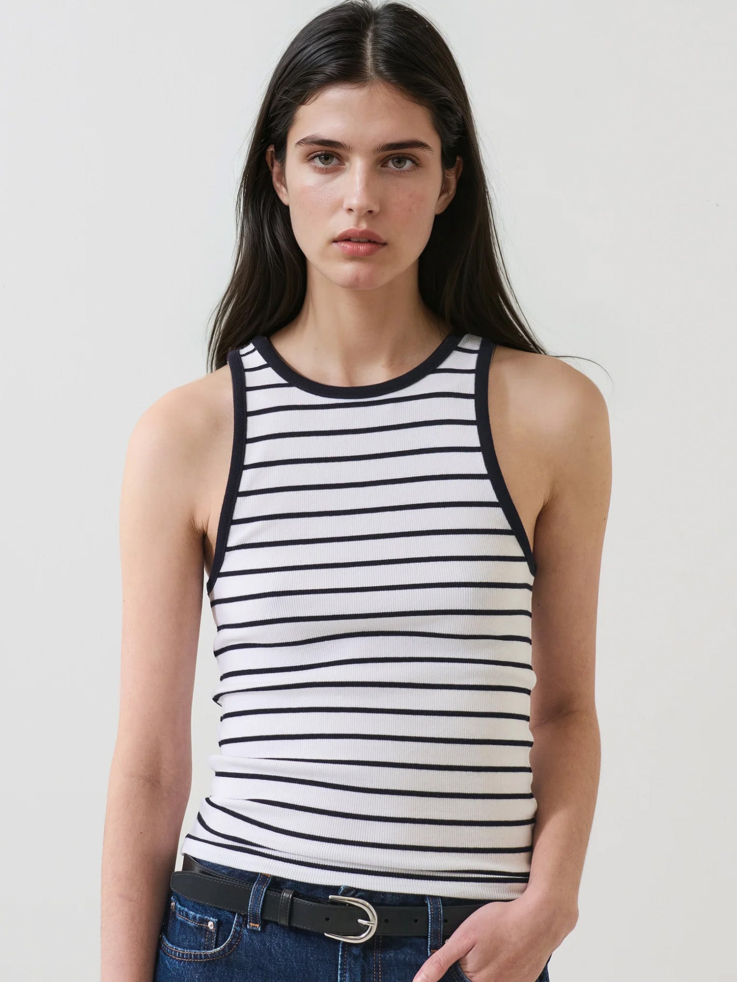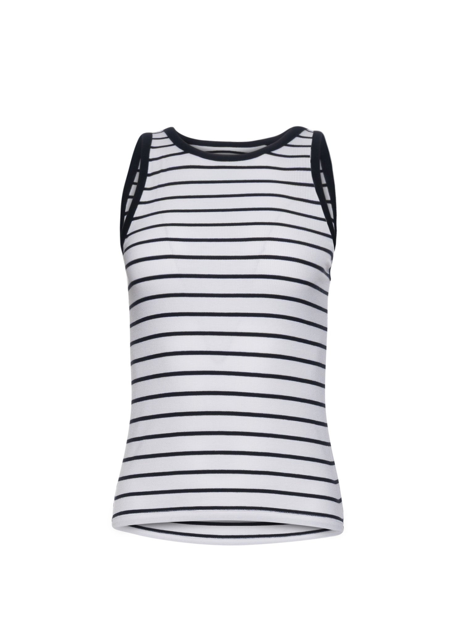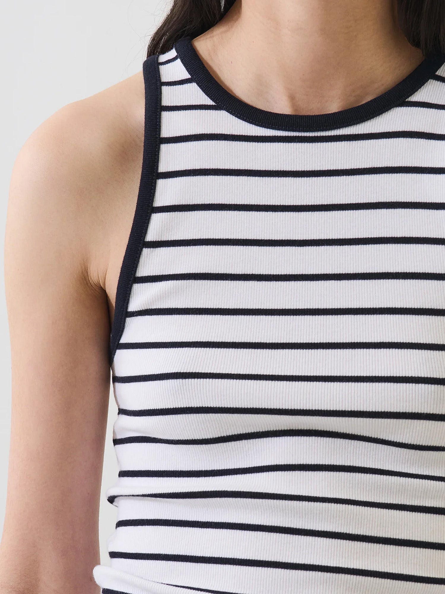 Our high-neck rib tank is made from a luxuriously soft Peruvian pima cotton-blend. Offered in a timeless stripe, this flattering silhouette is designed for a slim fit featuring a high crew neck and curved straps.