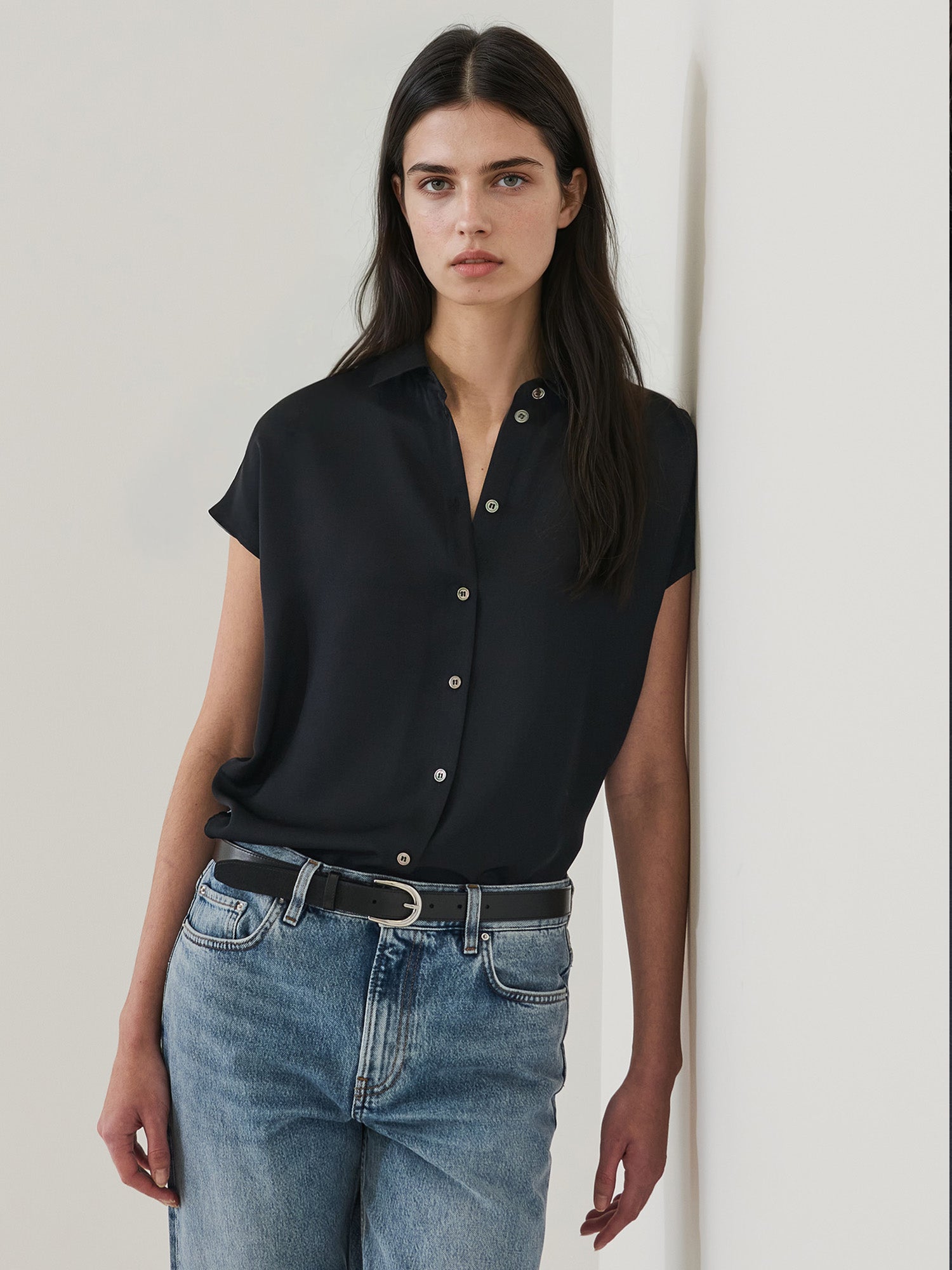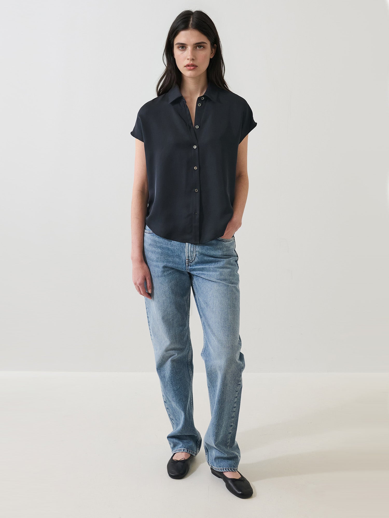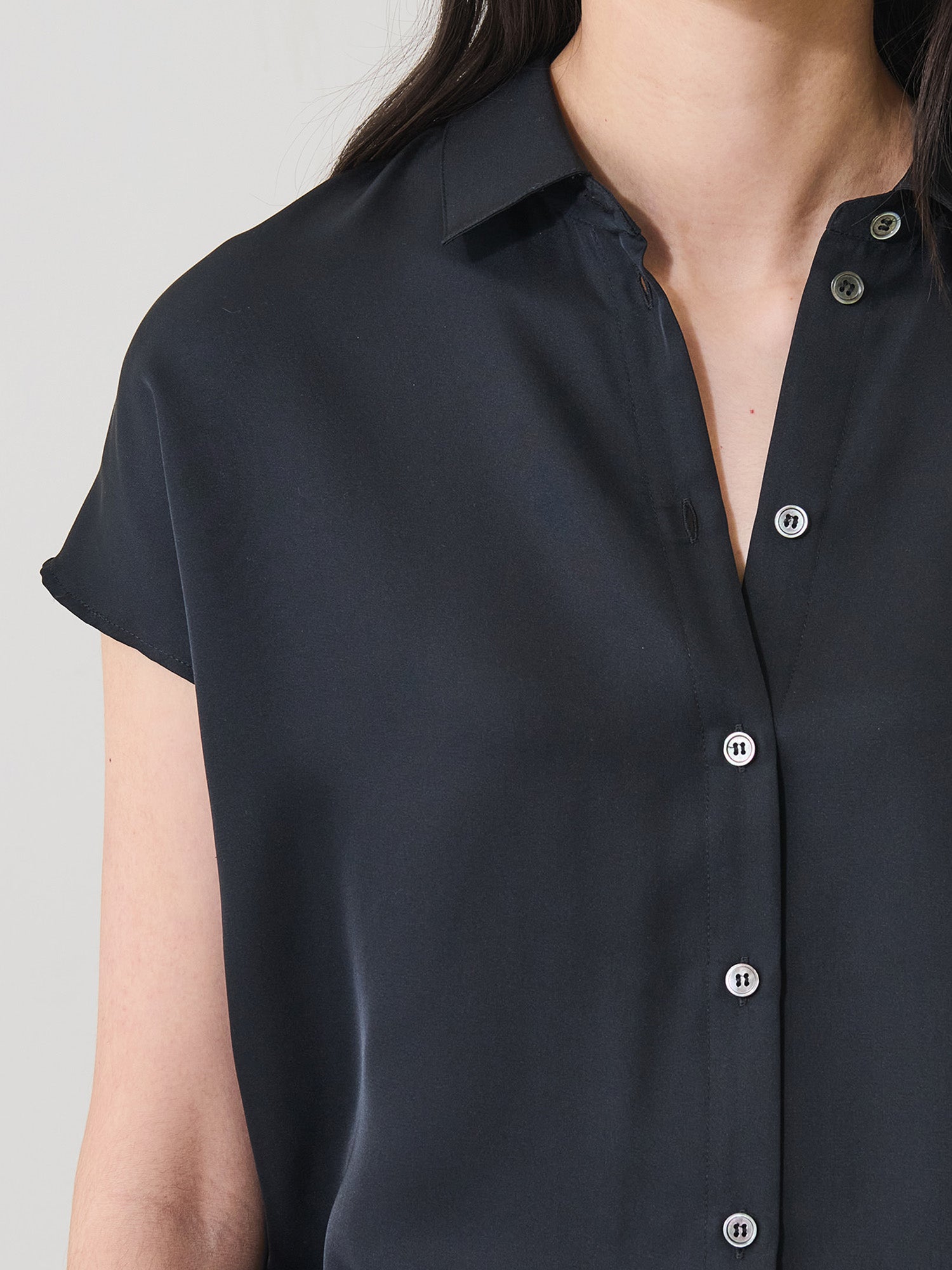 Our dolman button front shirt is crafted from a premium 100% silk fabrication. Cut in a flattering relaxed fit, this specialty piece features a dolman sleeve, curved hemline and mother of pearl buttons.