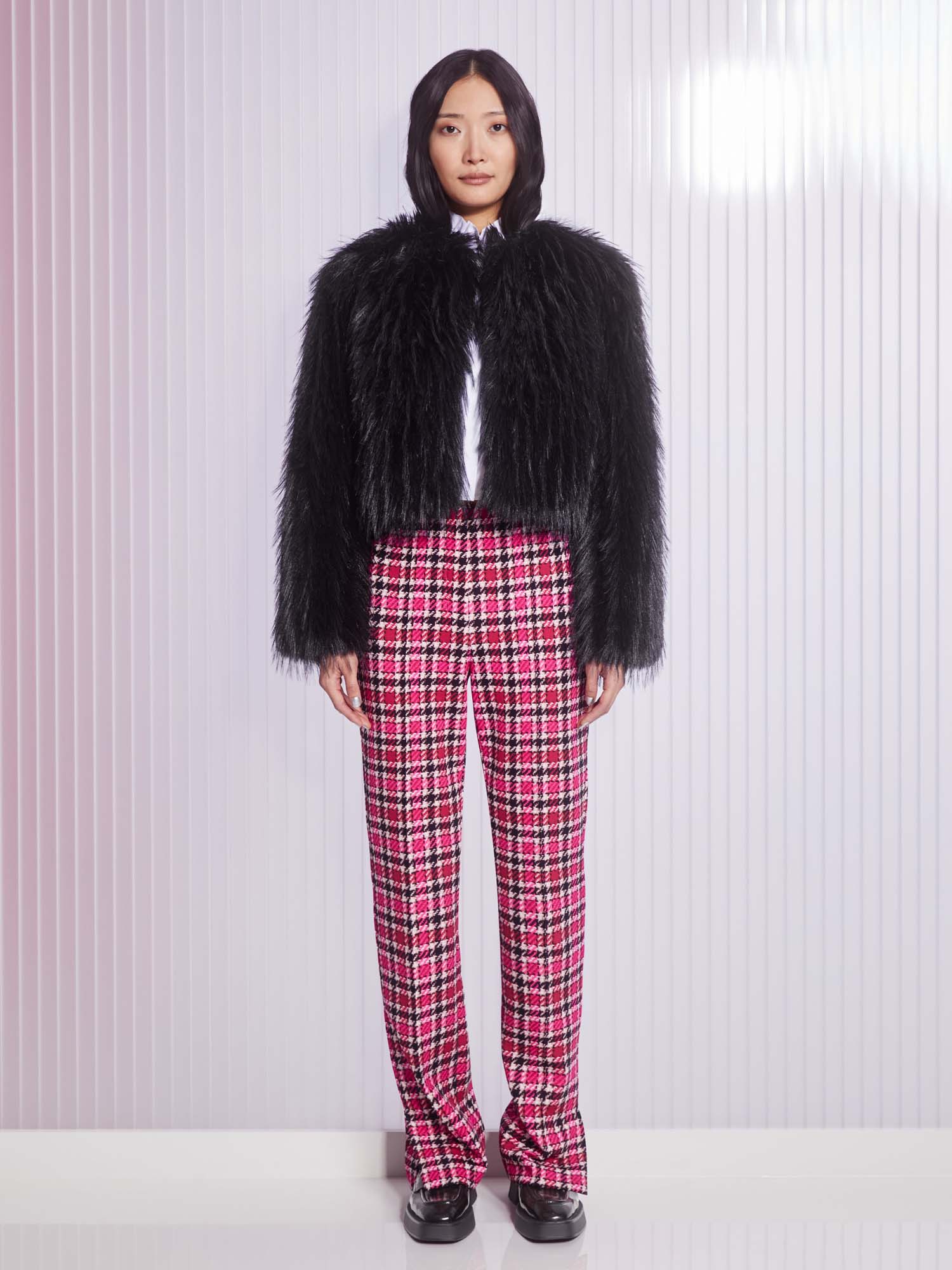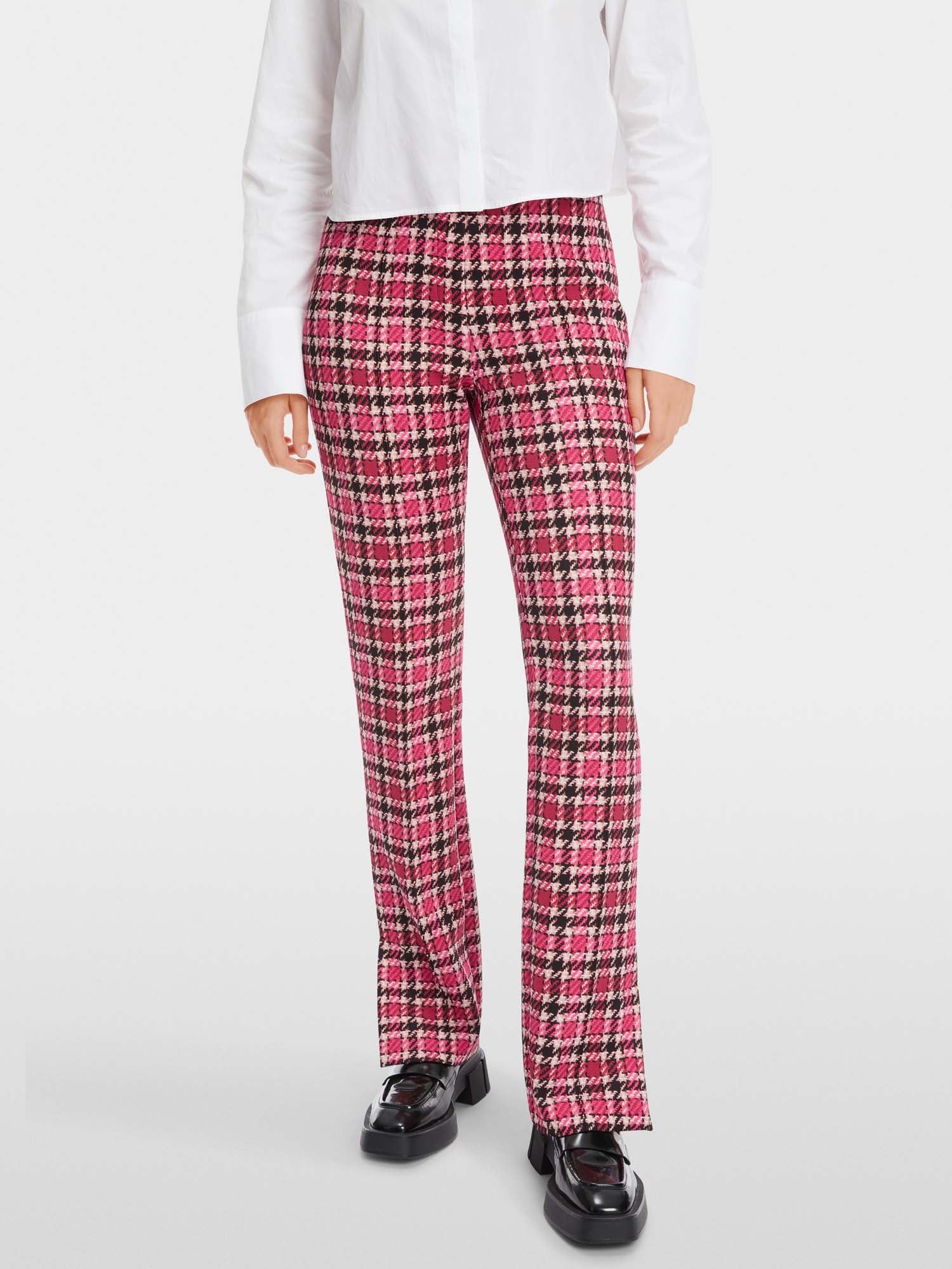The FATSA are a feminine cut pair of slip-on trousers made from soft, super-stretchy fabric. They have an elasticated waistband on the inside and a straight leg with a topstitched crease and hem slit.