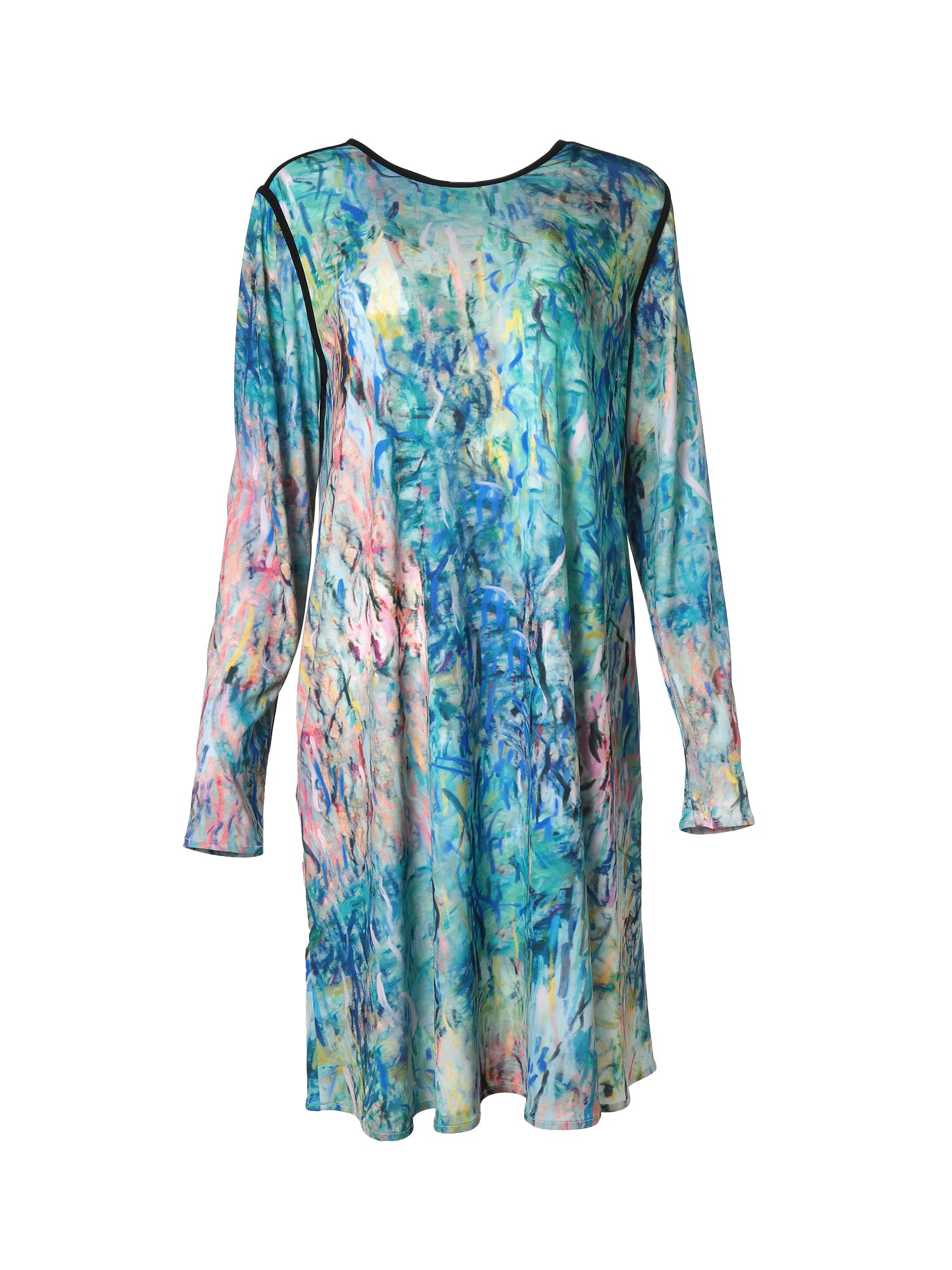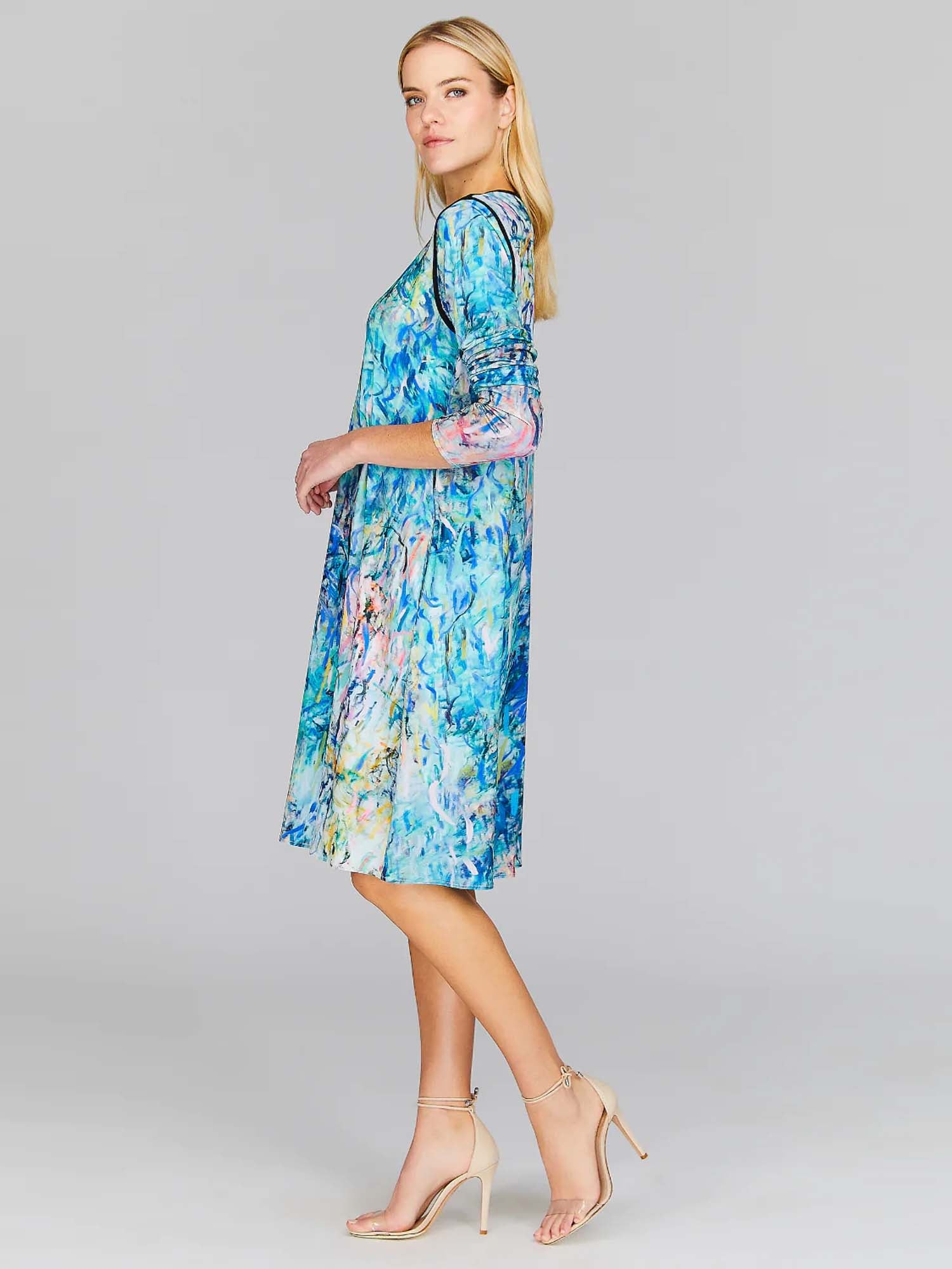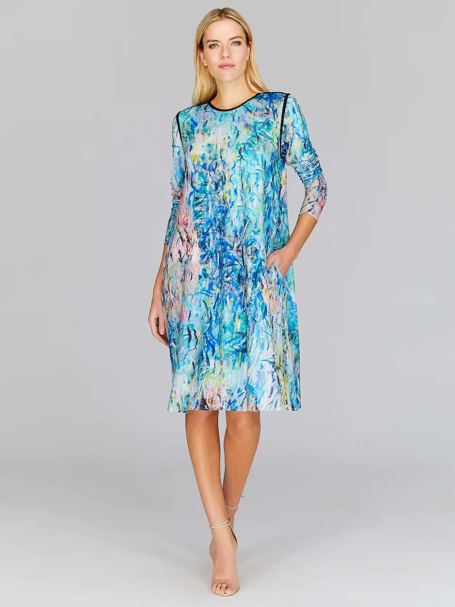 An effortless swing dress cut in a soft printed jersey. Elevated with black piping along the neckline, shoulder, and armholes, this dress is an easy option for every day, travel, and beyond. It is finished with a back zipper closure and side pockets.
