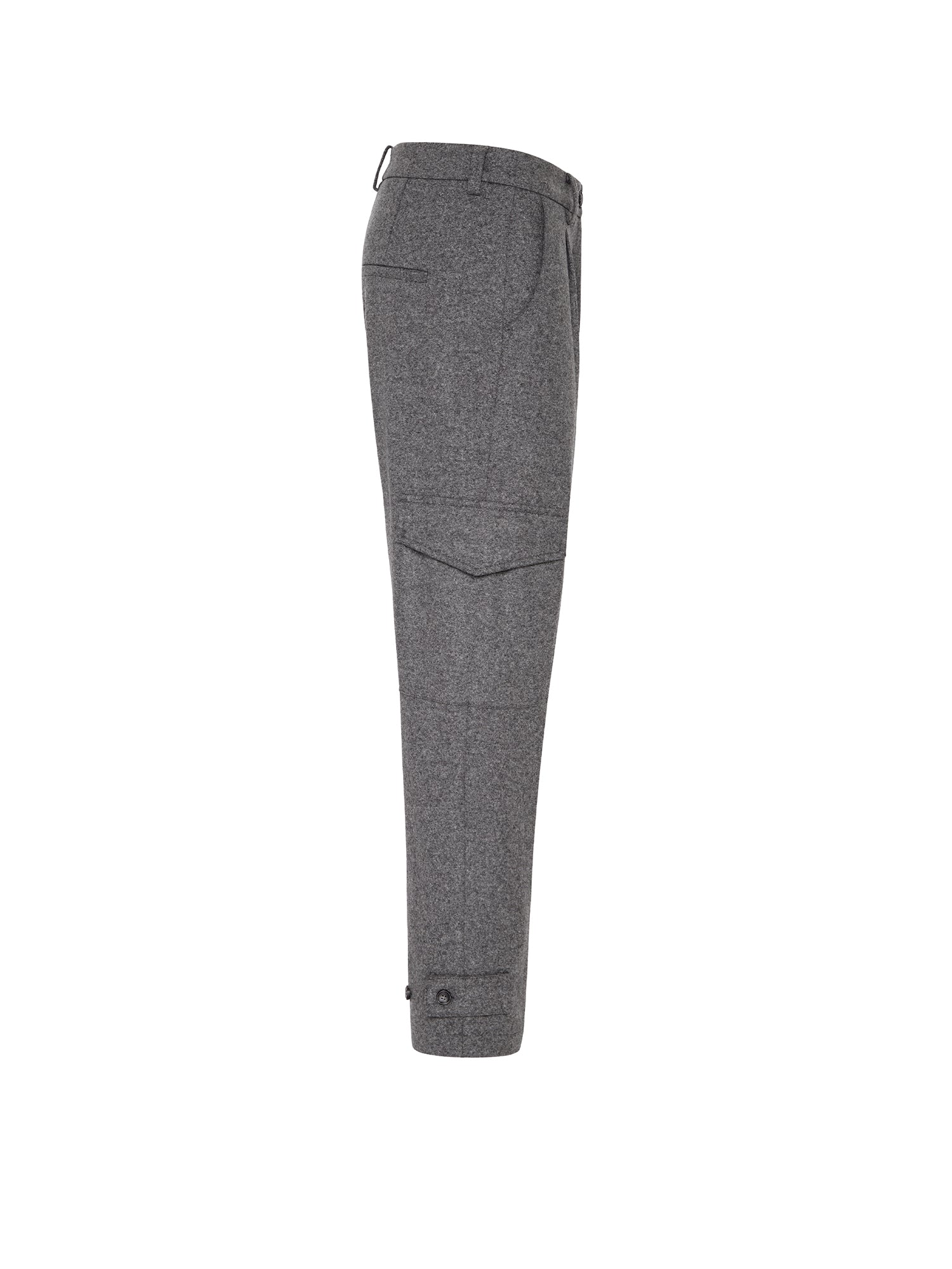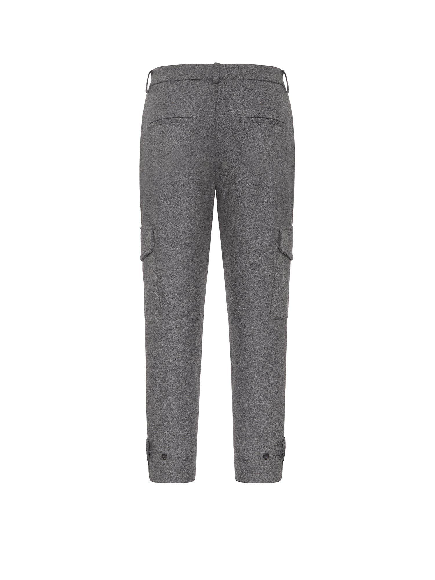 Felted flannel look jersey single pleat ankle pants with tab hem and cargo details. Tapered leg. Mid-rise.