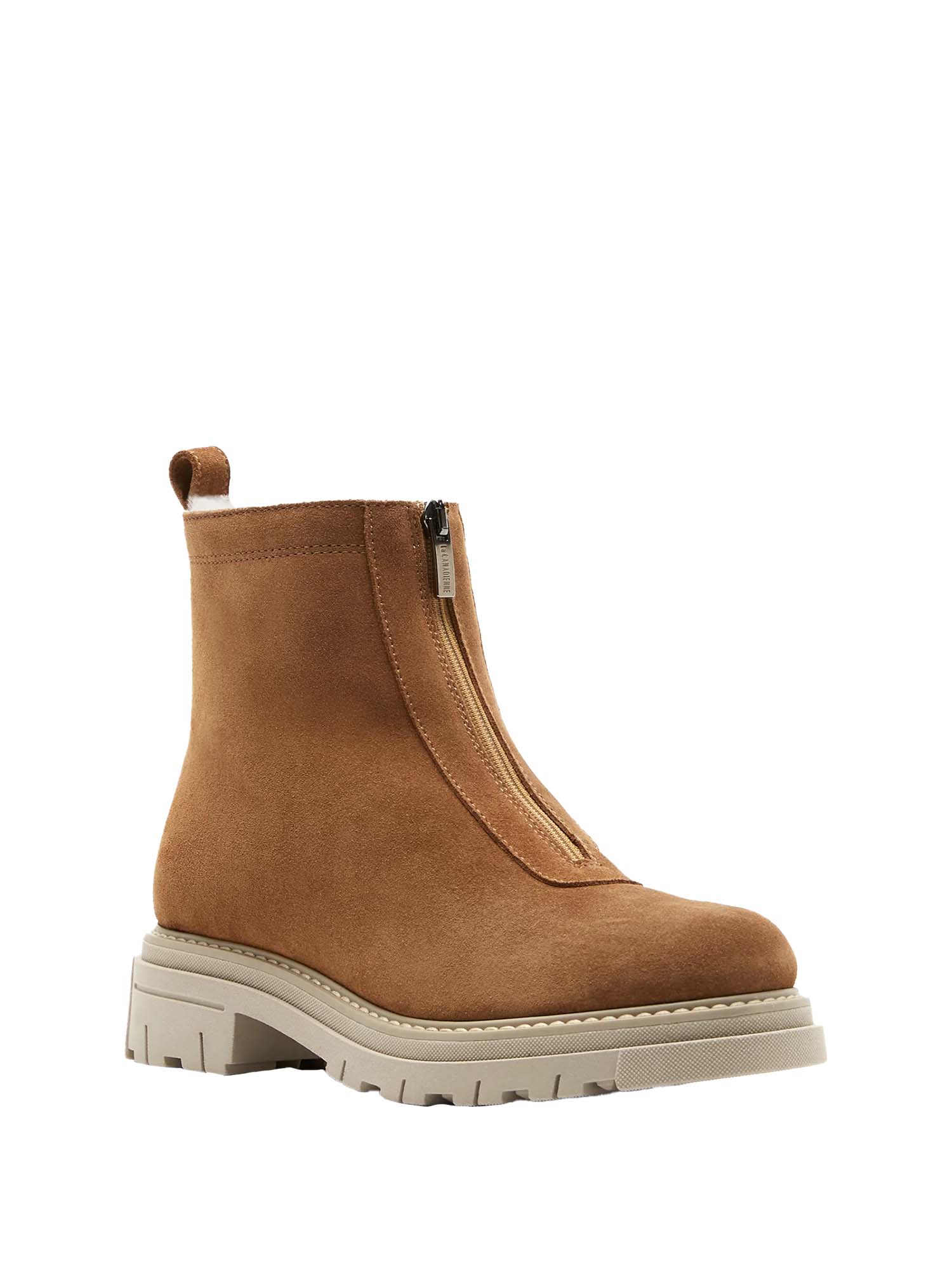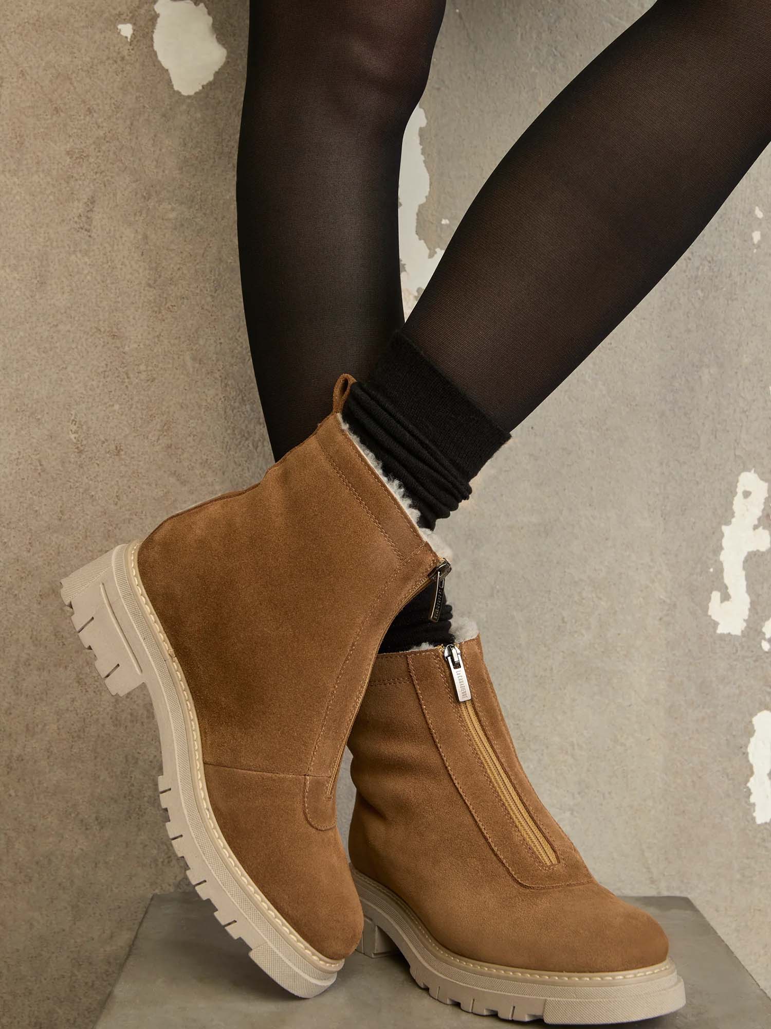 Lined with genuine shearling to the toe, this suede bootie features a rounded toe and a front zipper for easy on-and-off wear.