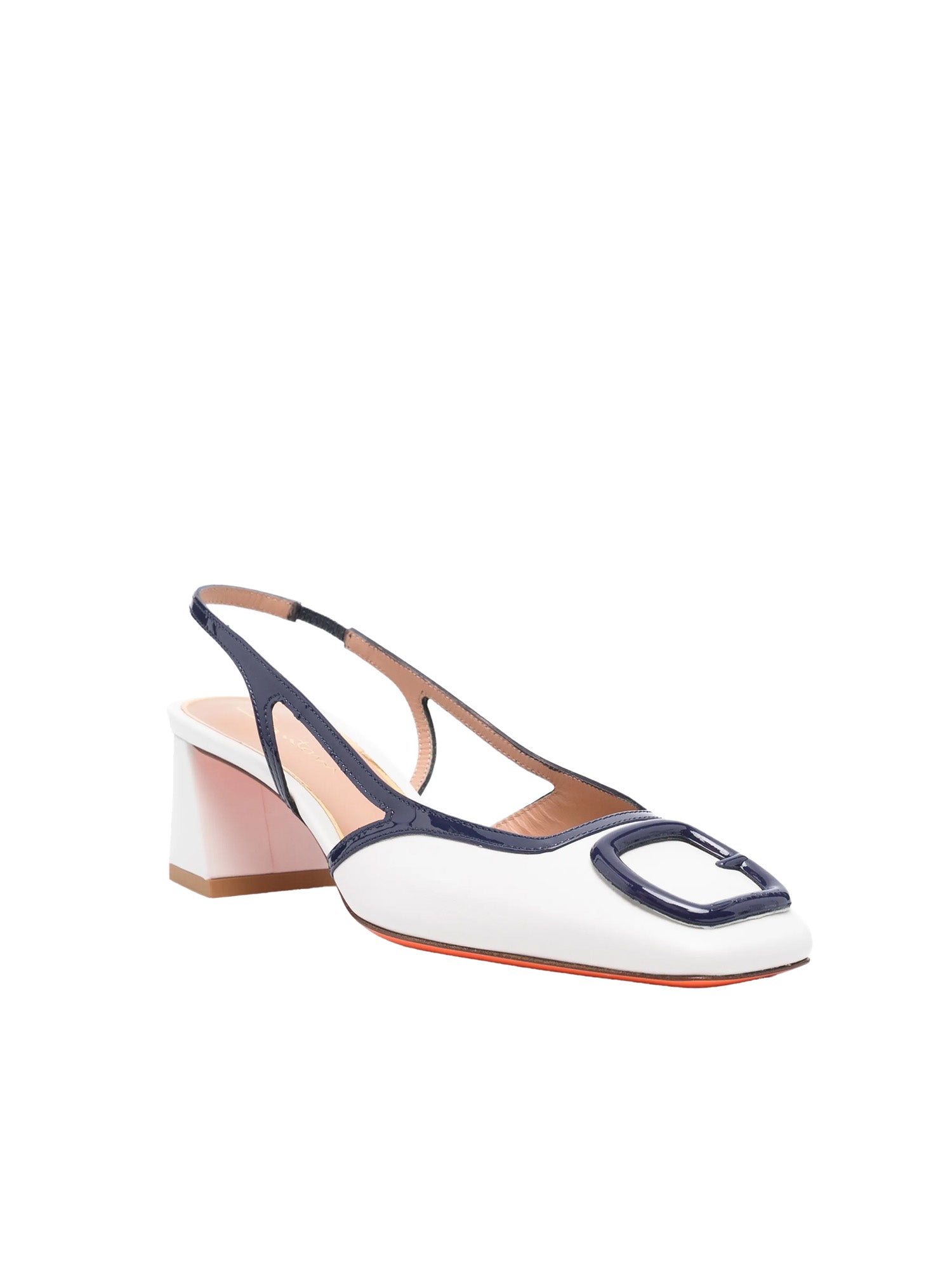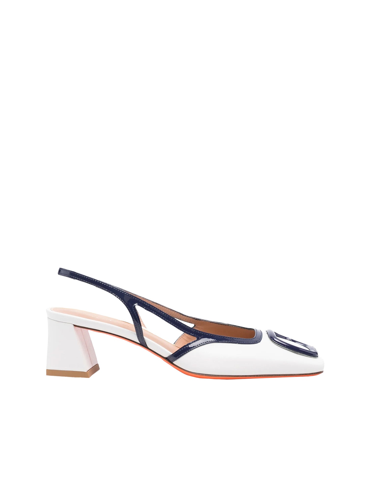 White slingback pumps crafted in Italy from smooth calf leather. A modern square toe and refined strap detail create a clean, elevated look, complete with a protective dust bag for lasting care.