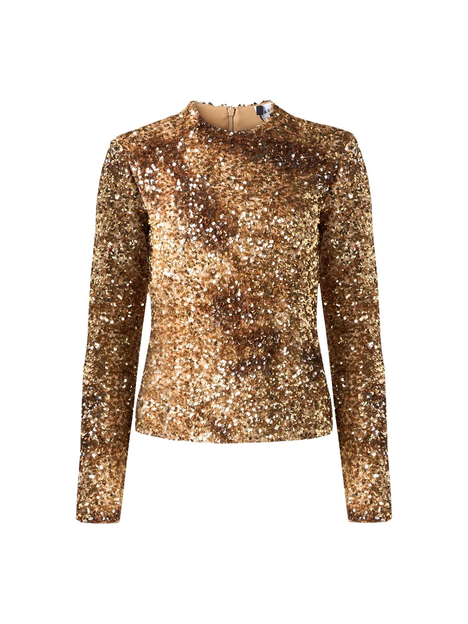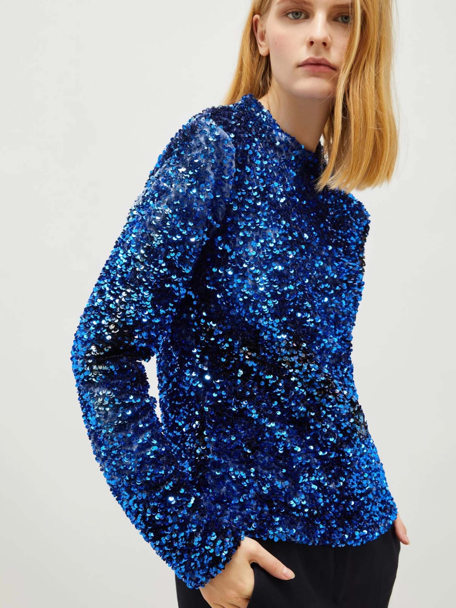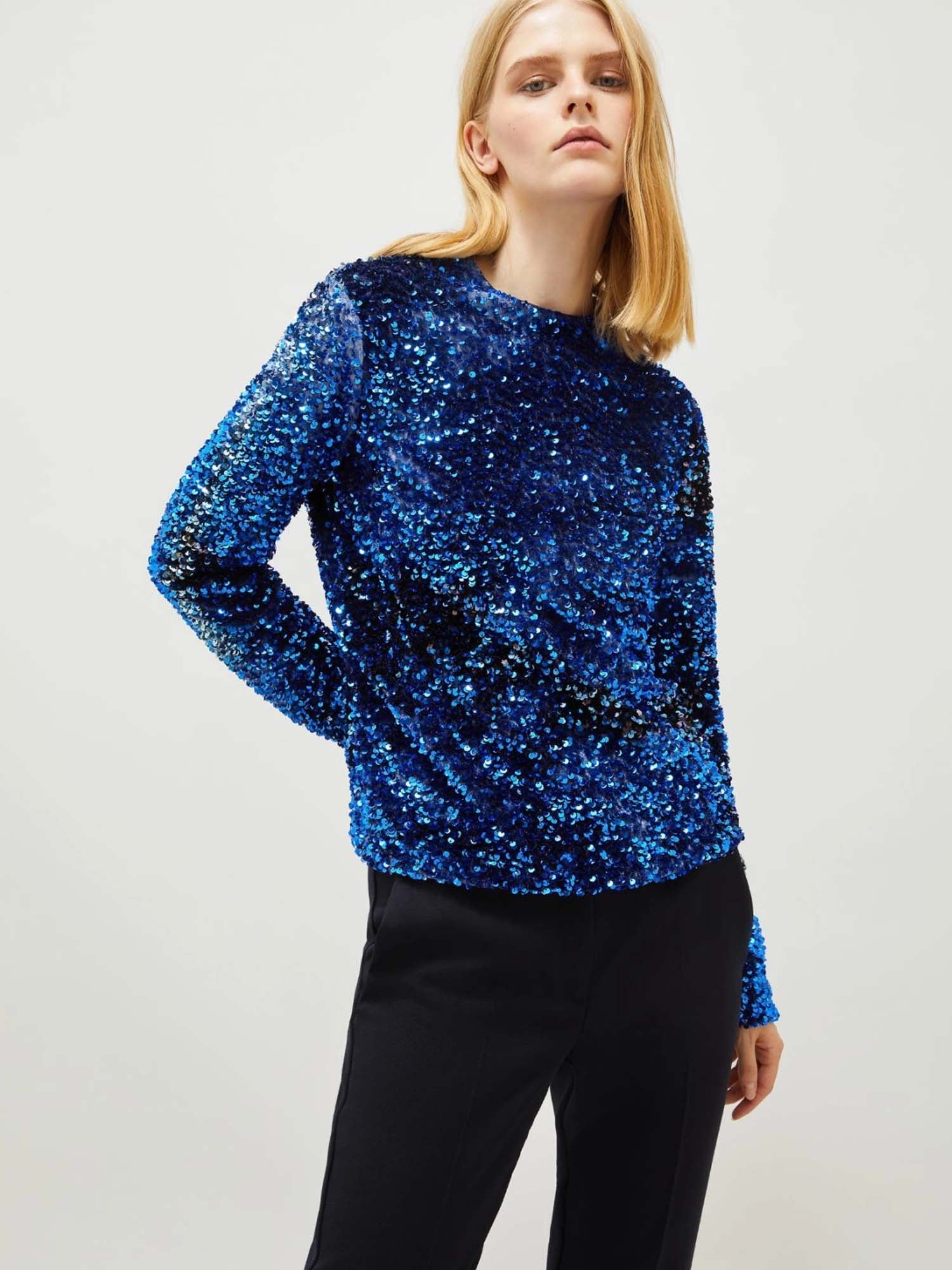 A mass of textures and gleams: this pencil skirt combines the luxurious allure of chenille with all-over shiny sequin detail, This very ‘80s blouse in chenille and sequin fabric boasts contrasting details with a metropolitan flair. The starting point for high-impact looks; pair with the matching skirt or your favourite jeans.