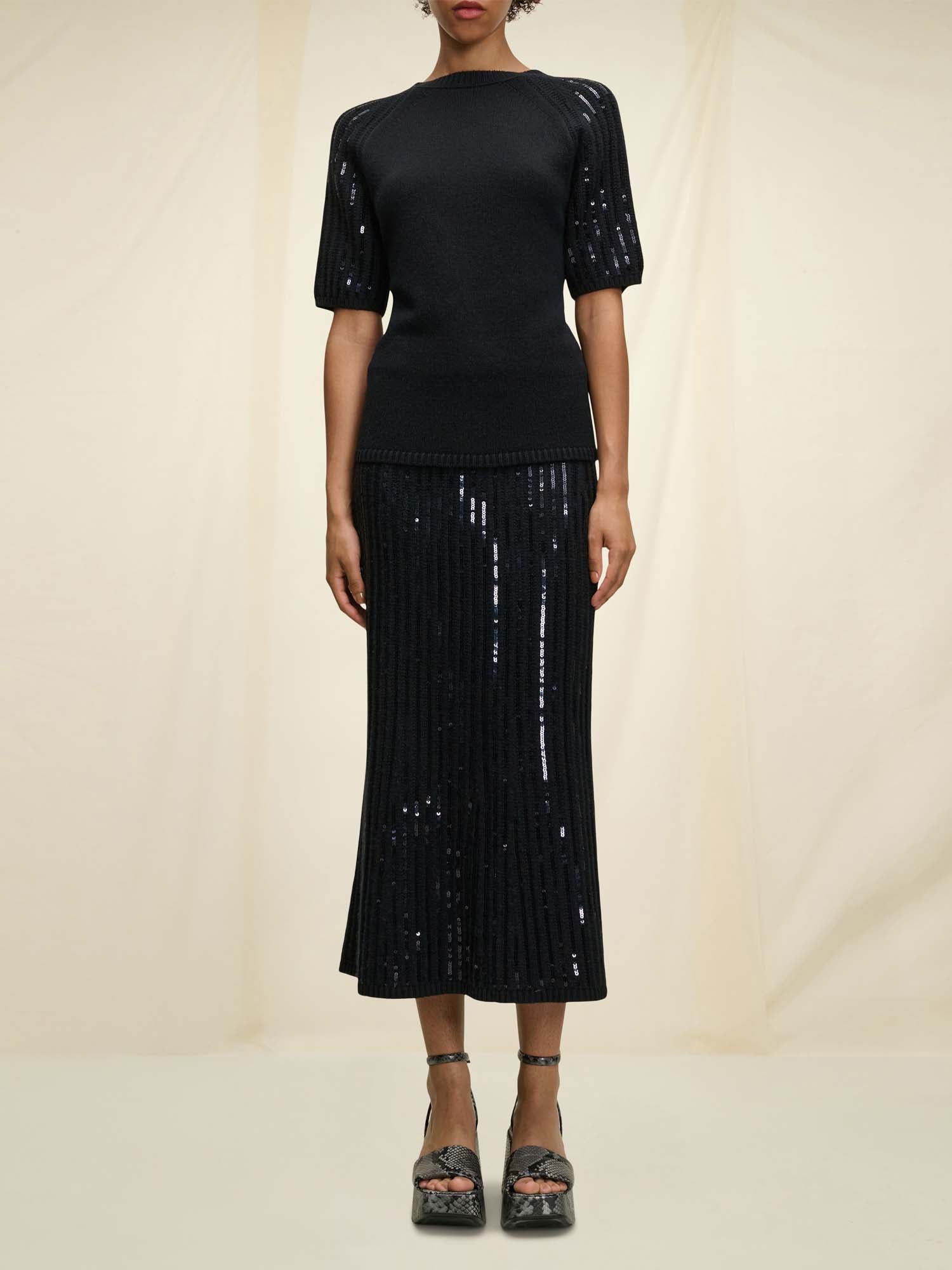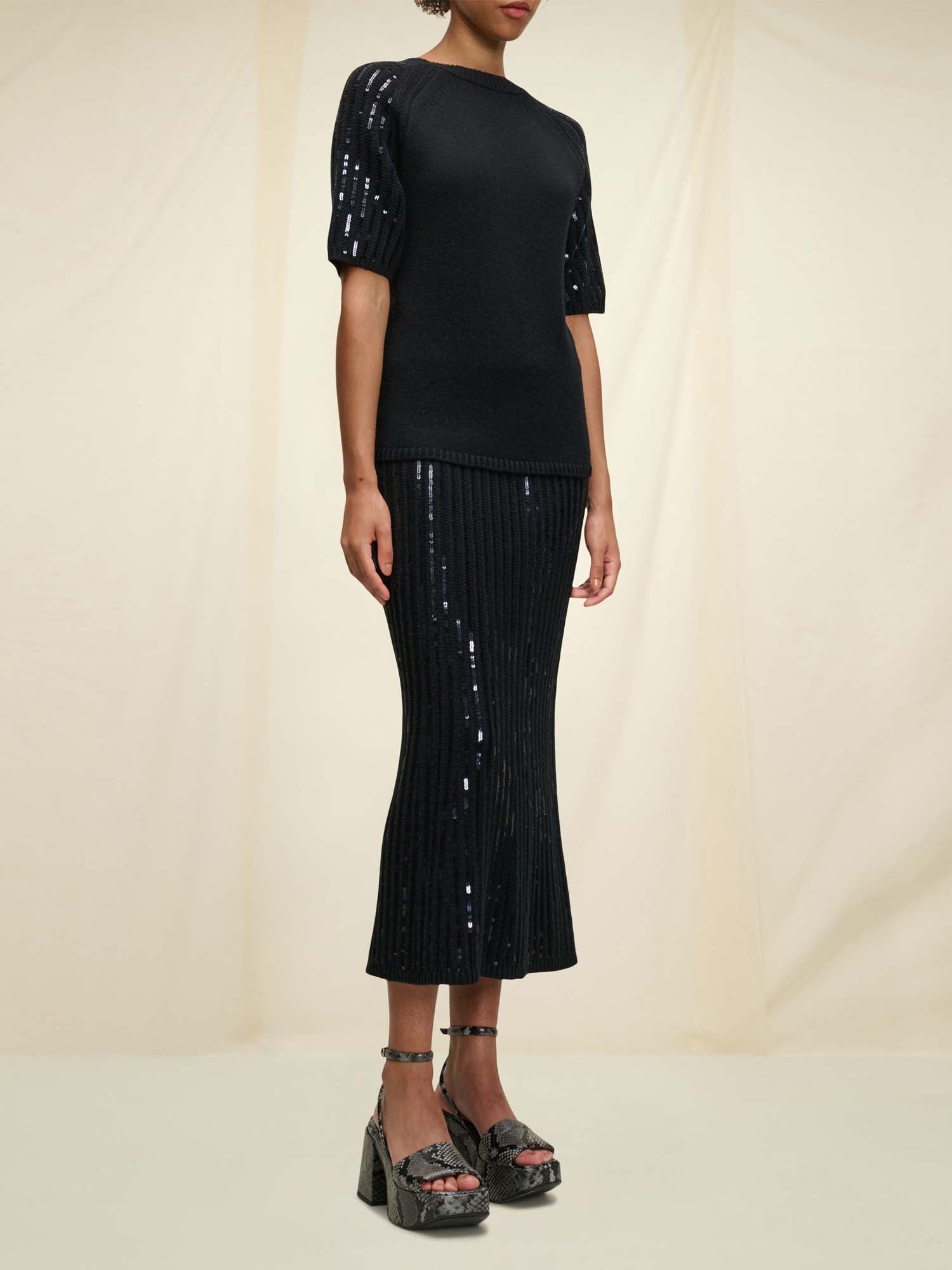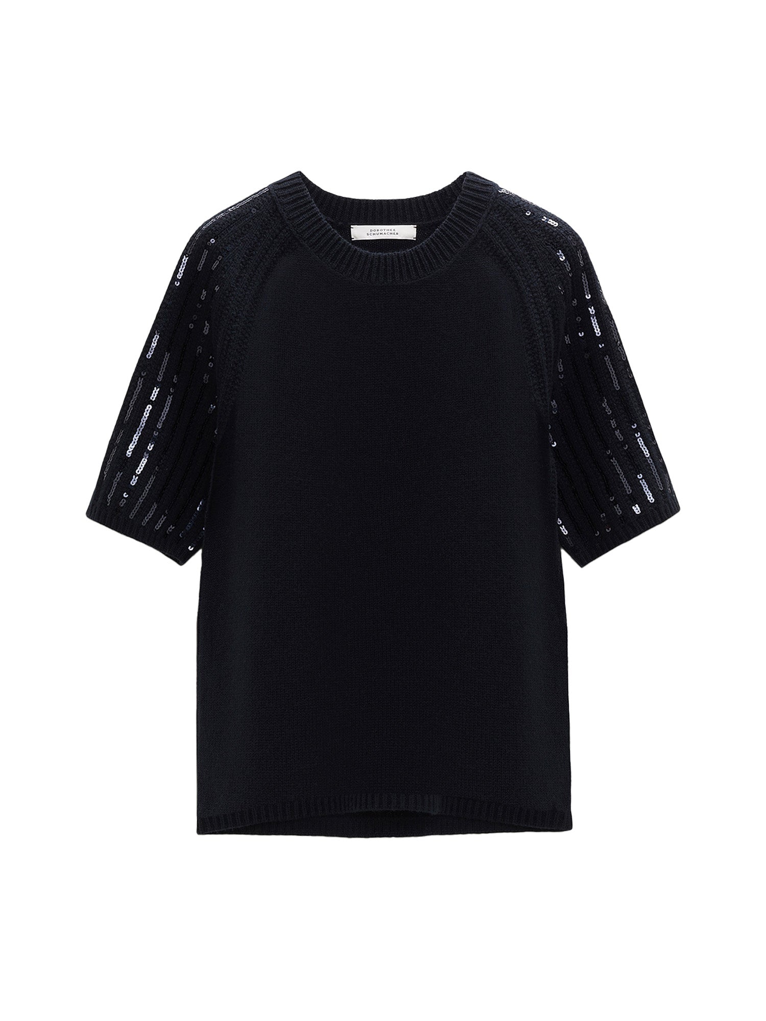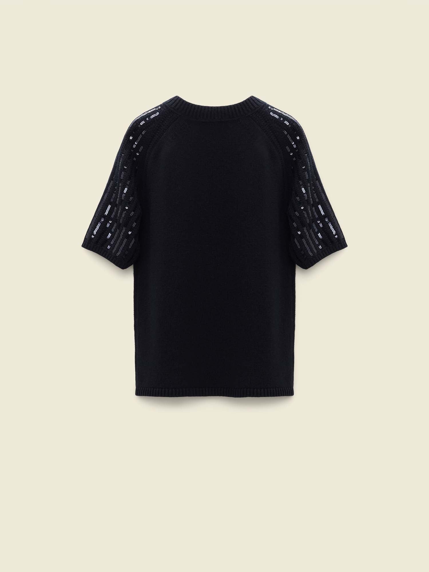 The sweater made of merino and cashmere is especially soft to the touch. The short sleeves are embellished with rows of sequins.