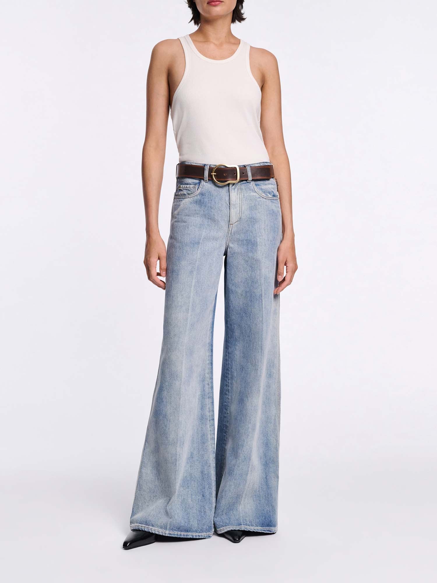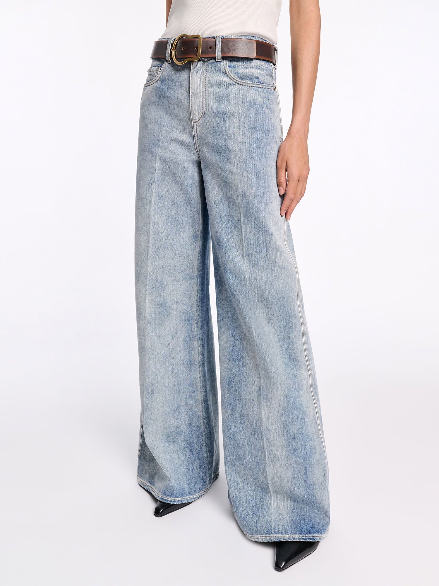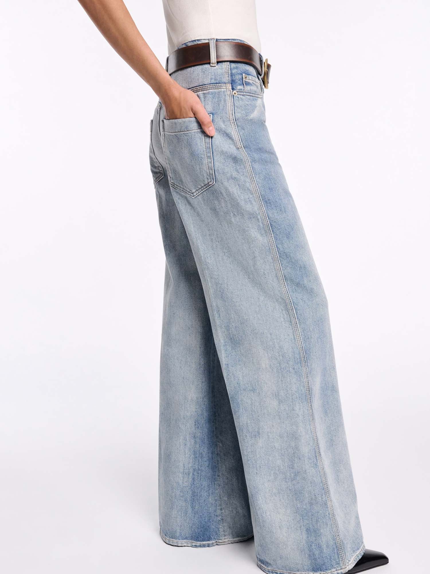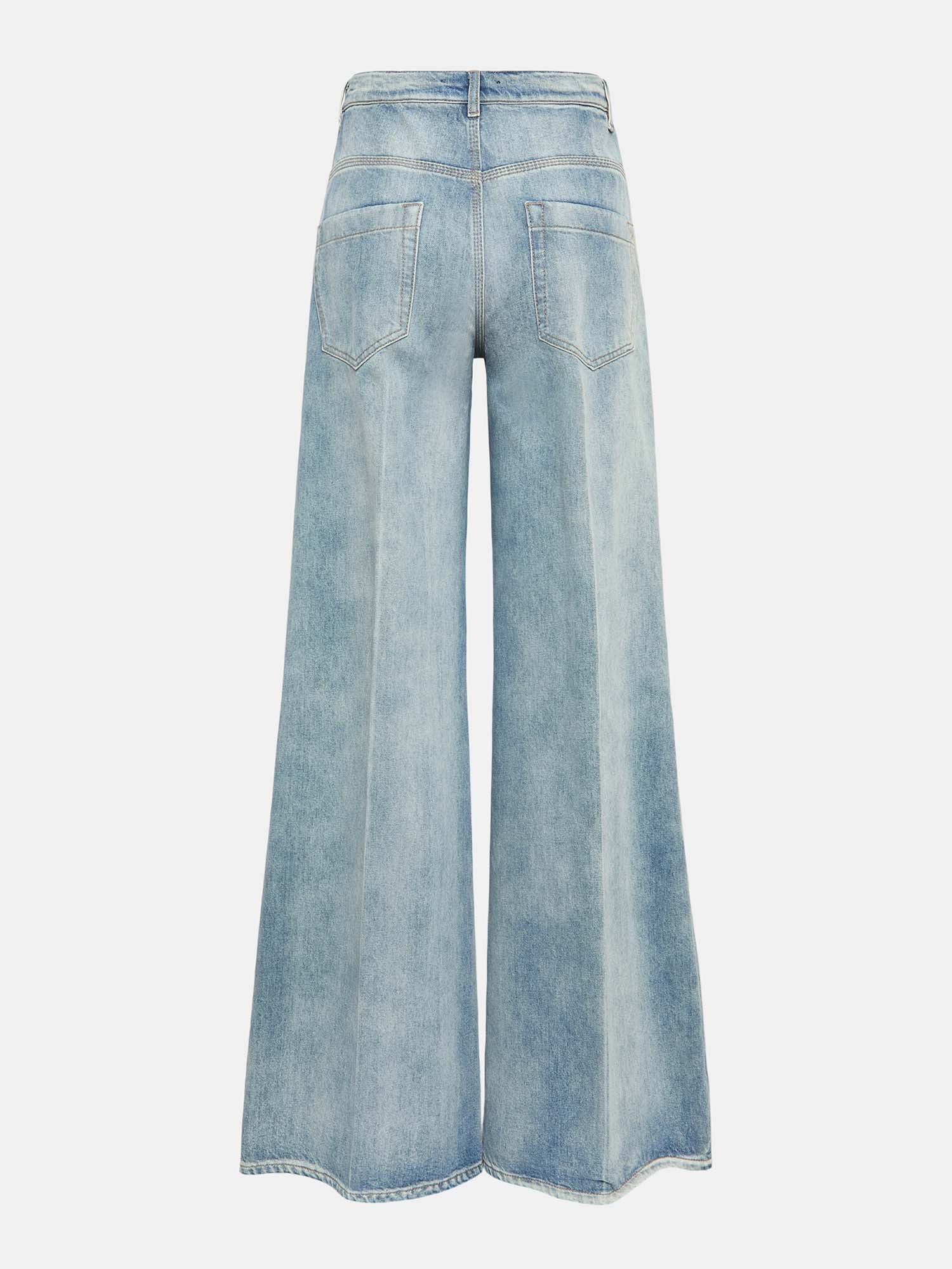 The mid-rise jeans are styled in our cloudy wash and have a wide leg. The relaxed 5-pocket style has a full length leg.