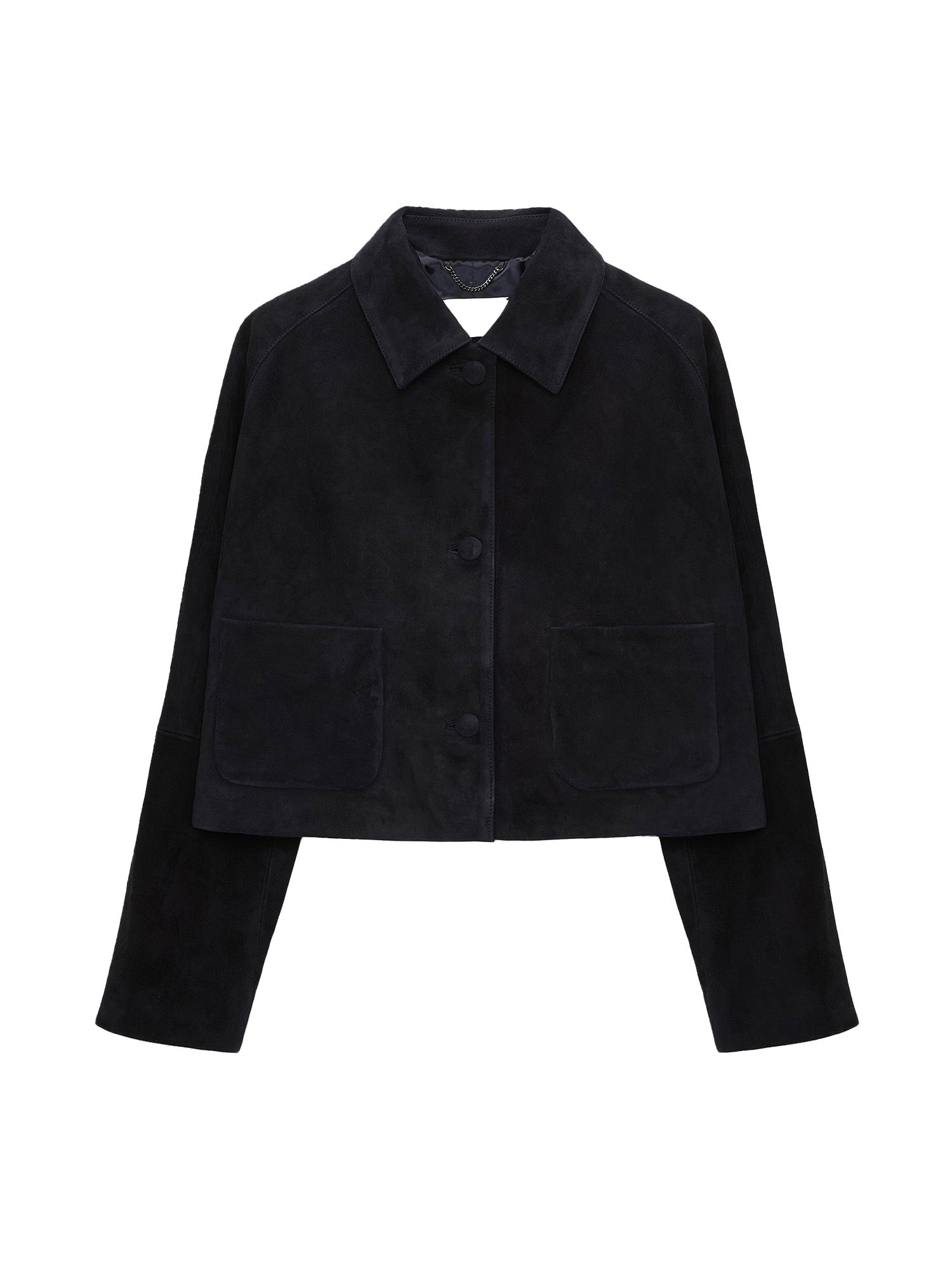 The jacket is finished in soft suede and has a slightly oversized silhouette. The jacket has a classic collar, patch pockets and raglan sleeves.